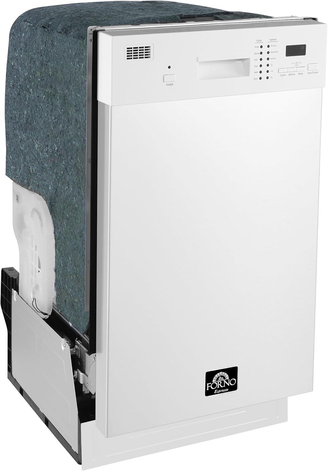 The FORNO Polo white dishwasher is ideal for those with limited kitchen space. Its 18-inch width allows for seamless integration into tight areas without compromising cleaning power. This dishwasher boasts 6 wash cycles to tackle various cleaning needs, from heavily soiled pots and pans to delicate glassware. The durable stainless steel tub ensures long-lasting performance and can handle even the toughest cleaning jobs. Fold-down tines in the racks provide flexibility for loading dishes of various shapes and sizes. The dishwasher features a user-friendly push-button control panel at the front for easy cycle selection. Plus, a 24-hour delay start option allows you to set the dishwasher to run whenever it's most convenient. The unique three-module silverware basket offers maximum customization. Arrange it to fit your needs, whether in the upper or lower rack, for efficient silverware organization. The bottom rack boasts 11 inches of clearance, making it easy to load large plates, bowls, and cookware. The FORNO Polo dishwasher is an excellent option for those seeking a high-quality, space-saving dishwasher at an affordable price. Features: Product Type: Built-In Panel Ready: NoColor/Finish: WhiteHandle Type: Pocket HandlePrimary Material: SteelLeveling Legs: YesTub Material: Stainless SteelNumber of Cycles: 6Type of Cycles: Heavy, Normal, ECO, Glass, Rapid, RinseTypes of Options: Hi temp, Heated dry, SanitizeDelay Wash: Yes Low Rinse Aid Indicator: 1-24 HoursSplitable Silverware Basket: YesRemovable Silverware Basket: YesStemware Glass Holder: Yes Third Rack: Yes Target Spray Option: Yes Interior Light: NoNumber of Wash Arms: 8Filter Material: Lower RacksFilter Trap: Nylon Coated SteelHard Food Dispenser: Yes Control Style: 4 Piece SplittableDrain Hose: 2Hard food Disposer: Removable