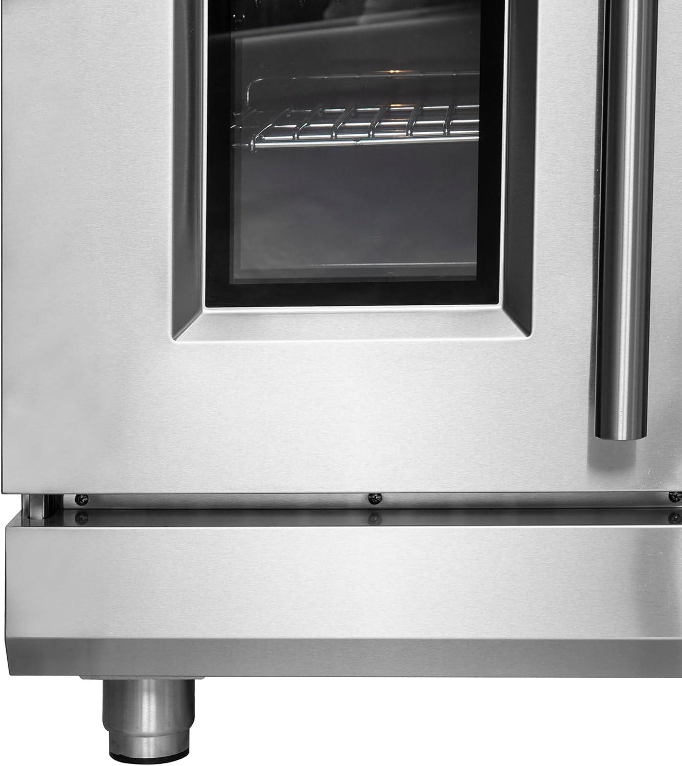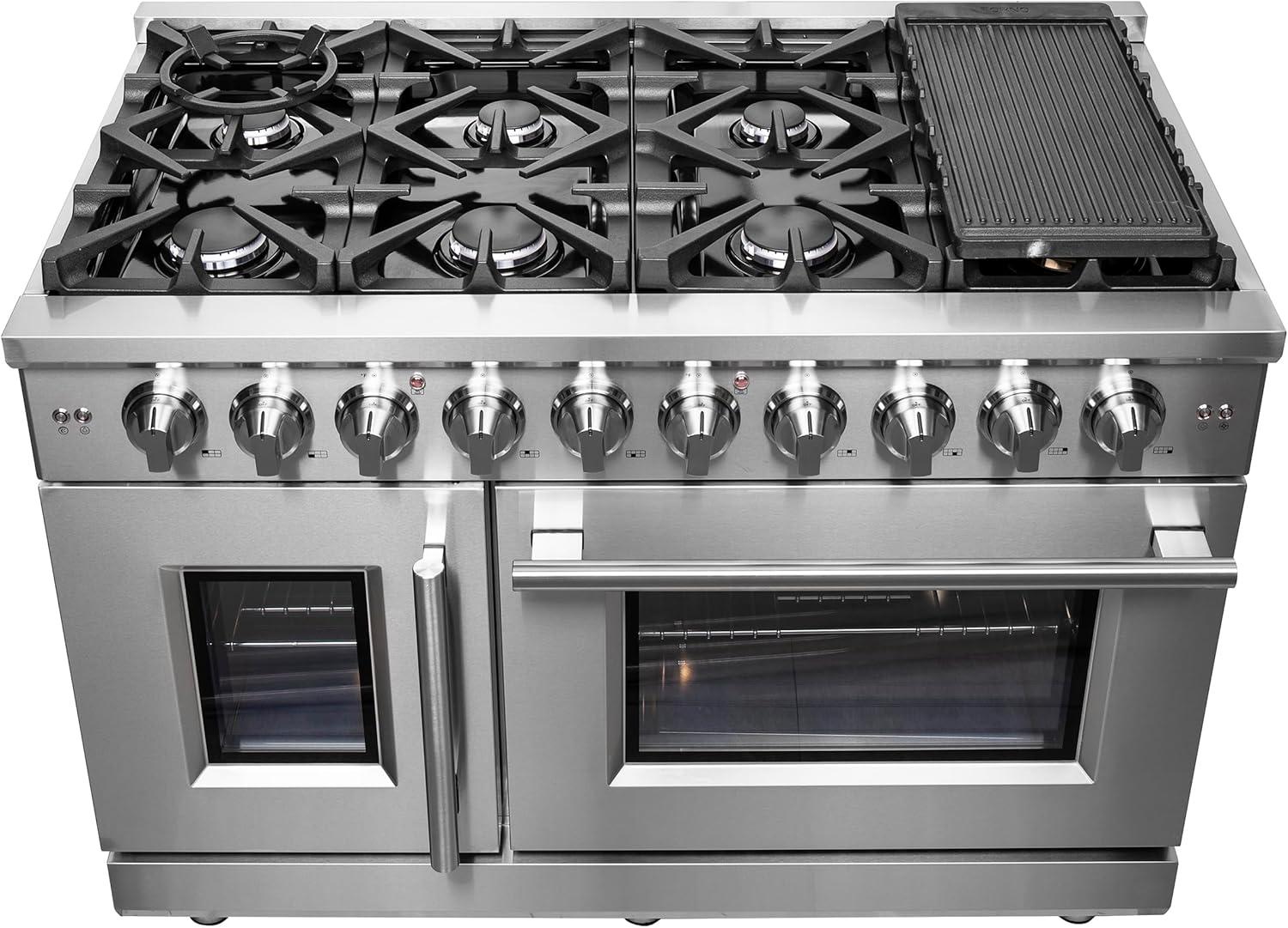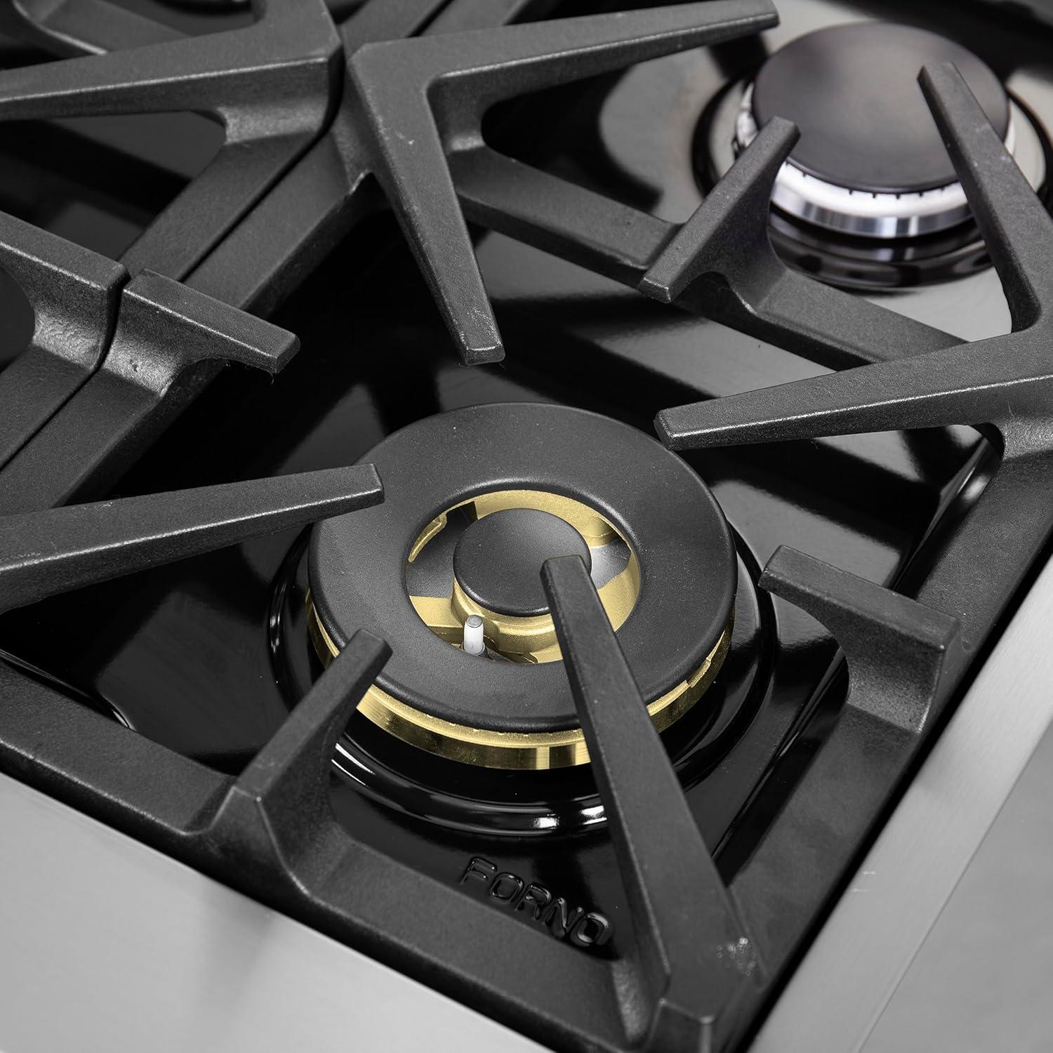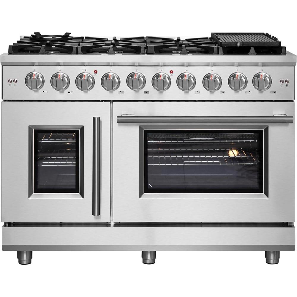 Elevate your culinary experience with the Forno 48-inch French Door Gas Range, a kitchen masterpiece offering unparalleled versatility. Boasting a Sealed Dual-Ring Brass Burner (20K BTU) for precise control from high-heat searing to delicate simmering, and an additional 8 sealed burners totaling 107,000 BTU, this range delivers comprehensive stove-top capabilities. The dual ovens, featuring a 4.32 Cu.Ft Convection Fan Oven (30,000 BTU) and an extra 2.26 Cu.Ft. Oven (14,000 BTU Bake output), provide flexibility for simultaneous cooking. With an intuitive left swing door for easy one-handed access, pro-style handles, illuminated zinc-coated metal control knobs, and a complete package including telescopic oven racks, air fryer basket, and LP conversion kit, the Forno 48-inch range blends sophisticated design with practical functionality for a superior kitchen experience.