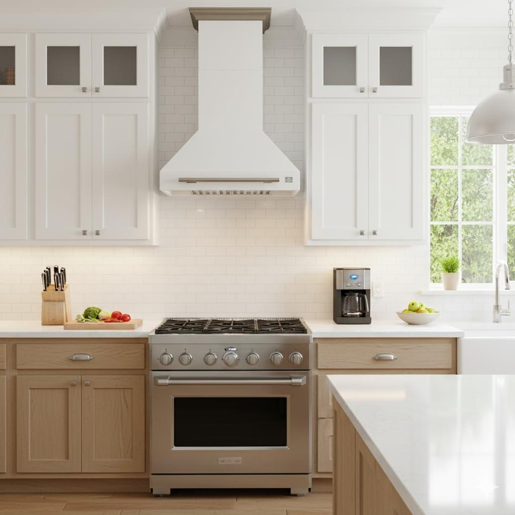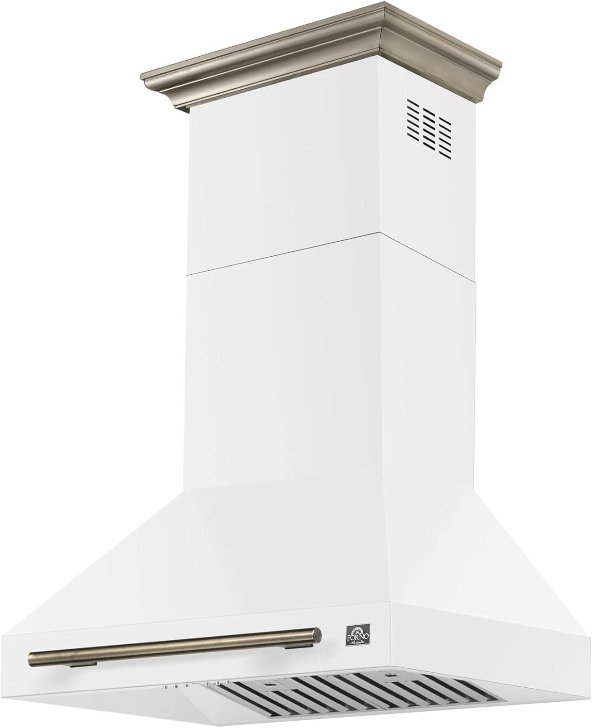 FORNO Aria 30″ 600 CFM Convertible Wall Mount Range Hood, White Finish with Antique Brass Accents – LED Lighting, Push Button Controls, Dishwasher-Safe Baffle Filters, Quiet Motor – FRHWM5095-30WHT