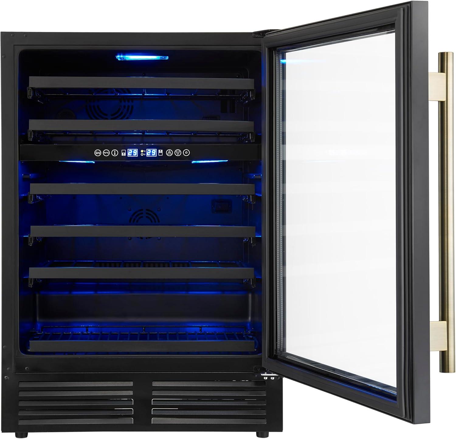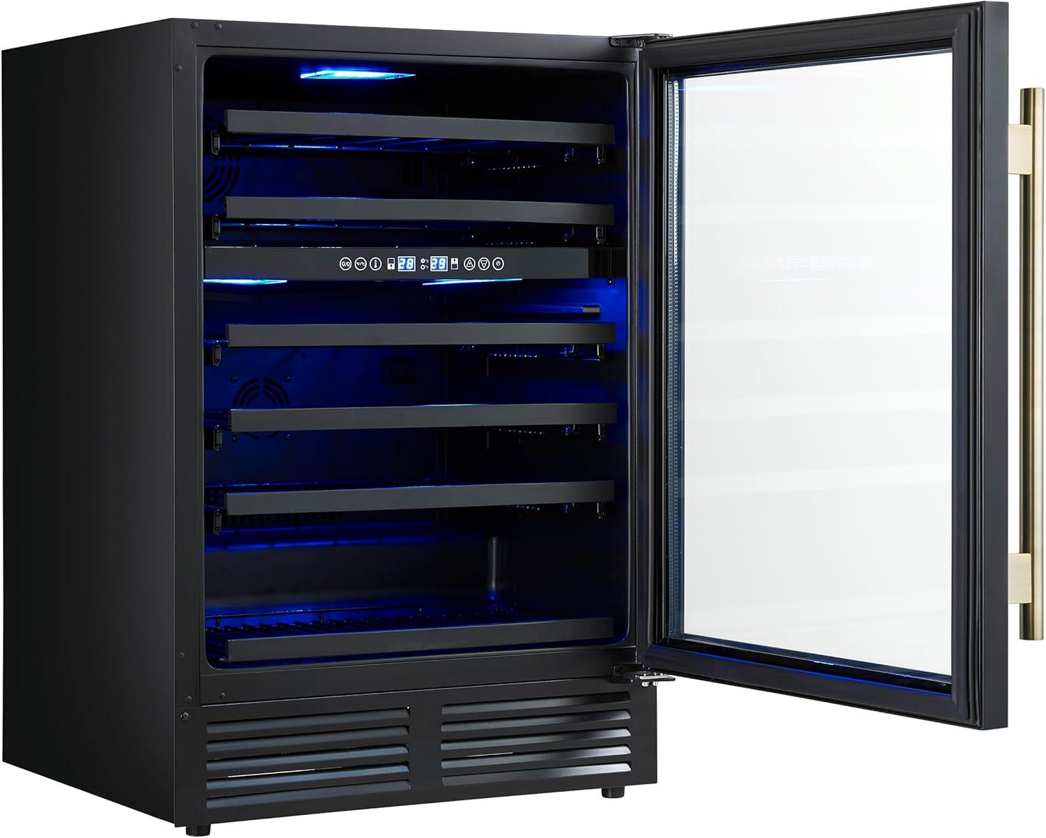 Forno Bacchino 24 Inch Wine Cooler with Antique Brass Handles, 51 Bottle Capacity Beverage Refrigerator with Triple Glass Door and LED Lighting, Built-In or Freestanding – Black