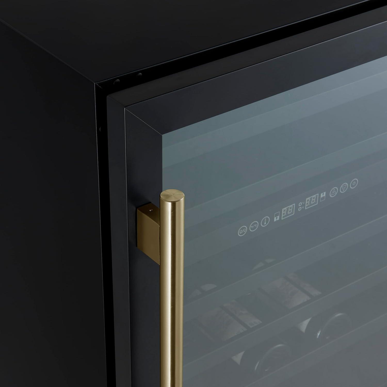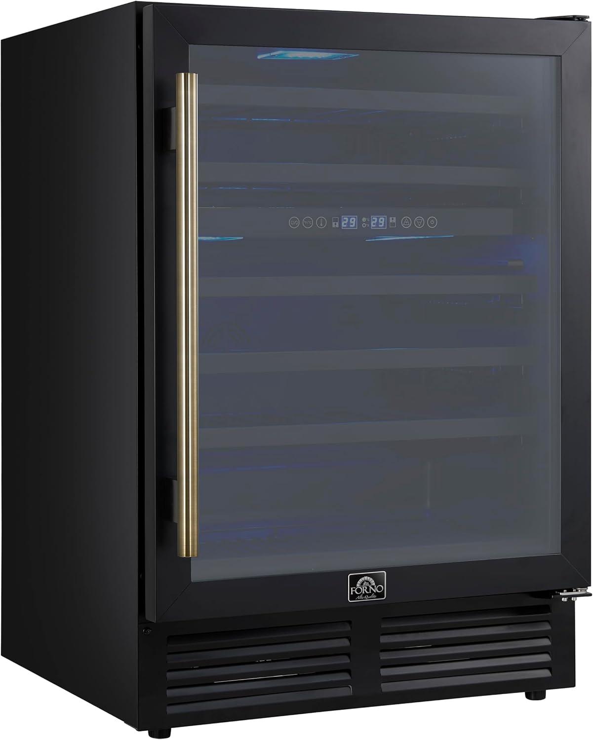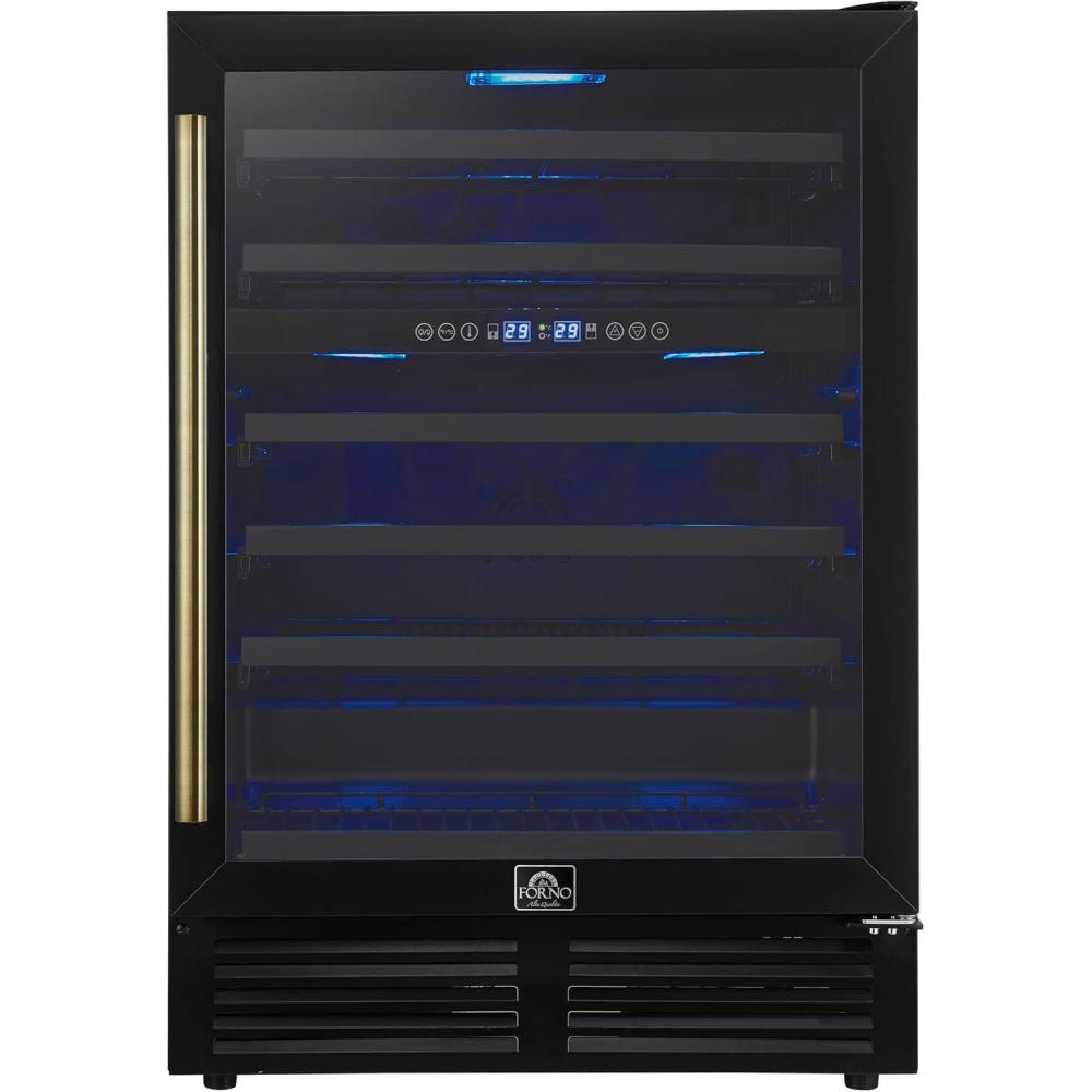 Forno Bacchino 24 Inch Wine Cooler with Antique Brass Handles, 51 Bottle Capacity Beverage Refrigerator with Triple Glass Door and LED Lighting, Built-In or Freestanding - Black