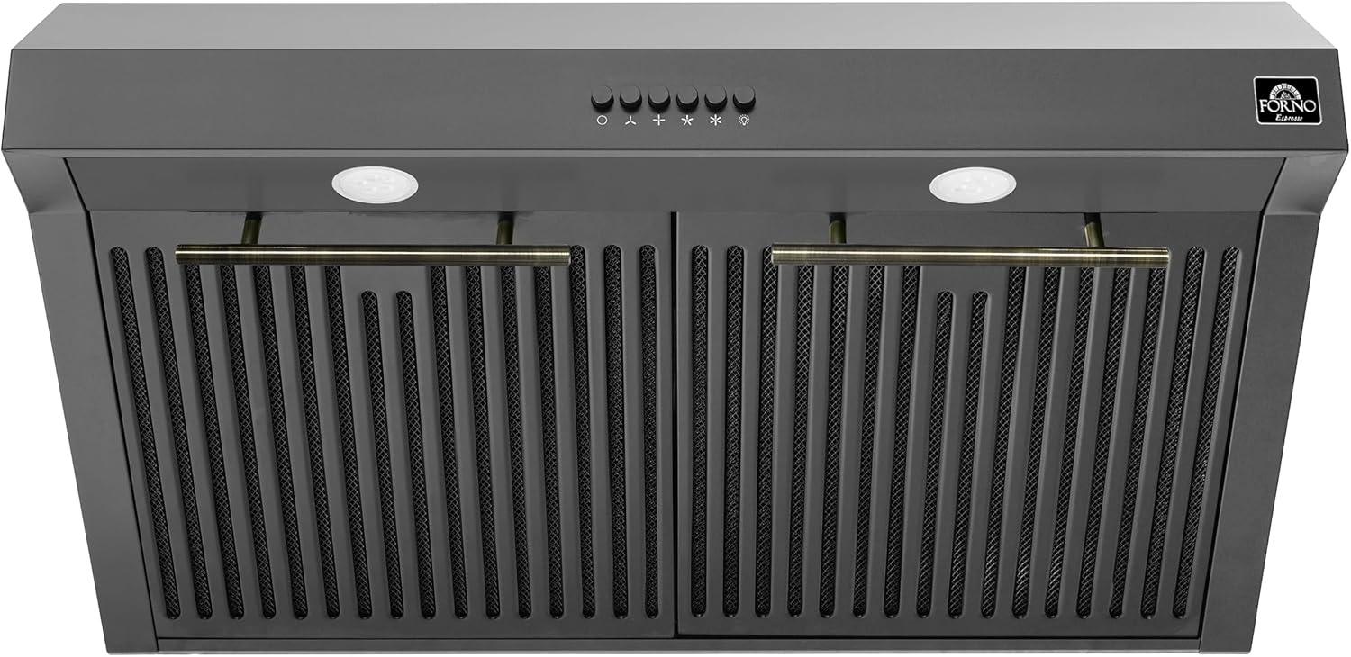 The Bari Espresso 30″ Under Cabinet Range Hood is a versatile and efficient addition to your kitchen. With a commercial-inclined design, this hood not only captures grease and odors effectively but also provides a customizable aesthetic with two sets of handles in Stainless Steel and Antique Brass. Powered by a quiet yet powerful squirrel cage 4-speed AC motor, it delivers a maximum airflow of 400 for precise ventilation tailored to your cooking needs. The 4-speed push-button control ensures easy operation, while the hybrid filters contribute to longer-lasting performance with minimal maintenance. Two LED surface lights illuminate your cooking area, combining energy efficiency with bright lighting, all achieved at a low noise level, making the Bari Espresso Range Hood a stylish and functional solution for a fresh and quiet kitchen atmosphere.