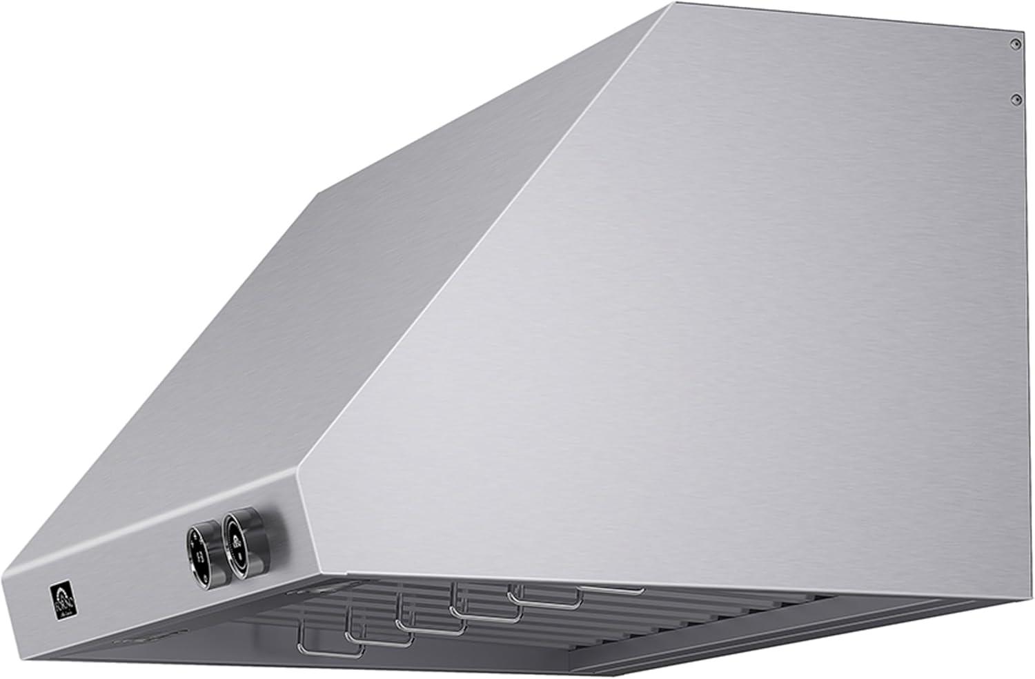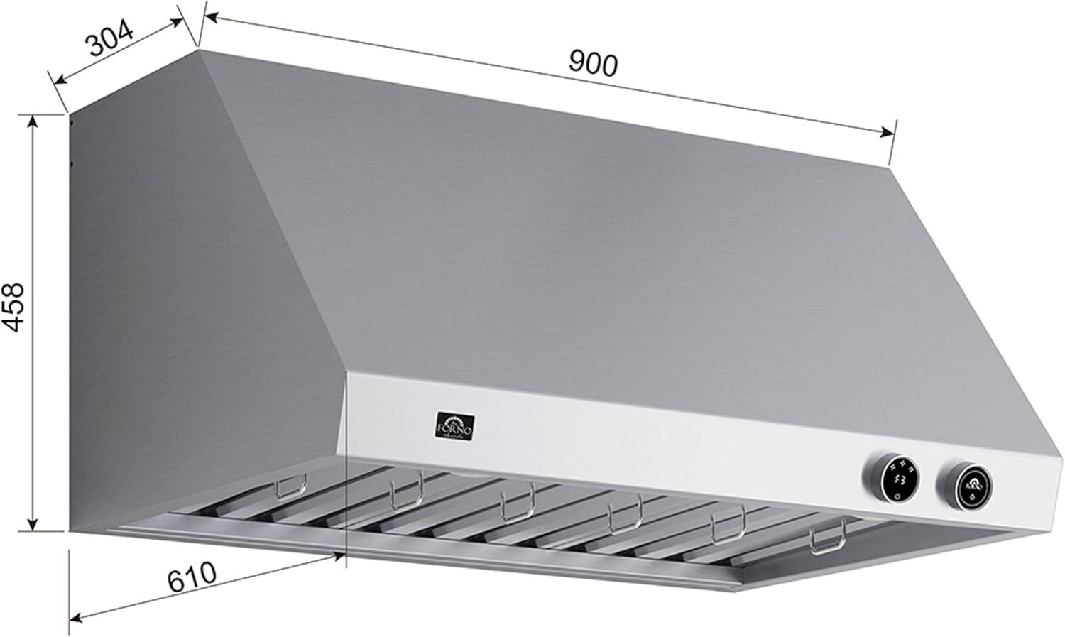 Elevate your kitchen’s performance and style with the FORNO Biagio 36″ Wall Mount Range Hood in Stainless Steel (FRHWM5009-36) — a perfect blend of powerful ventilation, elegant design, and quiet operation. Engineered for serious home chefs, this 600 CFM range hood efficiently eliminates smoke, steam, and cooking odors while maintaining a sleek, modern appearance that enhances any kitchen aesthetic. Crafted from premium stainless steel, the Biagio range hood features durable stainless-steel baffle filters that trap grease with precision and are dishwasher-safe for easy cleaning. Its 3-speed fan control allows you to tailor ventilation power to your cooking intensity, while the high-performance single motor delivers consistent suction with minimal noise — operating at just 52 to 63 dB for a peaceful cooking environment. Enjoy bright, clear illumination with dimmable LED lighting, providing optimal visibility over your cooktop for safe and accurate meal preparation. The ducted ventilation system ensures efficient air expulsion during heavy cooking, keeping your kitchen air fresh and comfortable. Whether preparing a quick breakfast or hosting a family dinner, this range hood combines quiet power with sophisticated design. Measuring 35.5″ W x 22″ D x 14.7″ H, the Biagio 36″ range hood offers flexible wall-mount or under-cabinet installation options to fit your space seamlessly. It operates on 120V/60Hz/15A power and connects to an 8″ round duct for optimal airflow. With a brushed stainless steel finish that complements the FORNO Galiano (FFSGS6244-36) gas range and other matching appliances like the FORNO Moena (FFRBI1820-36SB) refrigerator, this hood completes your high-end kitchen suite. Experience professional-grade ventilation, contemporary design, and dependable performance with the FORNO Biagio 36″ Range Hood (FRHWM5009-36) — where form meets function in every detail.