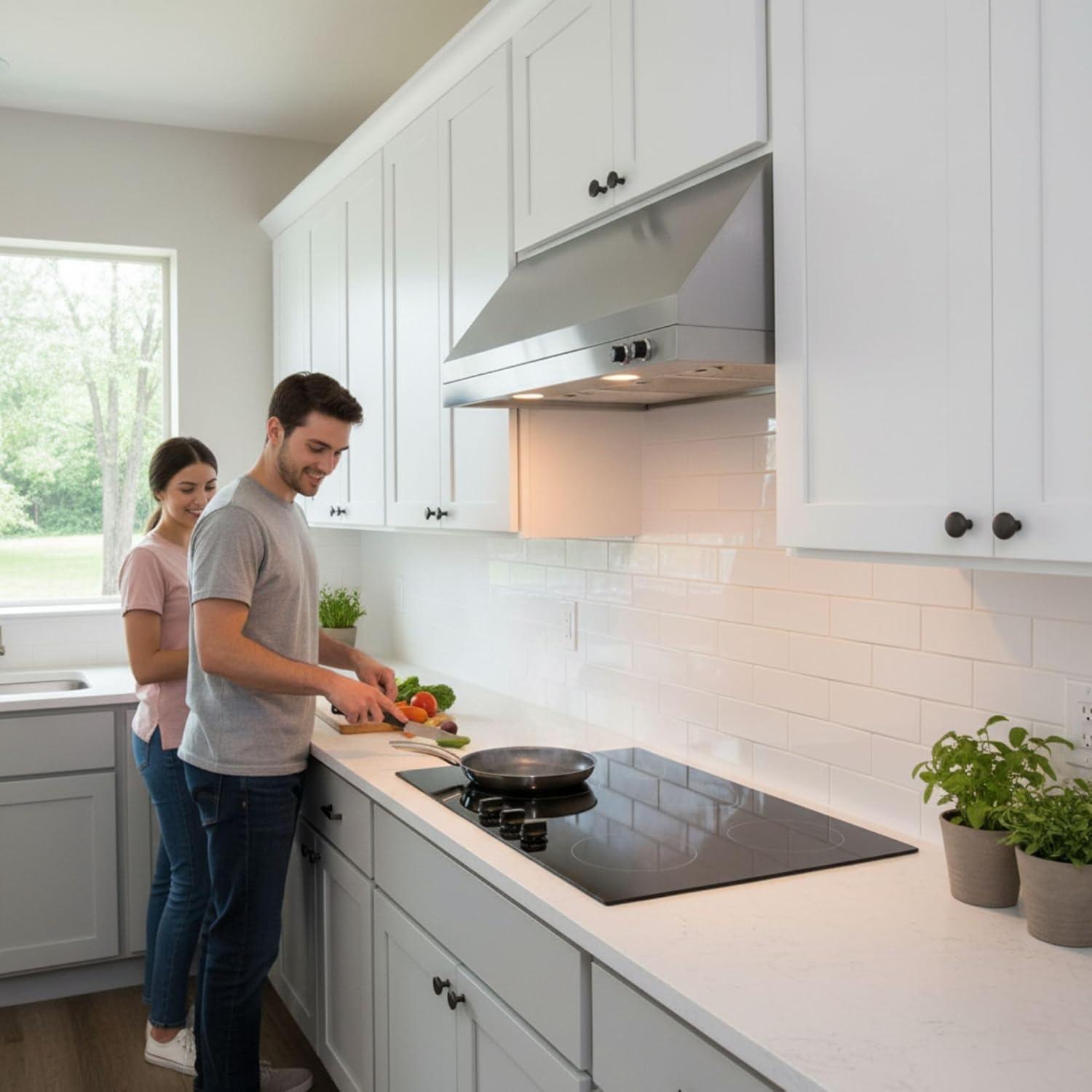 Bright Dimmable LED Illumination – Integrated LED lighting provides clear, energy-efficient illumination over your cooktop. The dimmable feature allows brightness adjustment for optimal visibility while preparing meals. Combined with the hood’s clean stainless-steel lines, the lighting enhances both functionality and contemporary kitchen aesthetics.