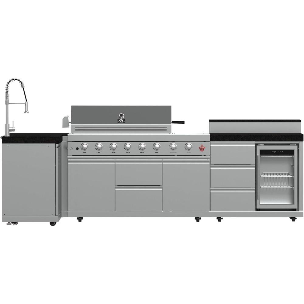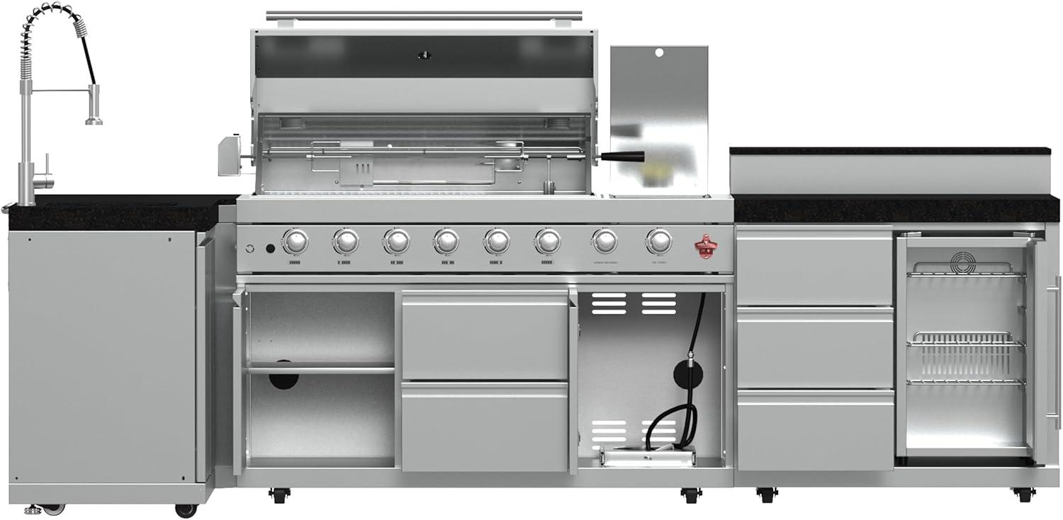 Premium Outdoor Kitchen Set – 40-inch BBQ with 95,000 BTU total output, featuring 5 stainless steel burners, an 11,000 BTU side burner, sear & rotisserie infrared system, and a cast iron griddle for versatile cooking.