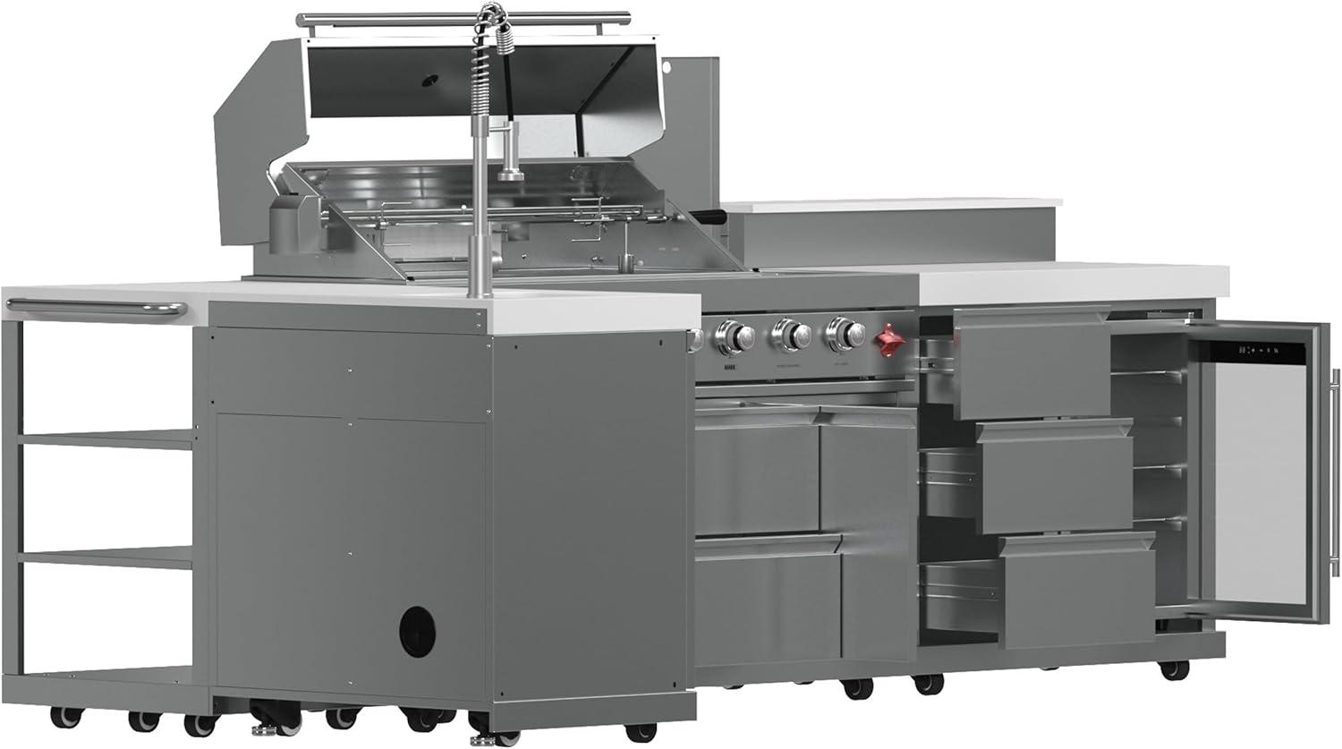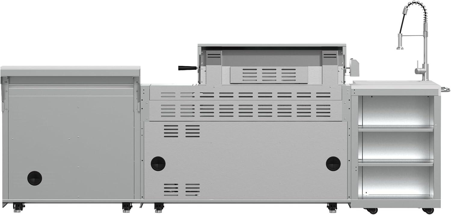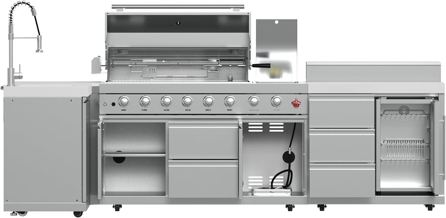 Transform your backyard into the ultimate entertainment space with the FORNO Bulnes 40-Inch Outdoor Kitchen Set—a complete solution for cooking, chilling, and hosting unforgettable gatherings. Designed with premium 304 stainless steel burners and elegant white sintered stone countertops, this outdoor kitchen combines durability, performance, and modern style. Cook like a professional with a spacious 38″ x 18″ grilling surface, five powerful stainless steel burners, and a sear & rotisserie infrared system for perfect steaks, juicy roasts, and flavorful vegetables. The cast iron griddle adds even more cooking versatility, while the 11,000 BTU side burner makes preparing sauces and side dishes easy without leaving the action. Keep your guests refreshed with the built-in 1.8 cu.ft. beverage center, and enjoy seamless outdoor entertaining well into the evening thanks to integrated halogen lights. Thoughtful features such as an accurate temperature gauge, pulse ignition, grease tray, caster wheels, and leveling feet make grilling simple, safe, and convenient. This complete set also includes a rotisserie kit, propane hose with regulator, and a protective weather cover to keep your outdoor kitchen ready for every occasion. With FORNO’s 2-year warranty covering parts and labor, you can cook with peace of mind knowing your investment is backed by quality craftsmanship and long-lasting reliability. Product Overall Dimensions W x D x H: 123.2″ x 65.4″ x 47″