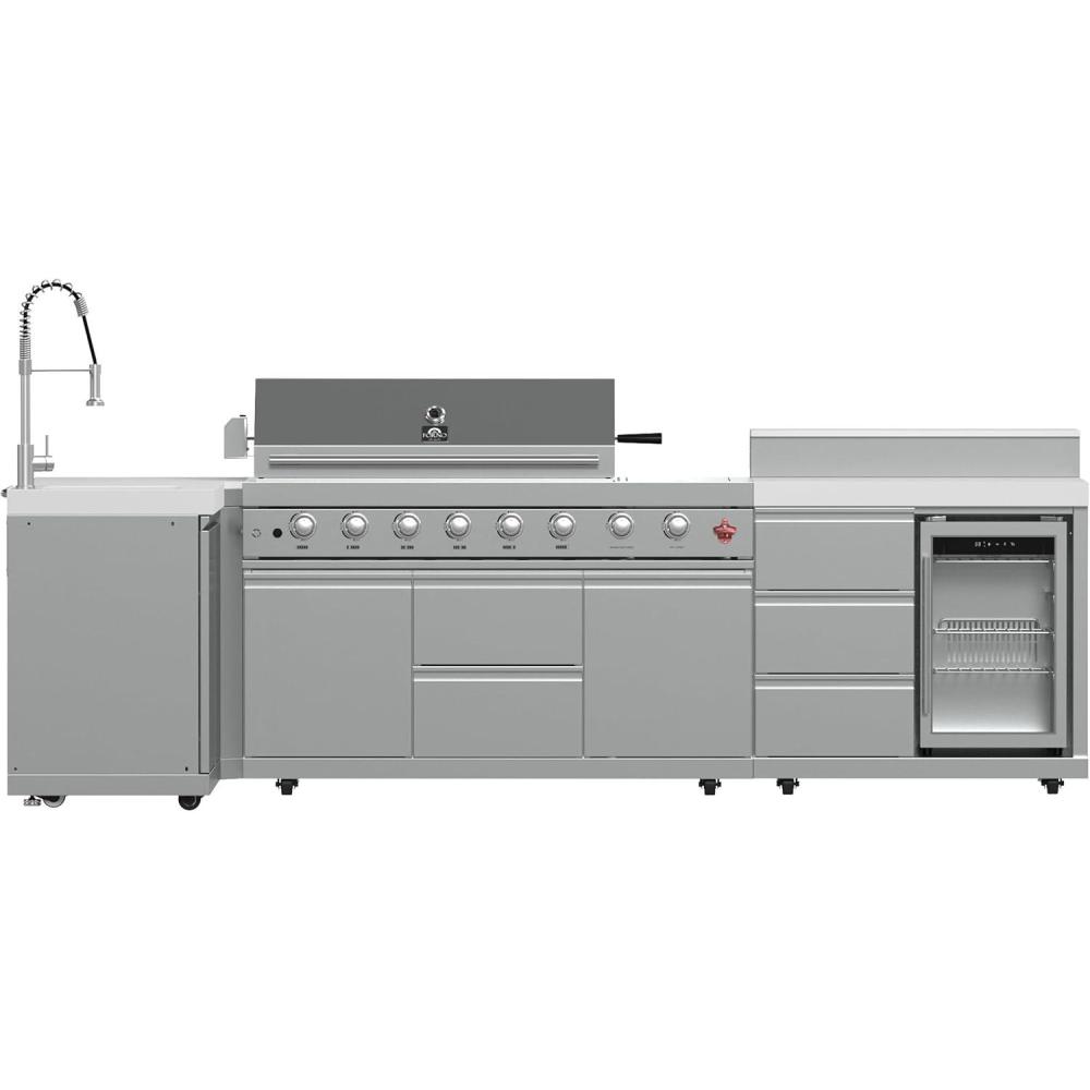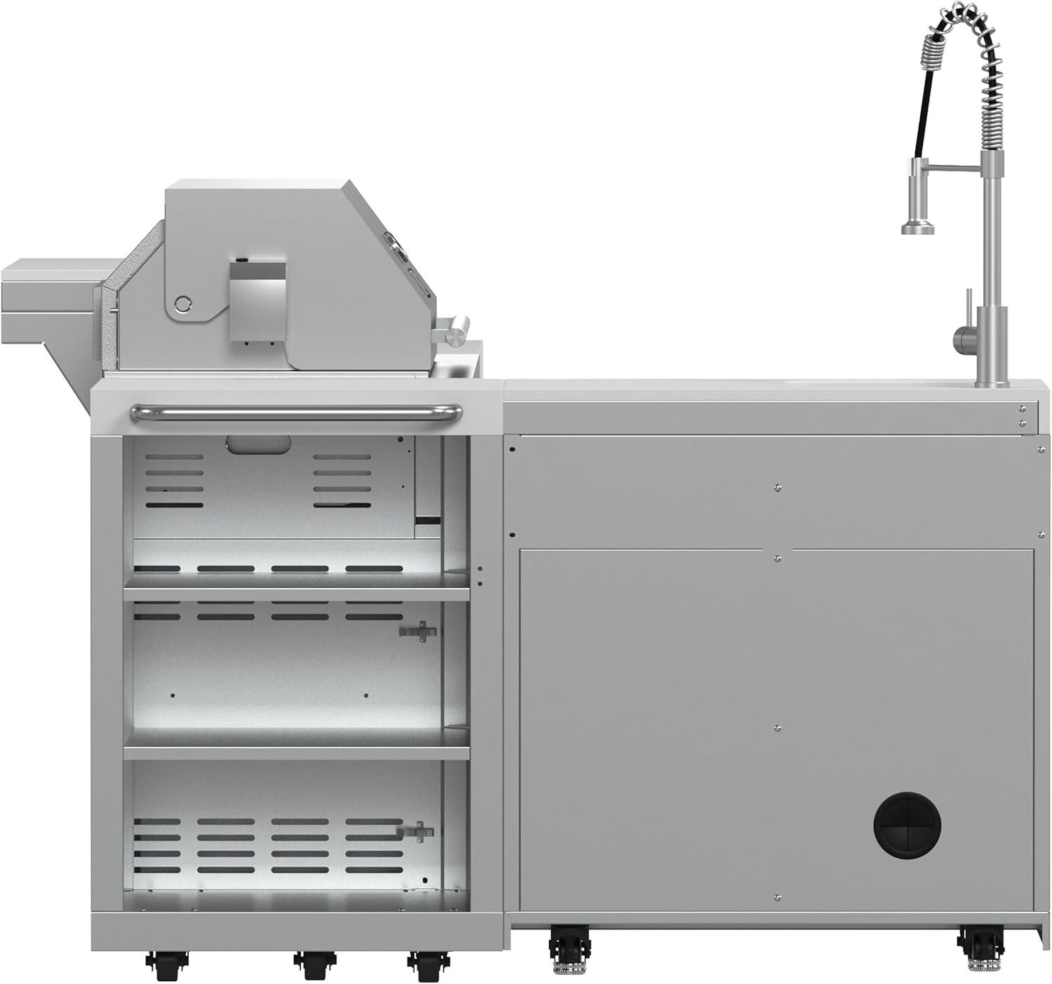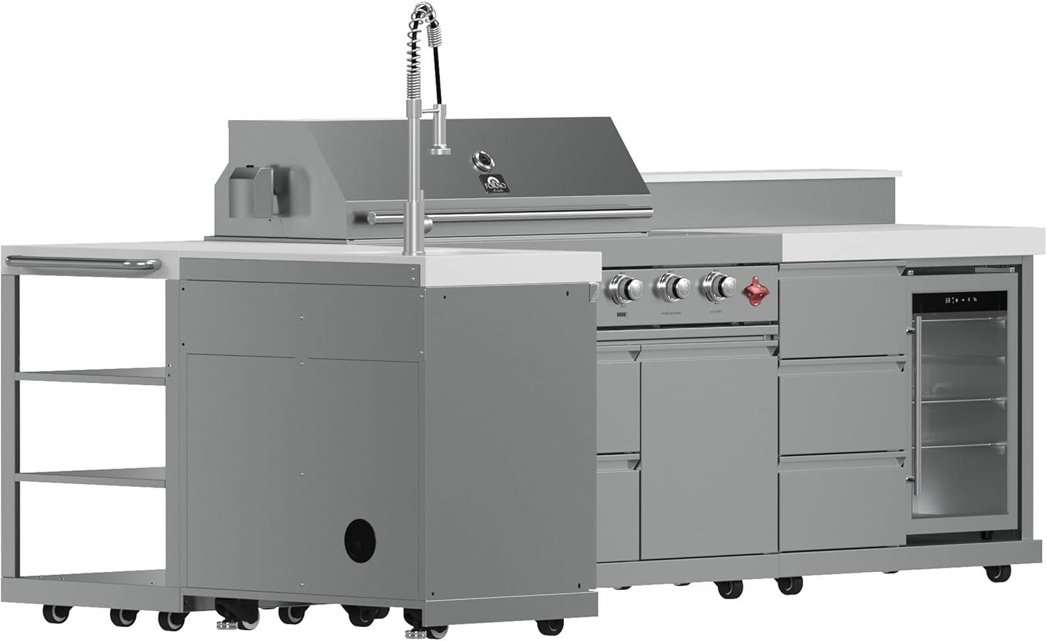 Transform your backyard into the ultimate entertainment space with the FORNO Bulnes 40-Inch Outdoor Kitchen Set—a complete solution for cooking, chilling, and hosting unforgettable gatherings. Designed with premium 304 stainless steel burners and elegant white sintered stone countertops, this outdoor kitchen combines durability, performance, and modern style. Cook like a professional with a spacious 38″ x 18″ grilling surface, five powerful stainless steel burners, and a sear & rotisserie infrared system for perfect steaks, juicy roasts, and flavorful vegetables. The cast iron griddle adds even more cooking versatility, while the 11,000 BTU side burner makes preparing sauces and side dishes easy without leaving the action. Keep your guests refreshed with the built-in 1.8 cu.ft. beverage center, and enjoy seamless outdoor entertaining well into the evening thanks to integrated halogen lights. Thoughtful features such as an accurate temperature gauge, pulse ignition, grease tray, caster wheels, and leveling feet make grilling simple, safe, and convenient. This complete set also includes a rotisserie kit, propane hose with regulator, and a protective weather cover to keep your outdoor kitchen ready for every occasion. With FORNO’s 2-year warranty covering parts and labor, you can cook with peace of mind knowing your investment is backed by quality craftsmanship and long-lasting reliability. Product Overall Dimensions W x D x H: 123.2″ x 65.4″ x 47″