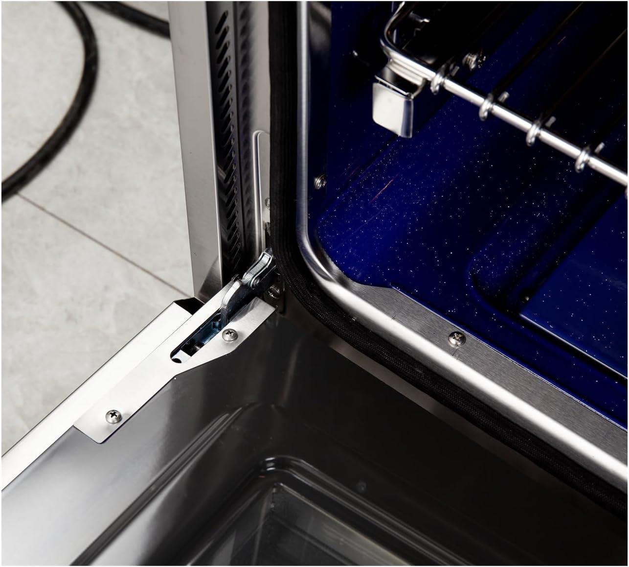 𝐅𝐄𝐀𝐓𝐔𝐑𝐄𝐒: Constructed with premium 304 stainless steel for long-lasting strength. Includes 6 illuminated cast-zinc knobs, Night Light red LED automatic magic eyes, easy-clean pro-style handle, soft-close oven door, adjustable stainless-steel legs with square covers, and smudge-resistant finish.