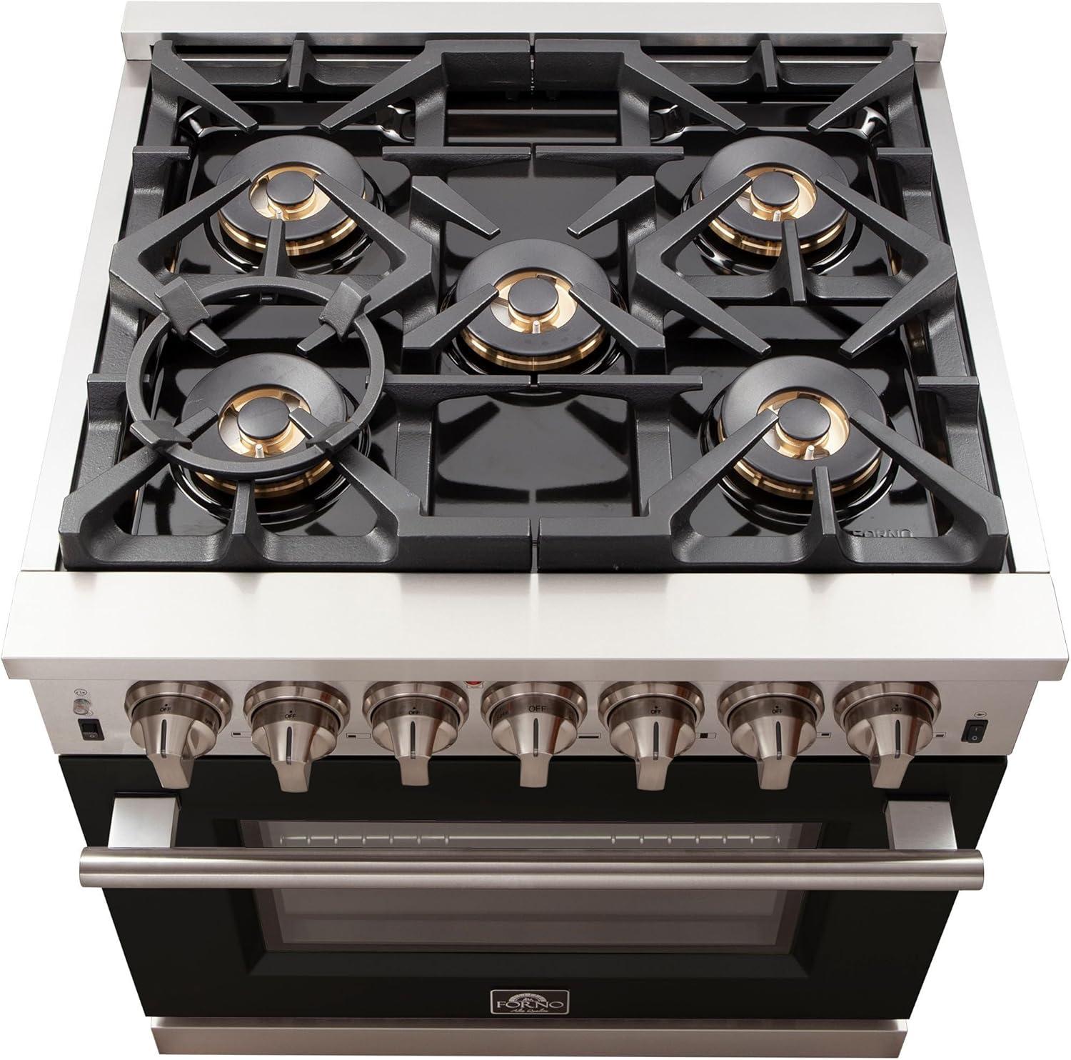 FORNO Capriasca 30″ Gas Range, 4.32 Cu. Ft. Convection Oven with 5 Sealed Italian Burners – Full Gas Freestanding Range – Black Stainless Steel, Heavy-Duty Cast Iron Grates, FFSGS6260-30BLK