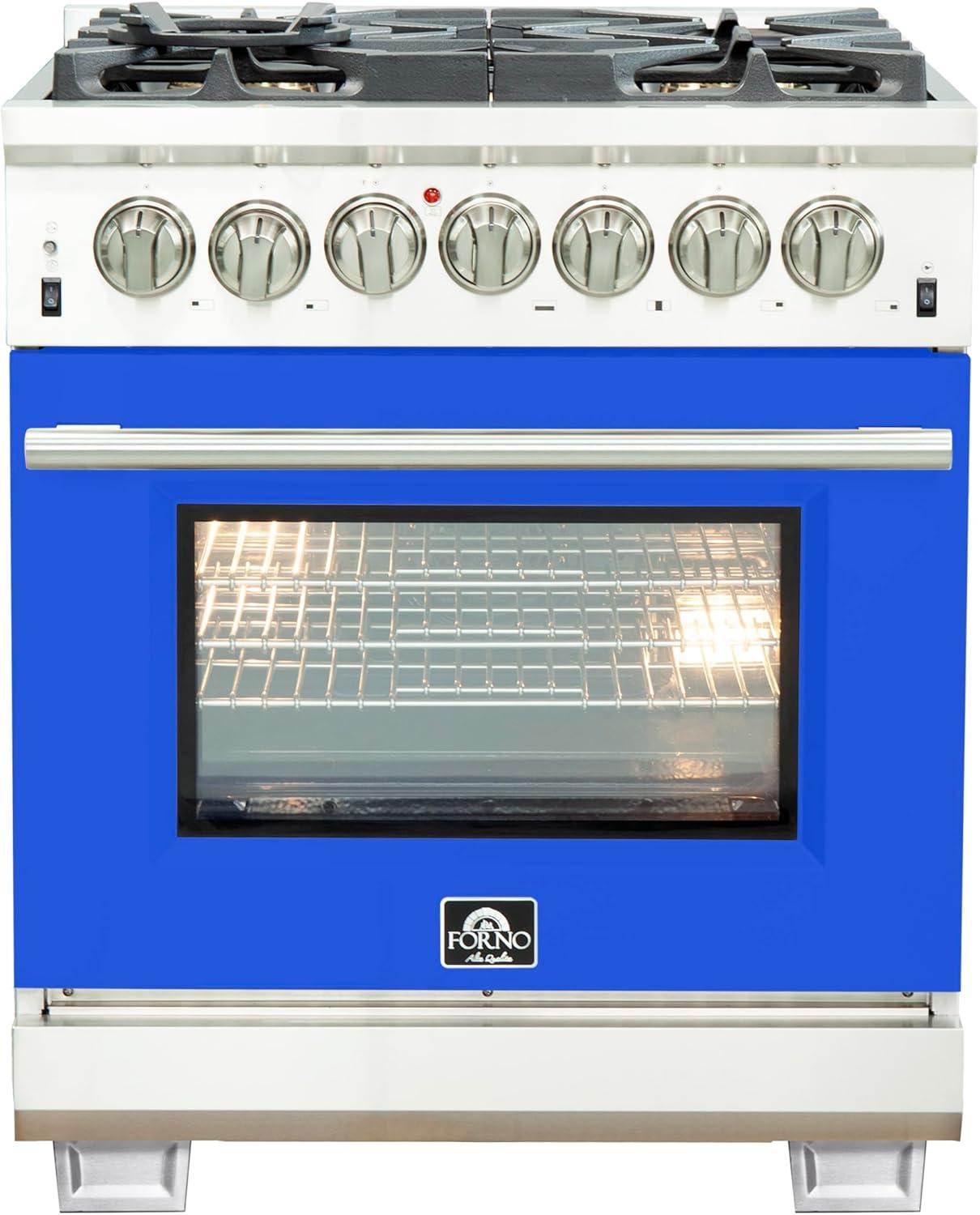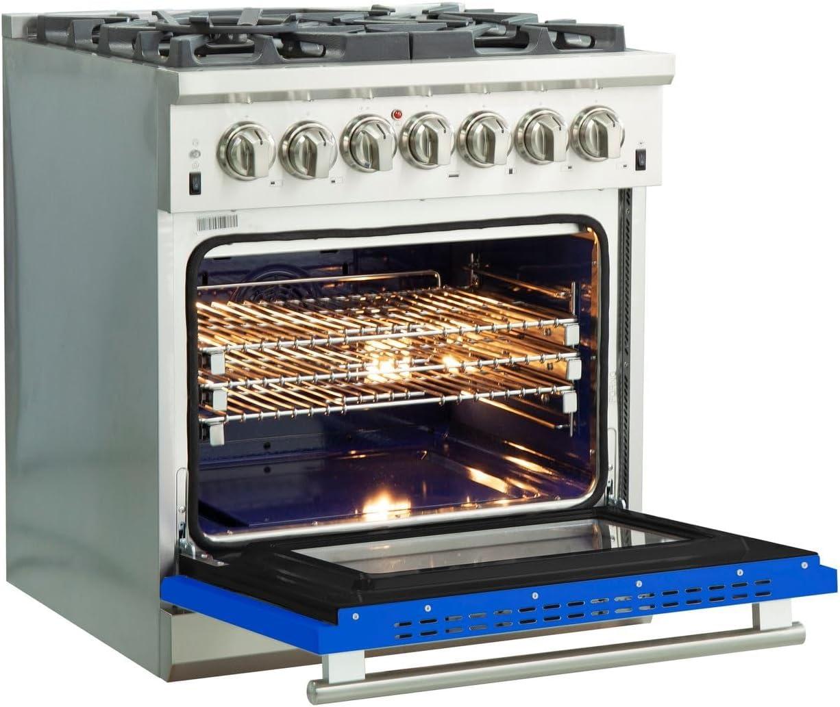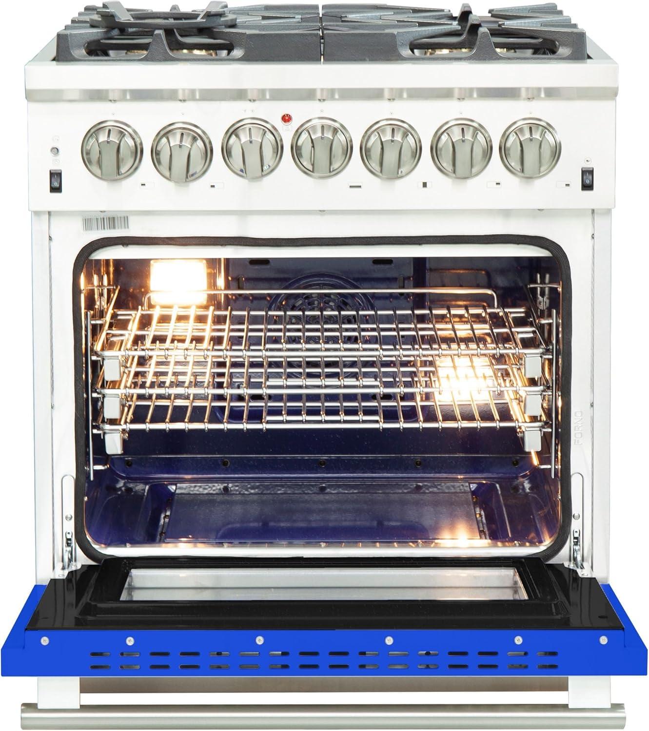Spacious True Convection Oven – Large 4.32 cu. ft. oven features European convection with U-tube auto ignition for even heat circulation. Includes three telescopic racks, blue enameled interior, two halogen lights, and triple glass door for visibility and insulation during roasting or baking.