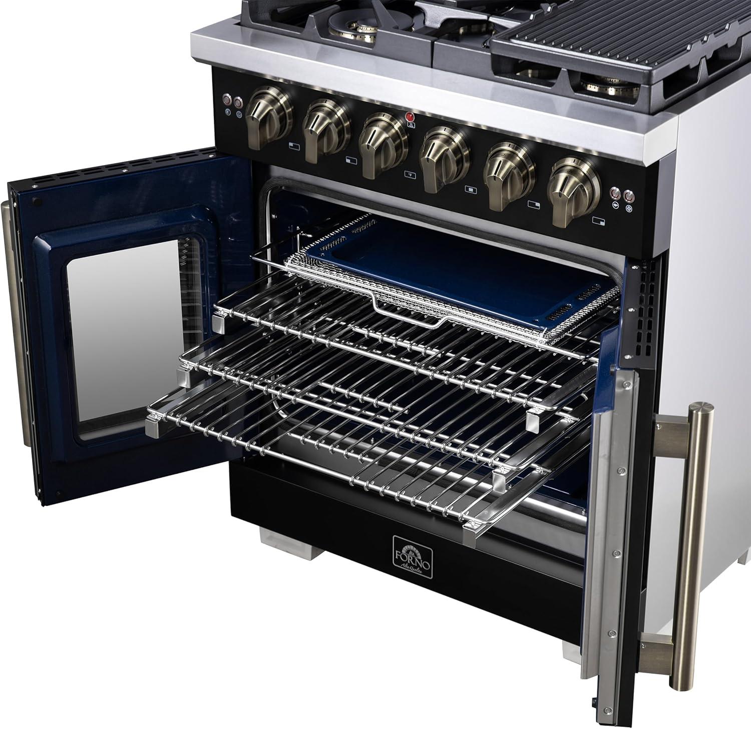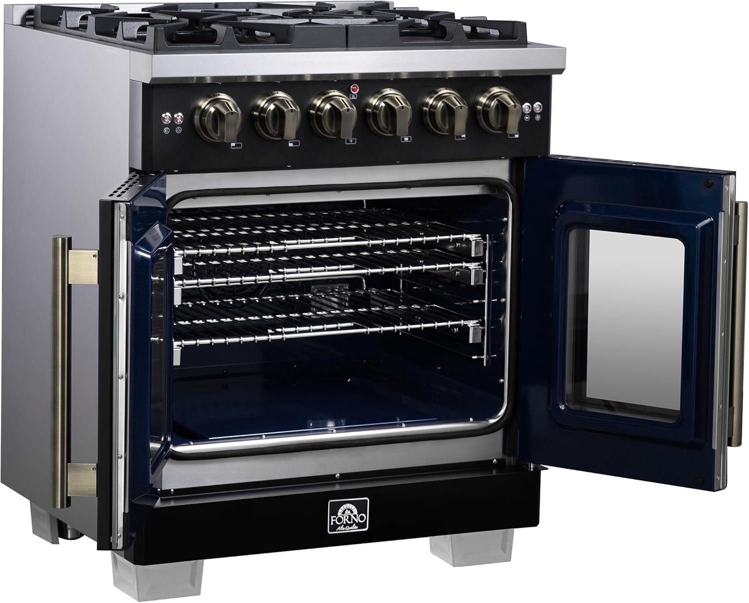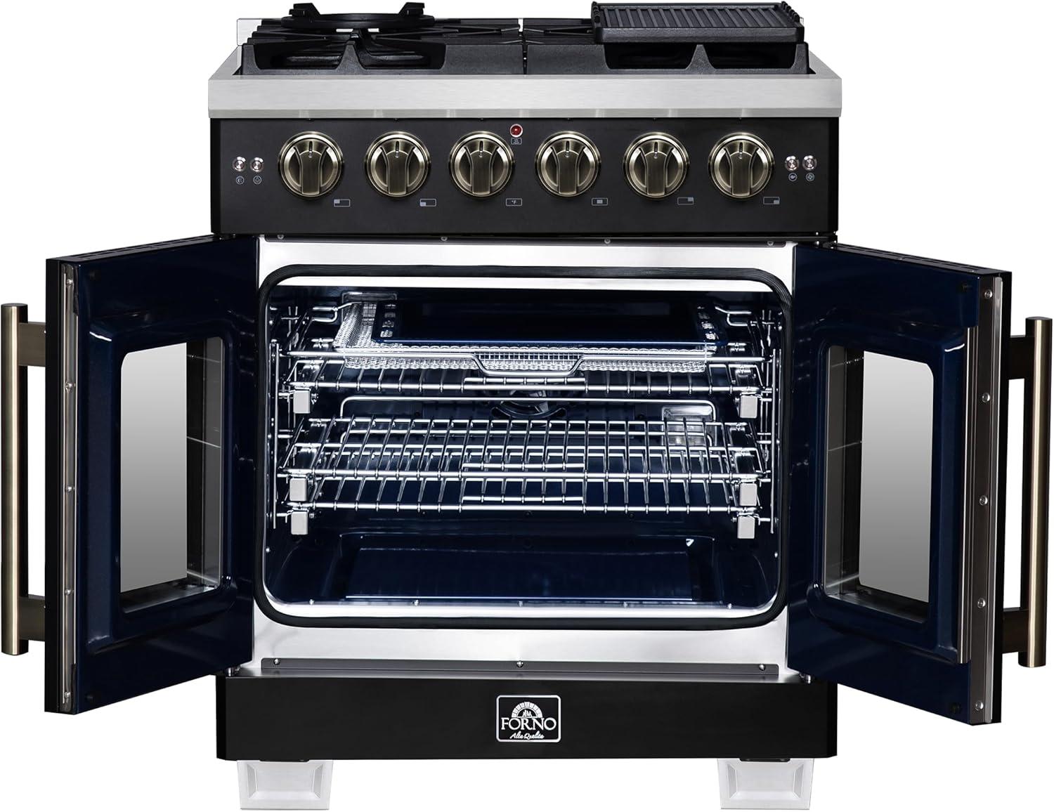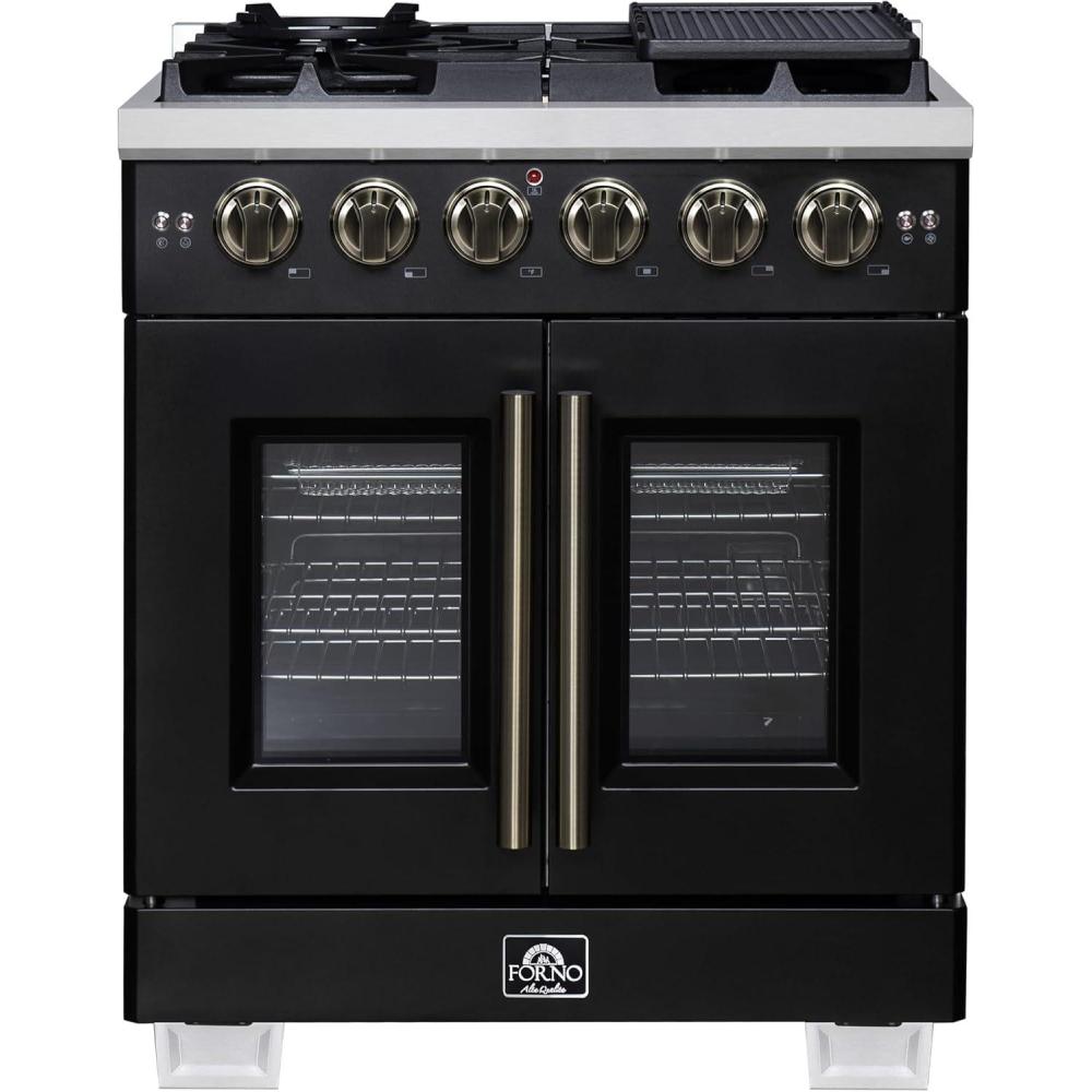 Be the first to review “Forno Capriasca 30-Inch Freestanding French Door Gas Range with 4 Sealed Burners – Convection Oven with Antique Brass Handle & Knobs – Professional Stainless Steel Kitchen Stove – Black”