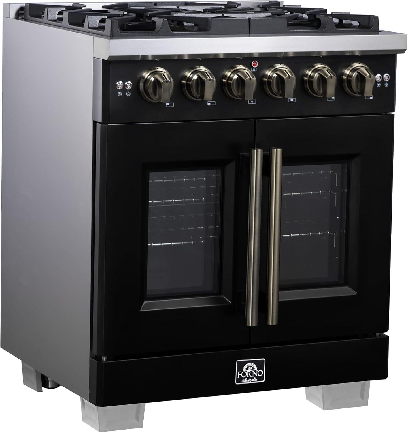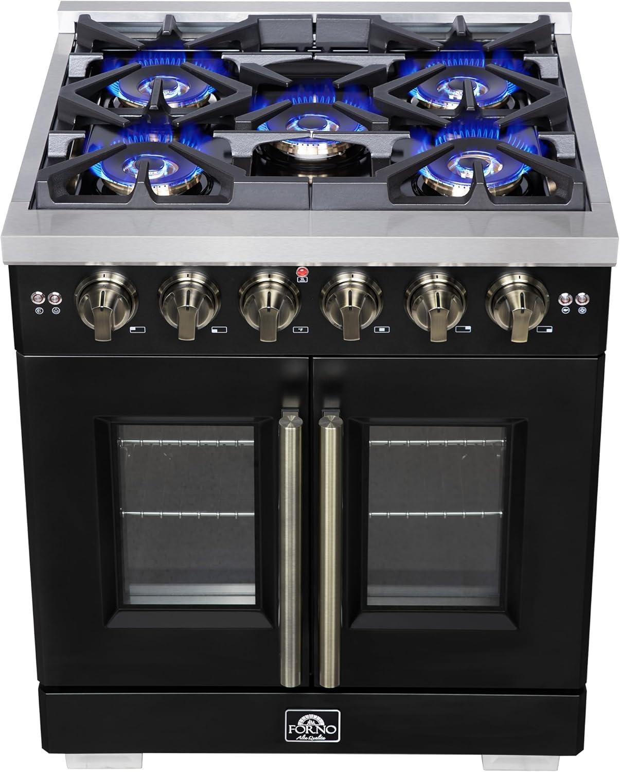 Forno Capriasca 30-Inch Freestanding French Door Gas Range with 4 Sealed Burners - Convection Oven with Antique Brass Handle & Knobs – Professional Stainless Steel Kitchen Stove - Black