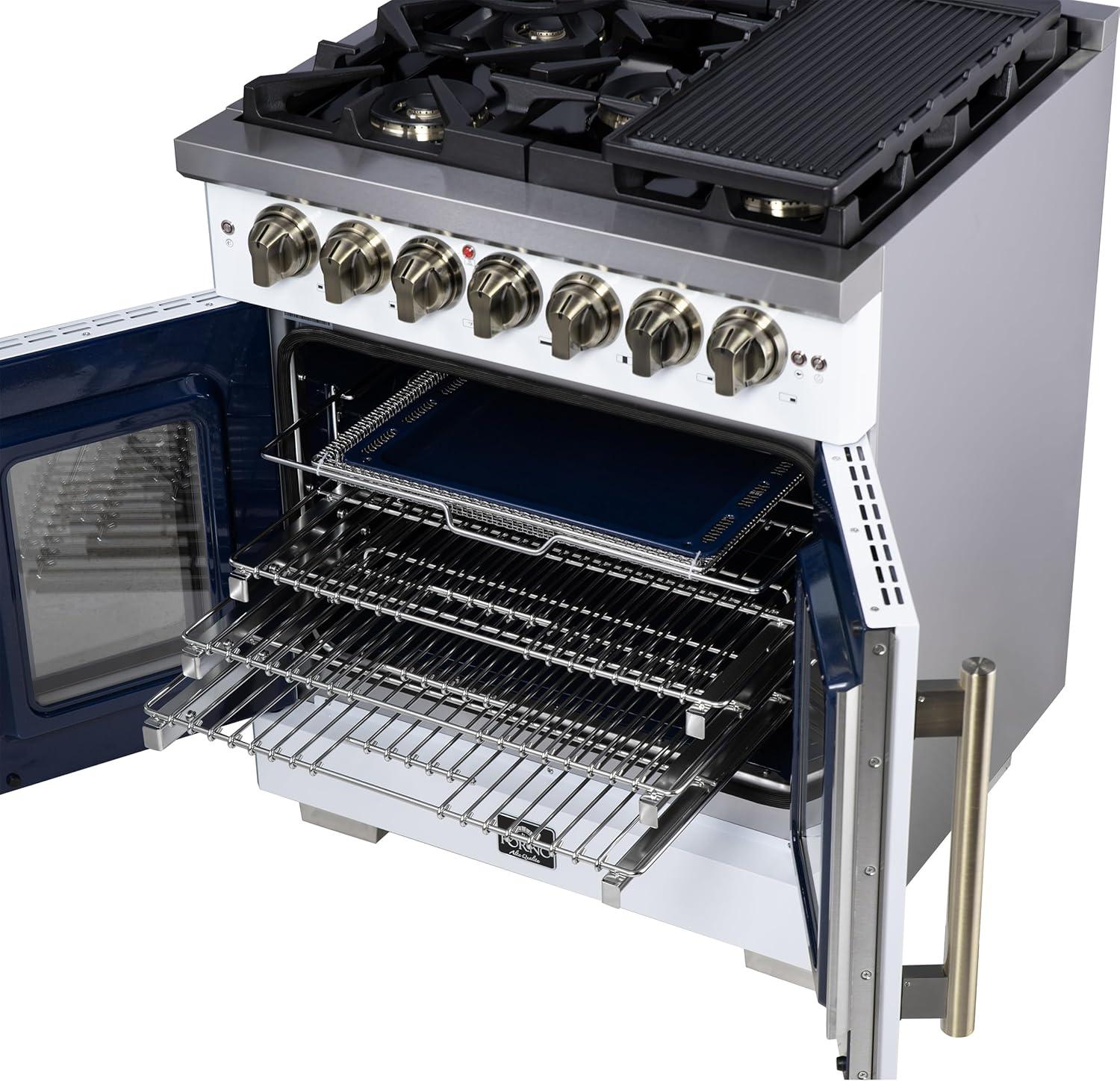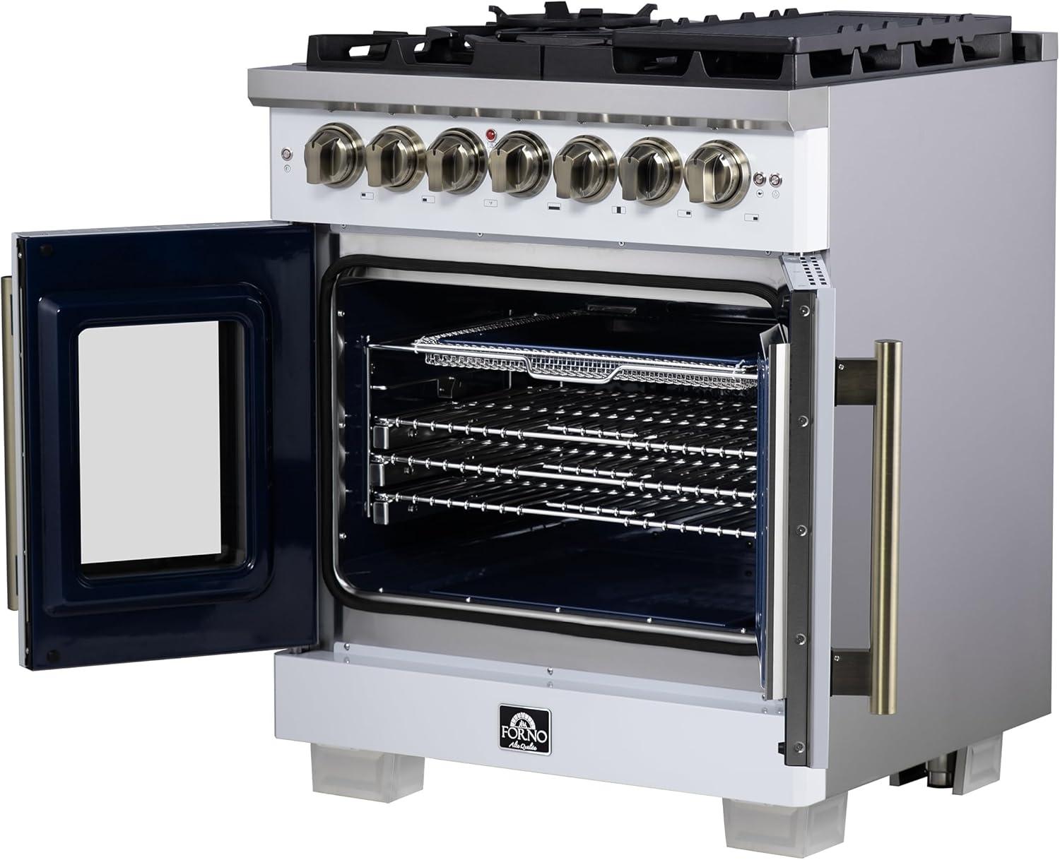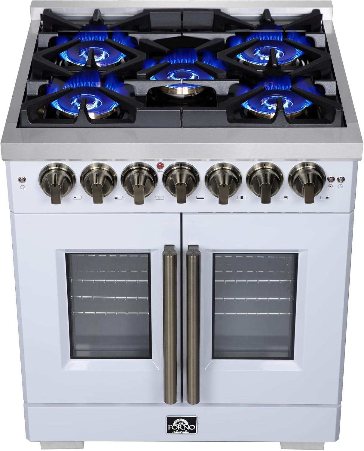 imageForno Capriasca 30Inch French Door Dual Fuel Range with Antique Brass Accents amp 5 Sealed DualRing Brass  432 cuft True Convection Oven with Rotisserie Kit amp LP Conversion Kit  White