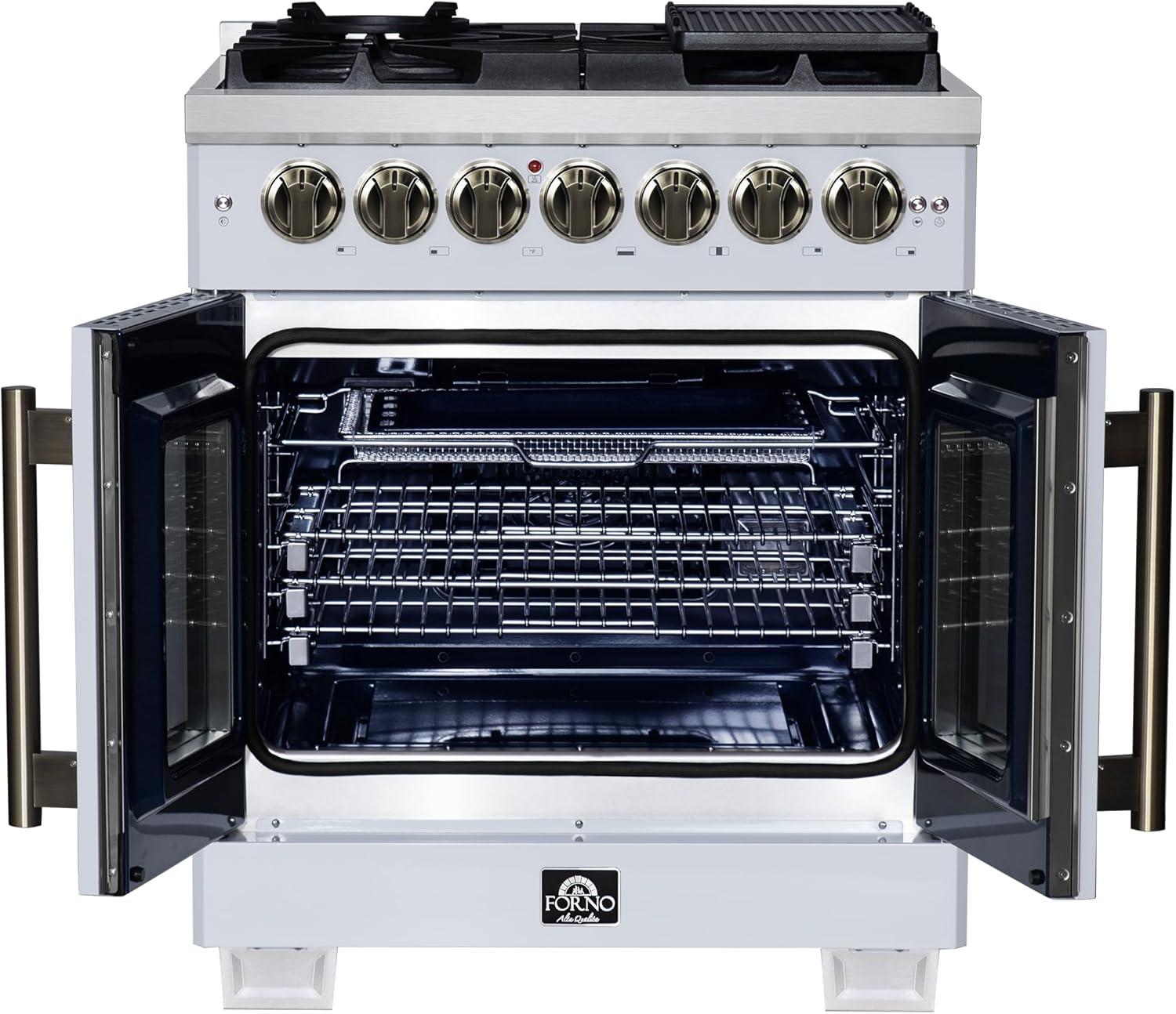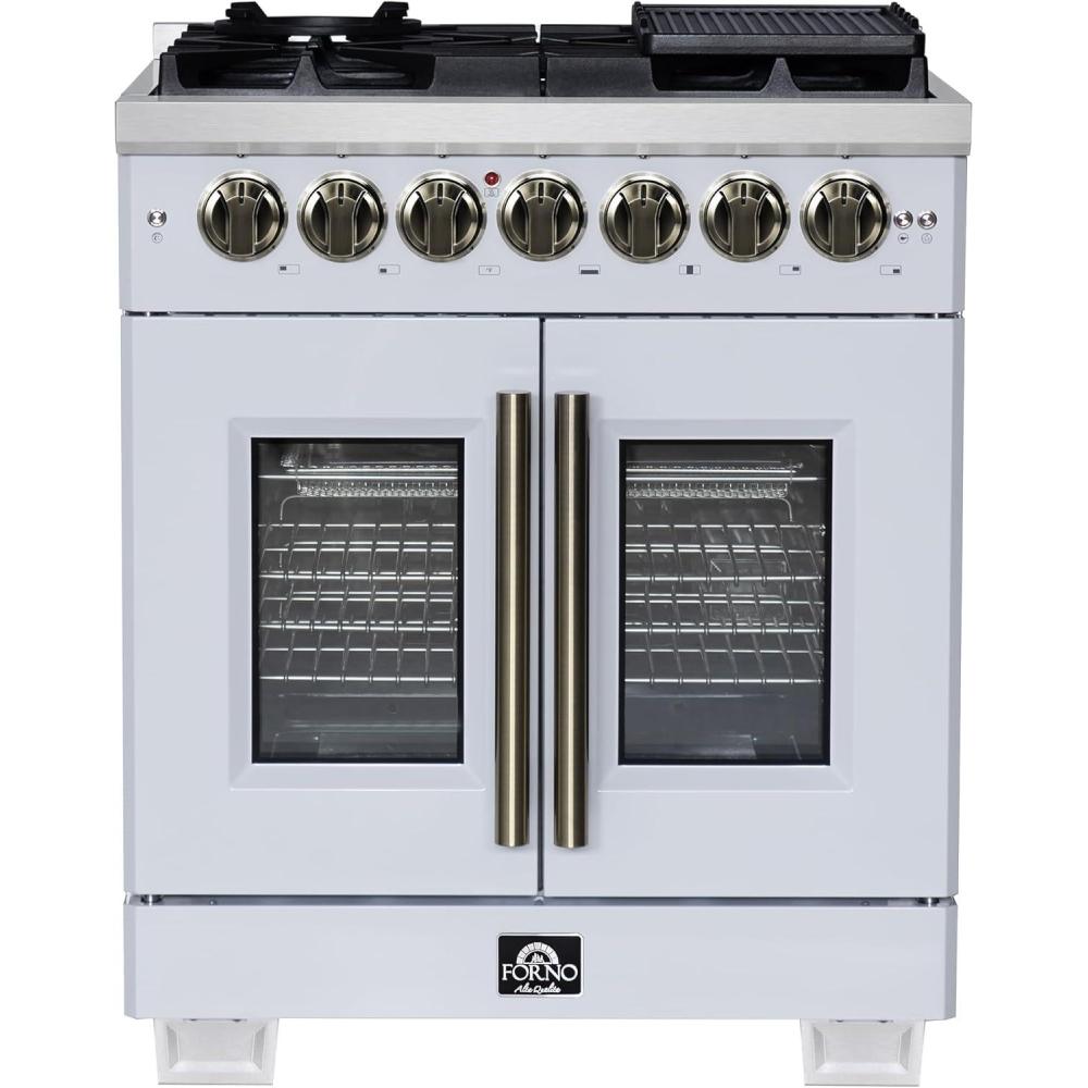Forno Capriasca 30-Inch French Door Dual Fuel Range with Antique Brass Accents & 5 Sealed Dual-Ring Brass - 4.32 cu.ft. True Convection Oven with Rotisserie Kit & LP Conversion Kit - White