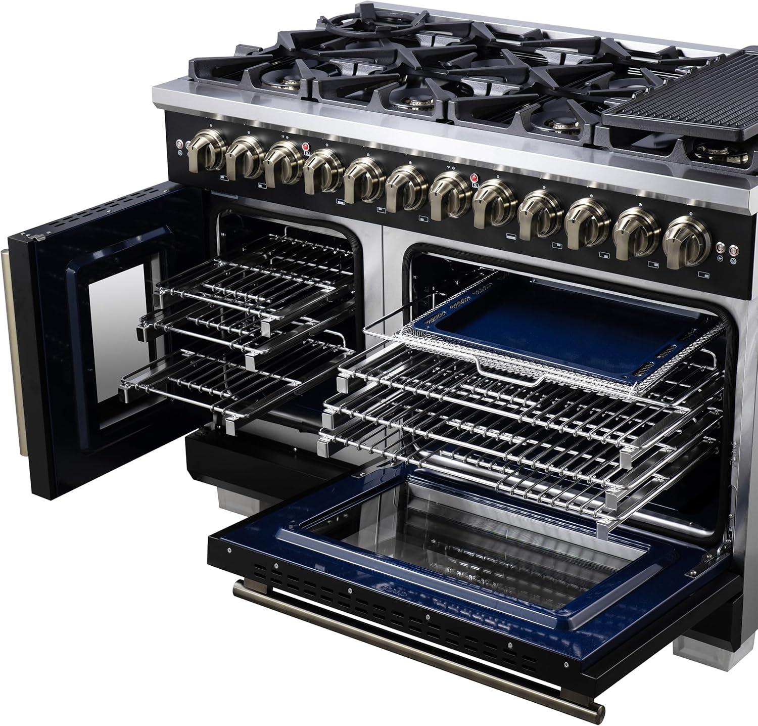 Forno Capriasca 48-Inch French Door Dual Fuel Range with Antique Brass Accents & 8 Sealed Dual-Ring Brass Burners – 6.58 cu.ft. Double True Convection Ovens w/Wok Ring & Reversible Griddle – Black