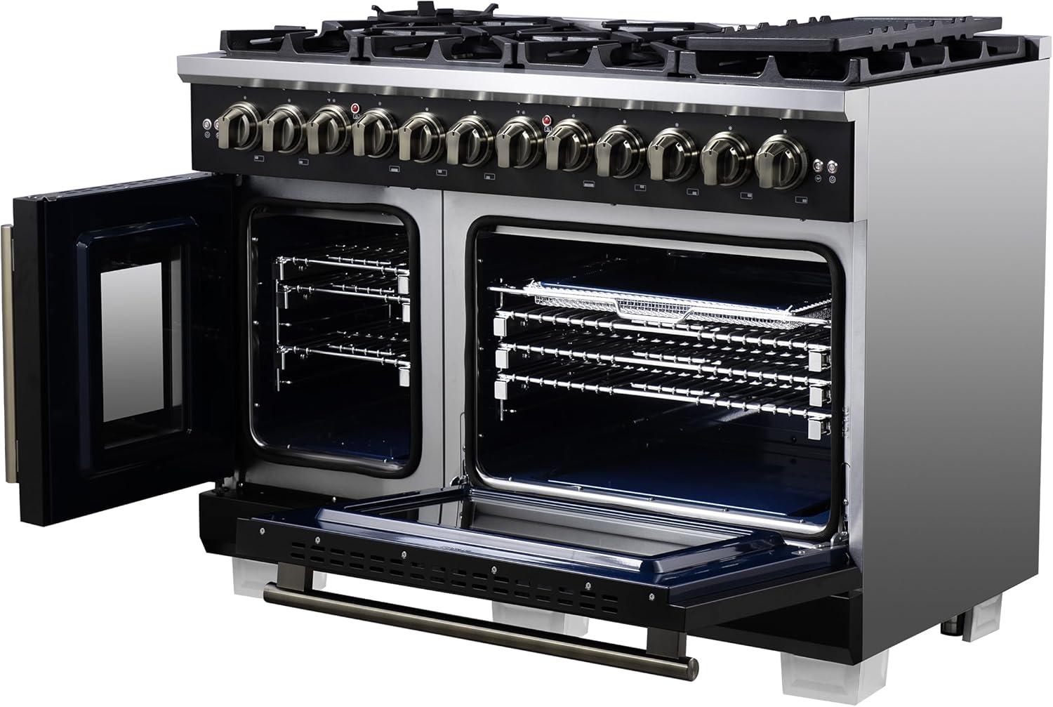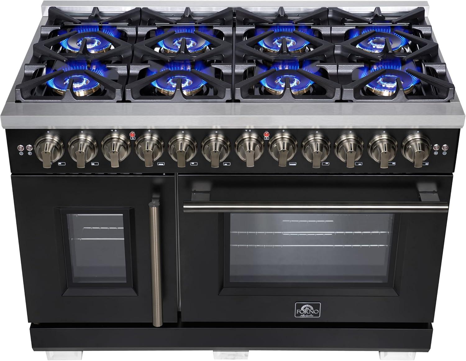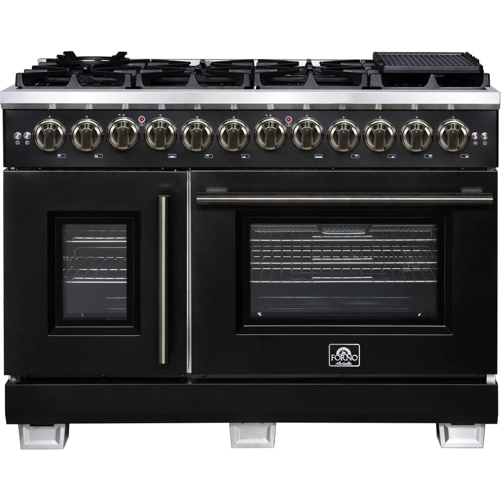 Forno Capriasca 48-Inch French Door Dual Fuel Range with Antique Brass Accents & 8 Sealed Dual-Ring Brass Burners - 6.58 cu.ft. Double True Convection Ovens w/Wok Ring & Reversible Griddle - Black