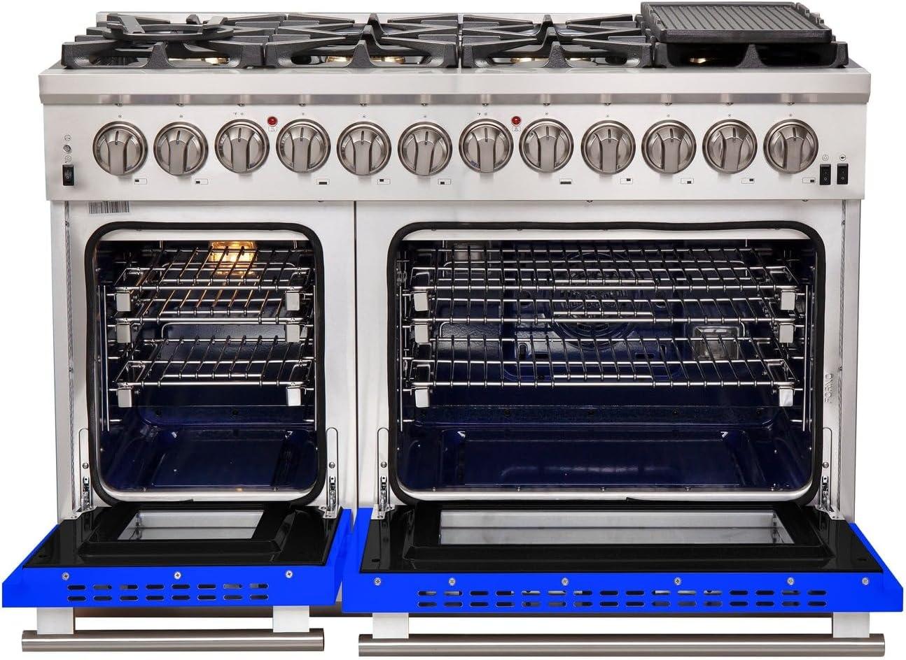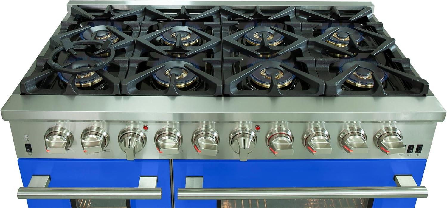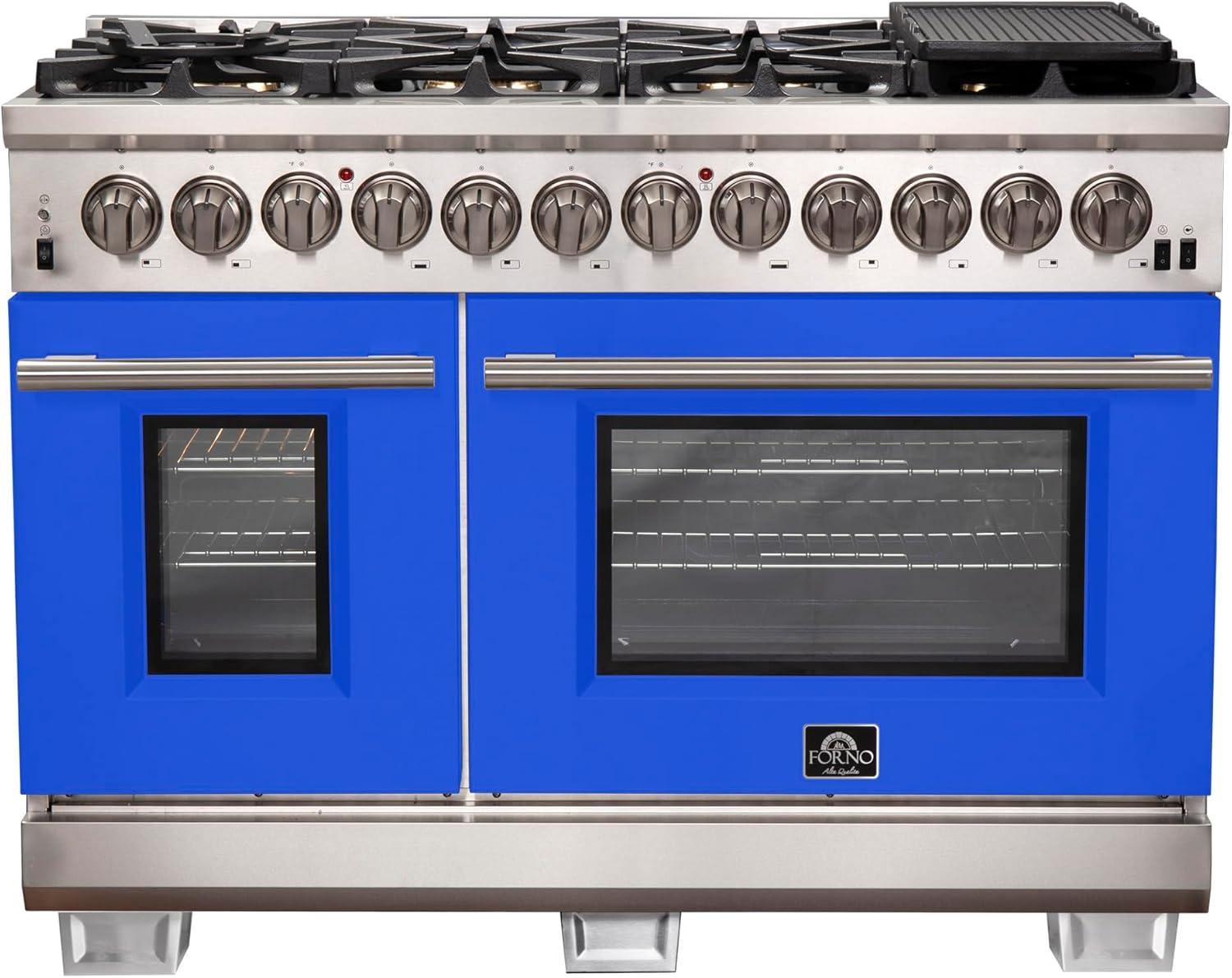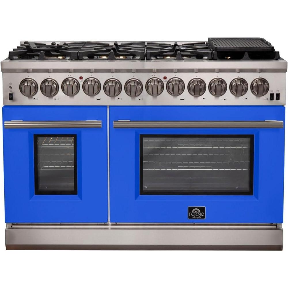 FORNO Capriasca Dual Fuel 48-Inch Freestanding Range 8 Sealed Brass Burners Cooktop – 6.58 Cu. Ft. Double Convection Electric Oven – Stainless Steel Stove Range Heavy Duty Cast Iron Grates, Blue