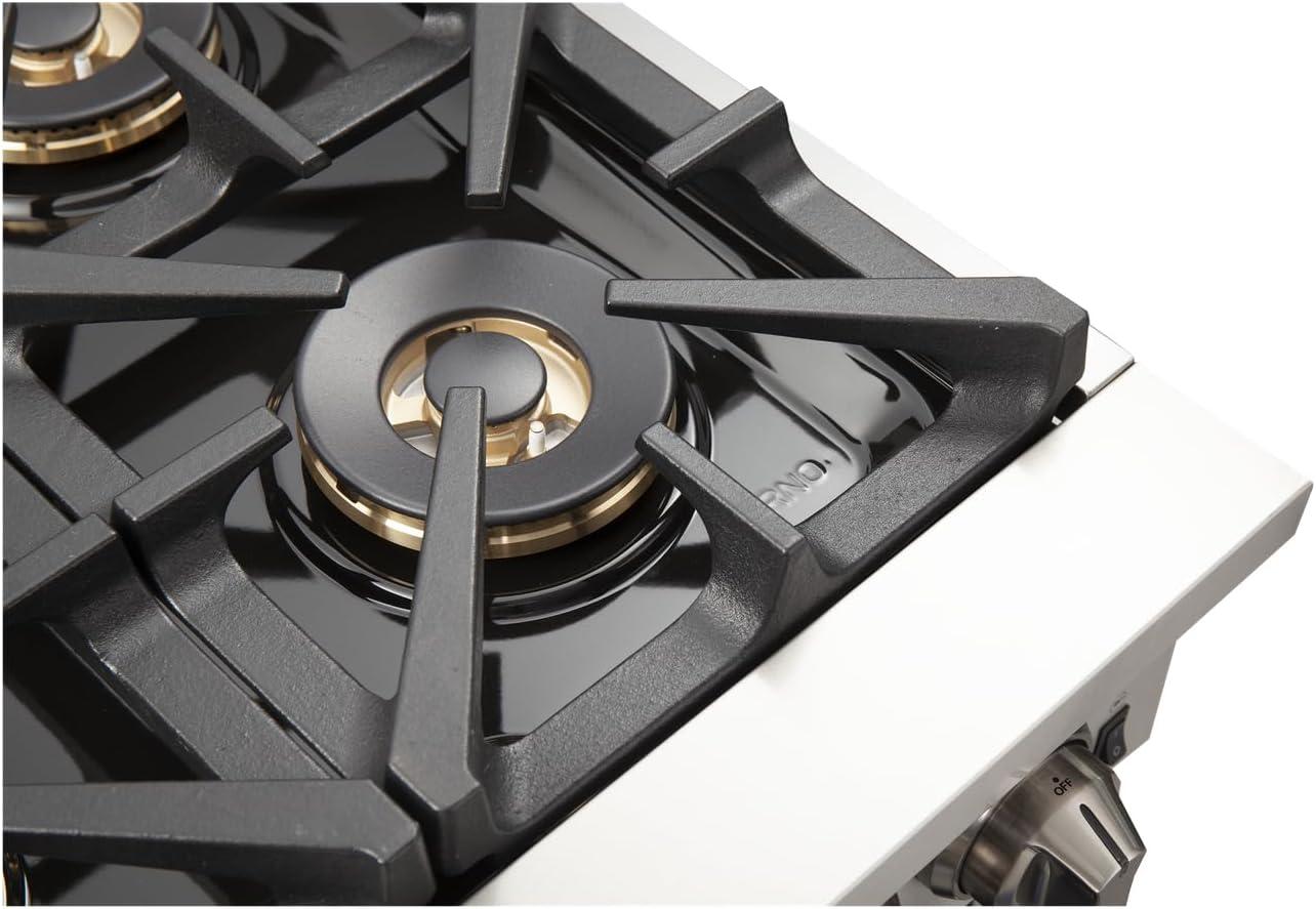 𝐂𝐎𝐎𝐊𝐓𝐎𝐏: There are 8 Italian Brass Burners, Surface Burners Include Eight 20,000 BTU Max and 1,000 BTU Min, double entry gas lines. Dual Ring Burners For Maximum Cooking Control, Auto Flame Re-ignition on Surface Burners, Black Matte Cast Iron Continuous Burner Grates, Black Enamel Surface Plate for Easy Clean. Sealed Dual Burner BTU: 20,000 /Sim 1,000BTU*8