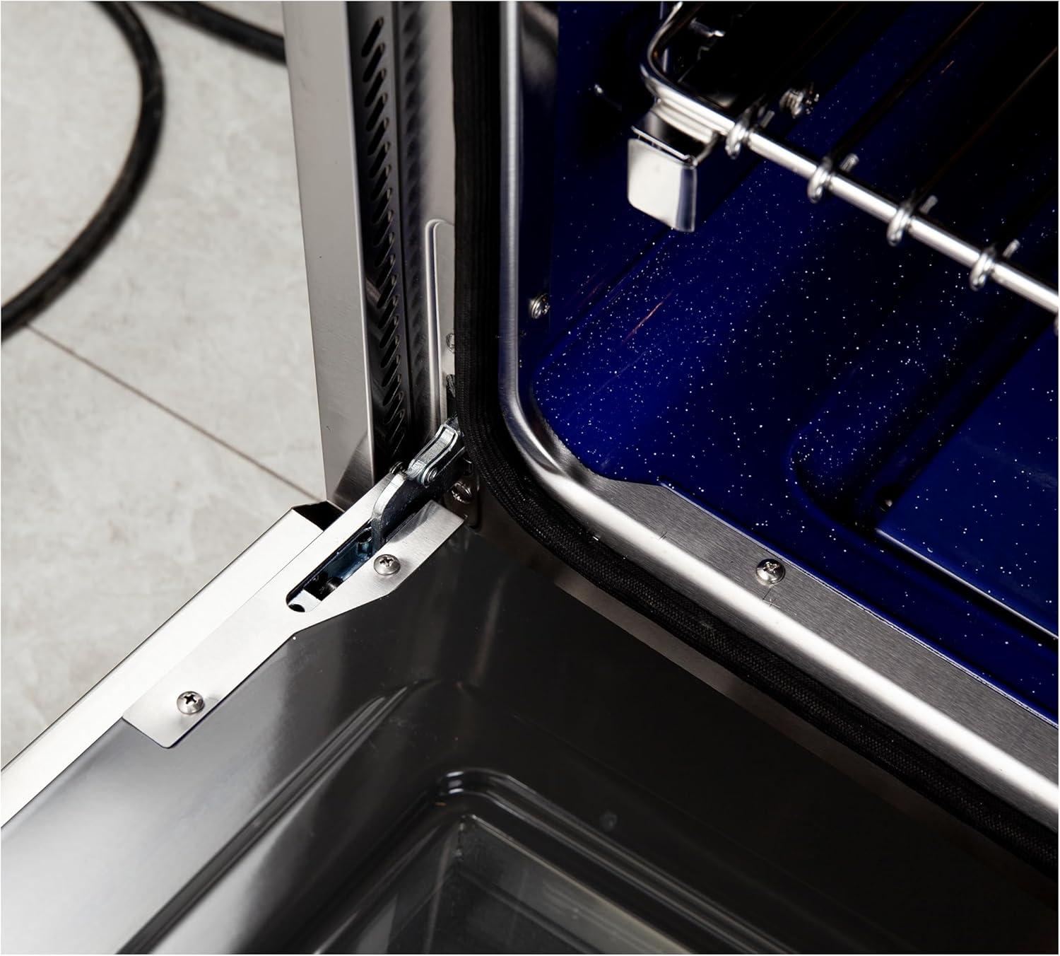 𝐅𝐄𝐀𝐓𝐔𝐑𝐄𝐒: Forno makes this range with 304-grade stainless steel. There are 12 heavy-duty cast zinc knobs that illuminate light temperature indicators, Night Light Red LED Automatic Magic Eyes, FORNO Easy Clean Pro-Style Handle, Adjustable Stainless Steel Legs, Leg Stainless Steel Square Cover, one cast iron grille that is reversible and movable, Automatic Ignition, Soft Door Close, and Fuel Type: Natural Gas Converts to LP