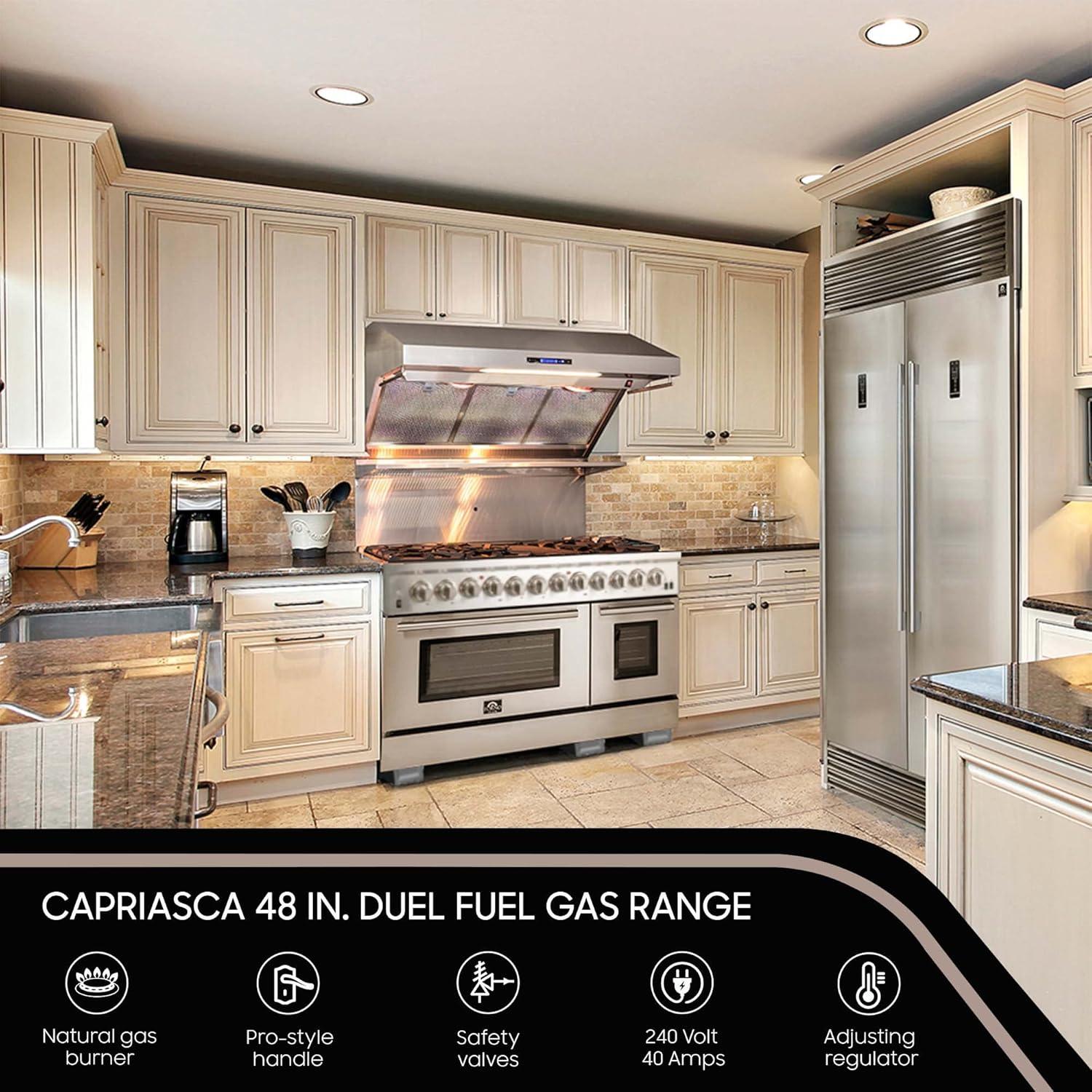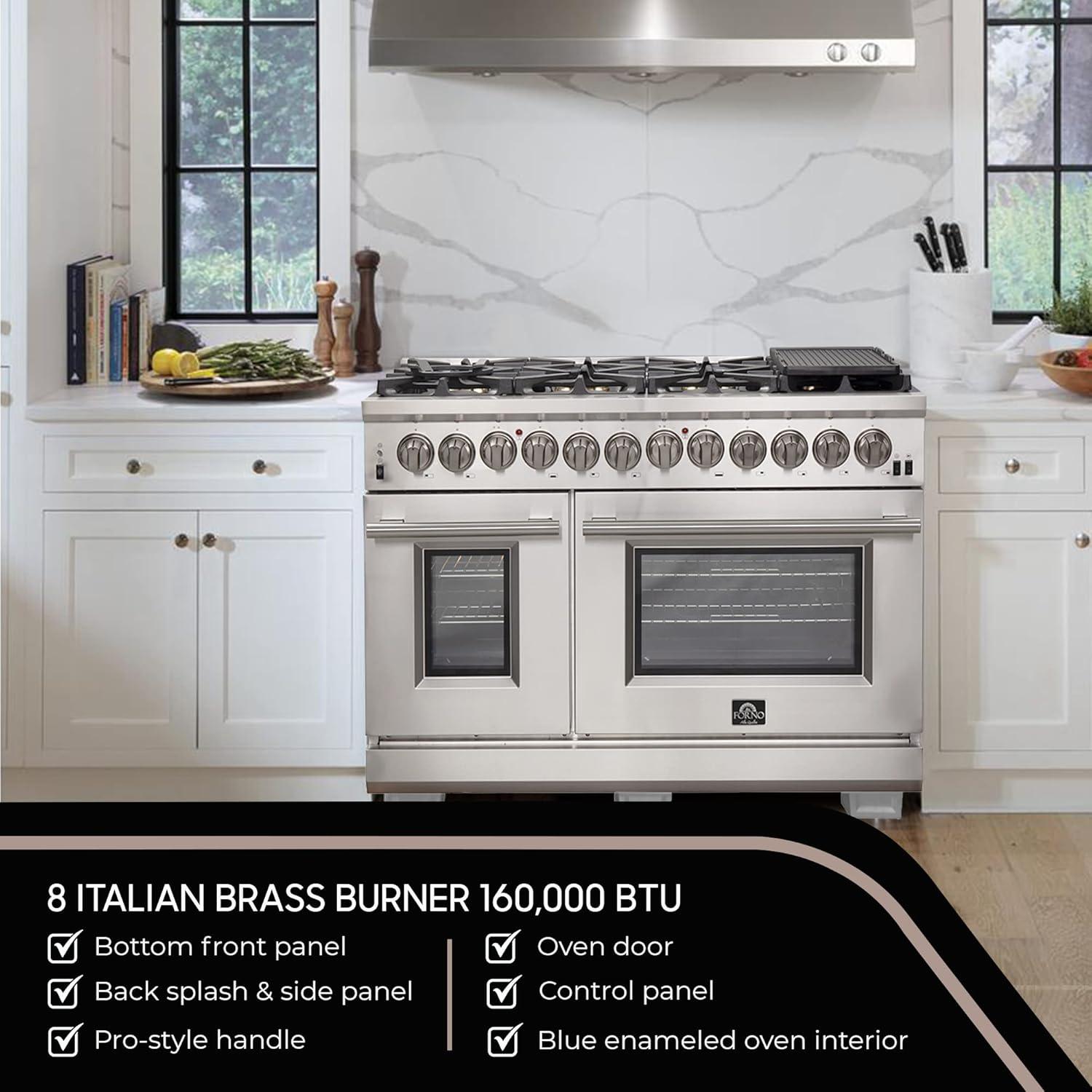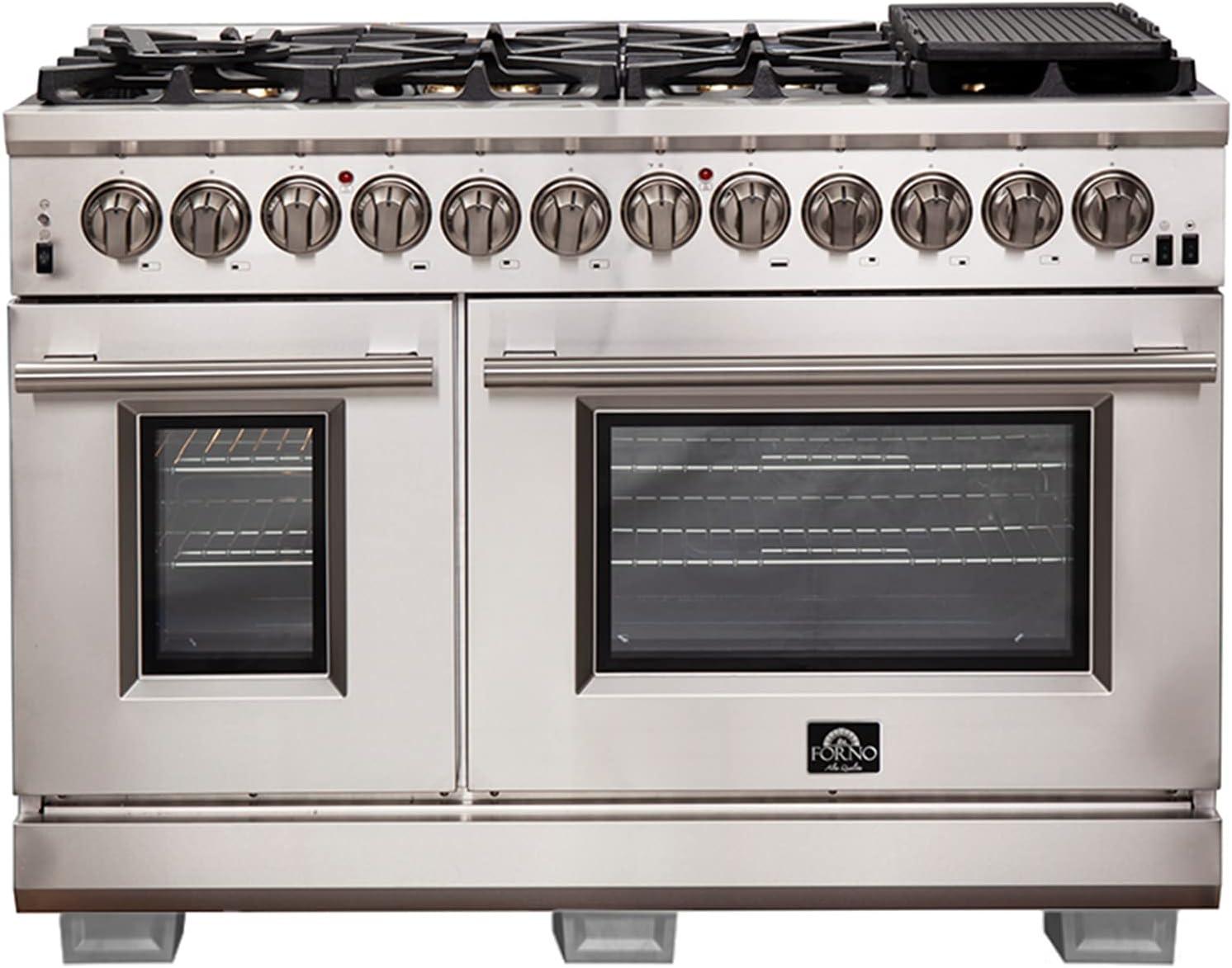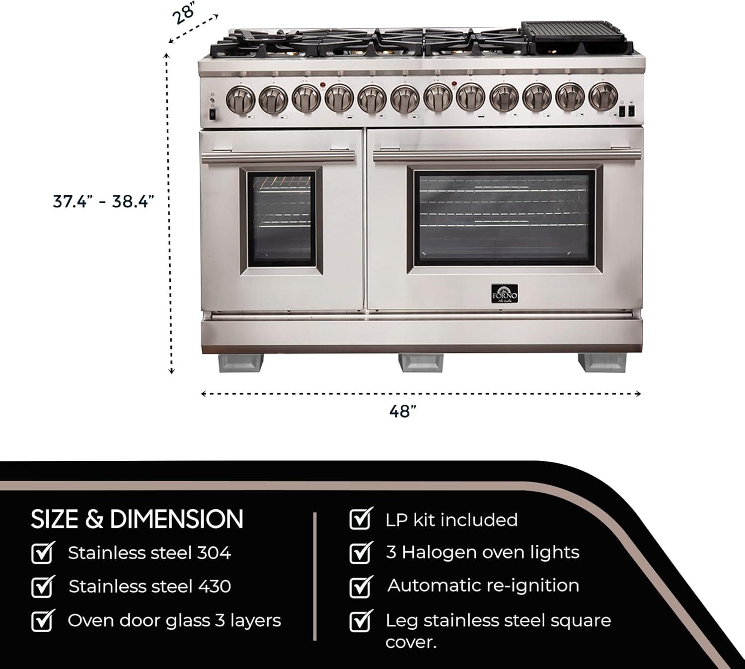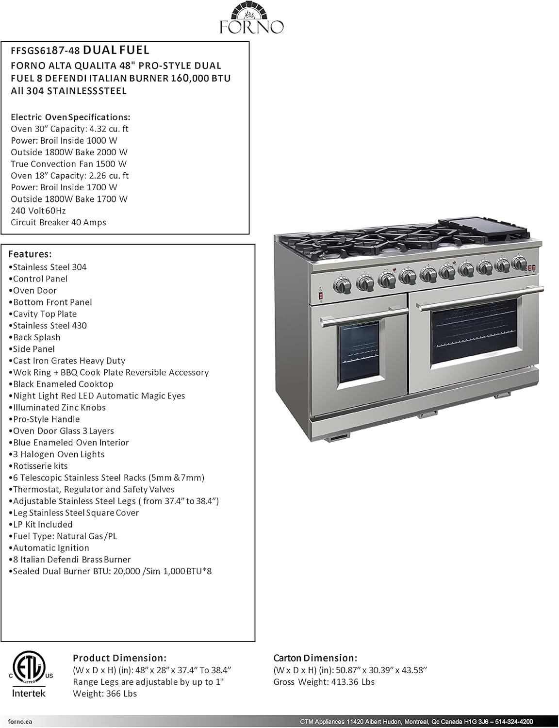 𝐈𝐍𝐂𝐋𝐔𝐃𝐄𝐒: Forno offers this Dual Fuel Electric Oven Range 2 Year Factory Parts and Labor Warranty. The 48″ range and oven Overall Capacity is 6.58 cubic feet, Circuit breaks 40 Amp, 240 Voltage 60Hz, and ETL listings. The Dual Fuel range Overall Dimensions (W x D x H) (in): 48” x 28” x 37.4” To 38.4” Range Legs are adjustable by up to 1″ Weight: 366 Lbs and Carton Dimension (W x D x H) (in): 50.87” x 30.39” x 43.58” Gross Weight: 413.36 Lbs