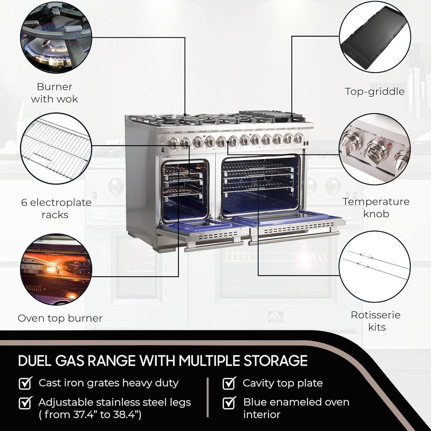 𝐒𝐄𝐓 𝐈𝐍𝐂𝐋𝐔𝐃𝐄𝐒: This Alta Qualita 48″ Dual Fuel Range Professional Style Range is equipped with Cavity Top Plate, 2″ Heat Shield, and Back Splash, Stainless Steel Side Panels, Lower Stainless Decorative Panel, Wok Ring, BBQ Cook Plate Reversible Accessory. Also, the LP Conversion Kit, Rotisserie kit, Power Cord, Reversible Grill, Thermostat, Regulator, and Safety Valves included
