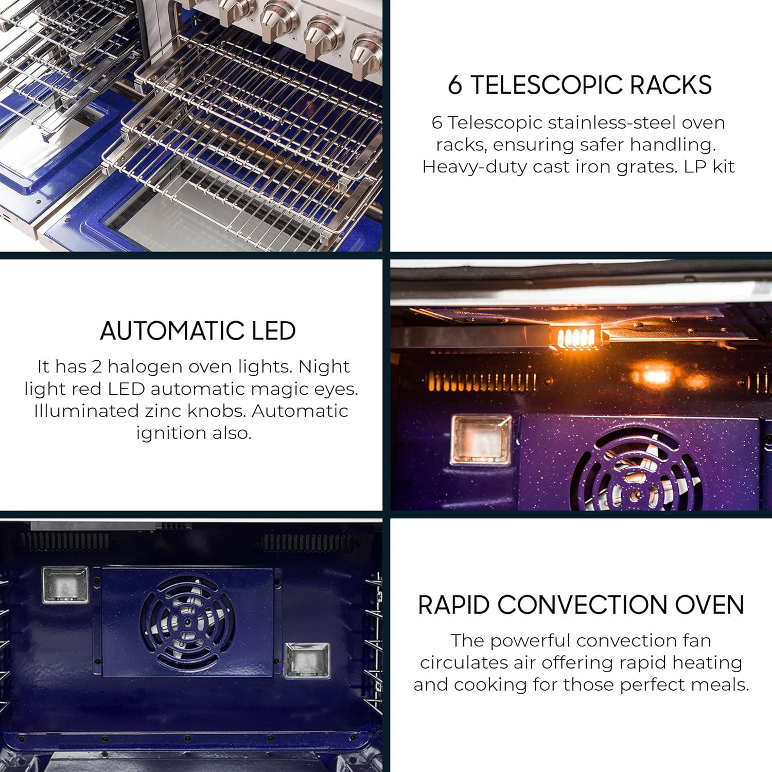 𝐅𝐄𝐀𝐓𝐔𝐑𝐄𝐒: Forno makes this range with 304-grade stainless steel. There are 12 heavy-duty cast zinc knobs that illuminate light temperature indicators, Night Light Red LED Automatic Magic Eyes, FORNO Easy Clean Pro-Style Handle, Adjustable Stainless Steel Legs, Leg Stainless Steel Square Cover, one cast iron grille that is reversible and movable, Automatic Ignition, Soft Door Close, and Fuel Type: Natural Gas Converts to LP