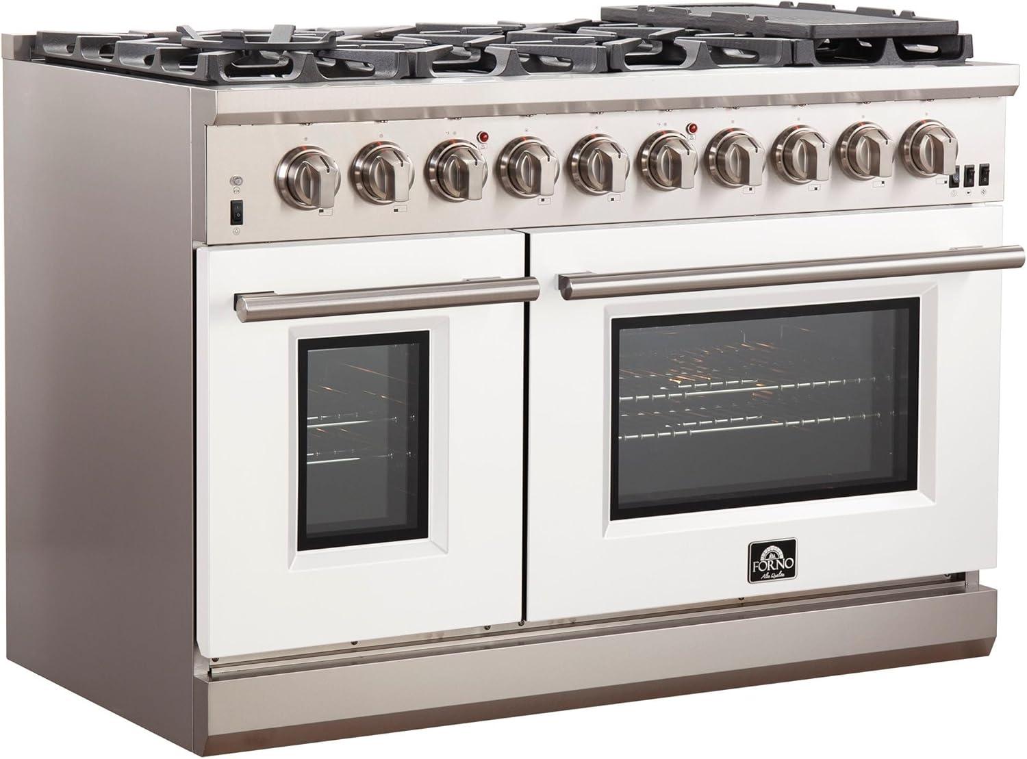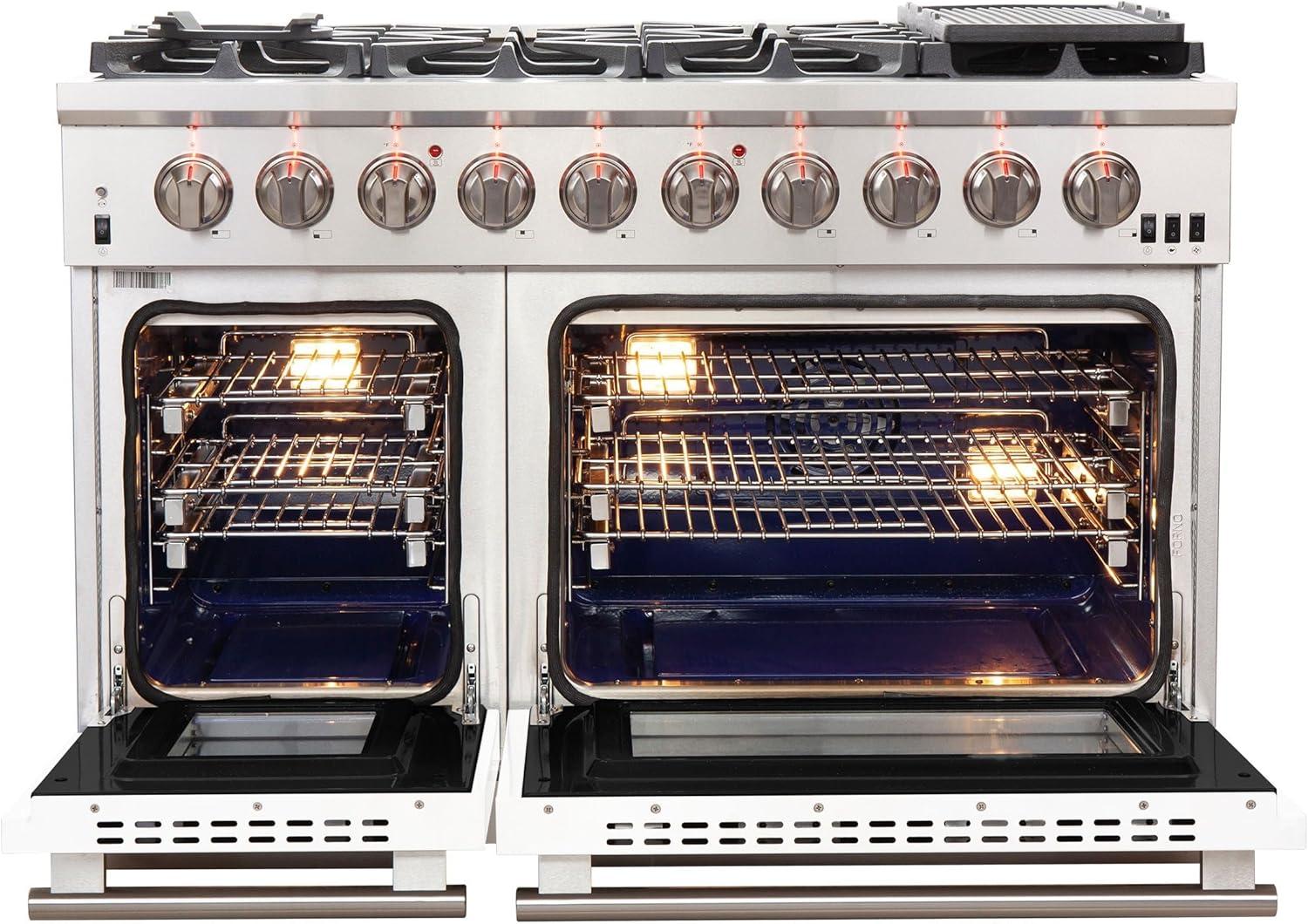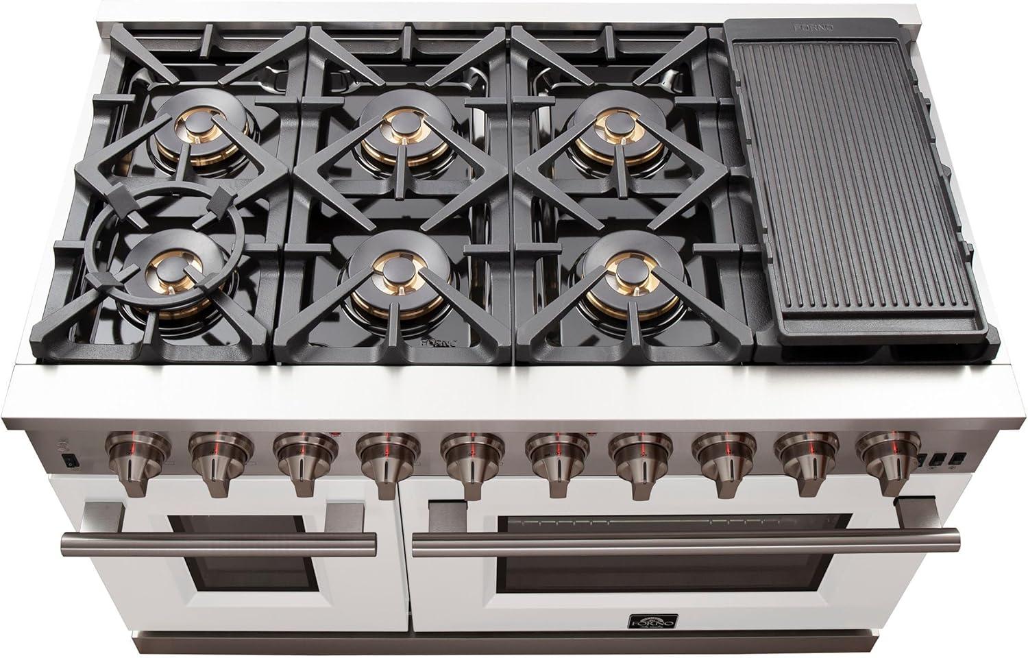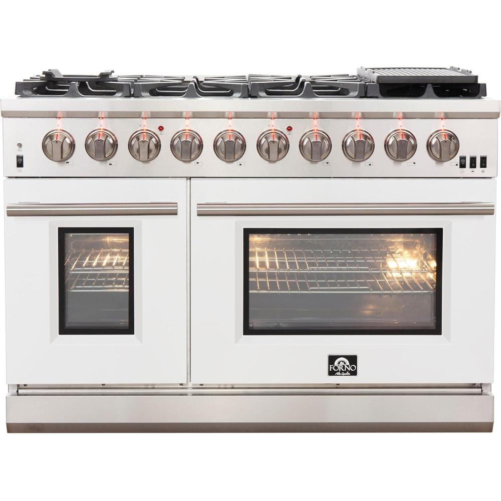 𝐈𝐍𝐂𝐋𝐔𝐃𝐄𝐒: Forno offers this gas range 2 Year Factory Parts and Labor Warranty. Oven Capacity: 30” is 4.32cu. ft & 18” is 2.26cu. ft, 120Volt 60Hz, Circuit Breaker 15 Amps, and ETL listings. This gas range Overall Dimensions (W x D x H) (in): 48” x 28” x 37.4” To 38.4” Range Legs are adjustable by up to 1″ Weight: 366 Lbs and Carton Dimension (W x D x H) (in): 50.87” x 30.39” x 43.58” Gross Weight: 413.36 Lbs