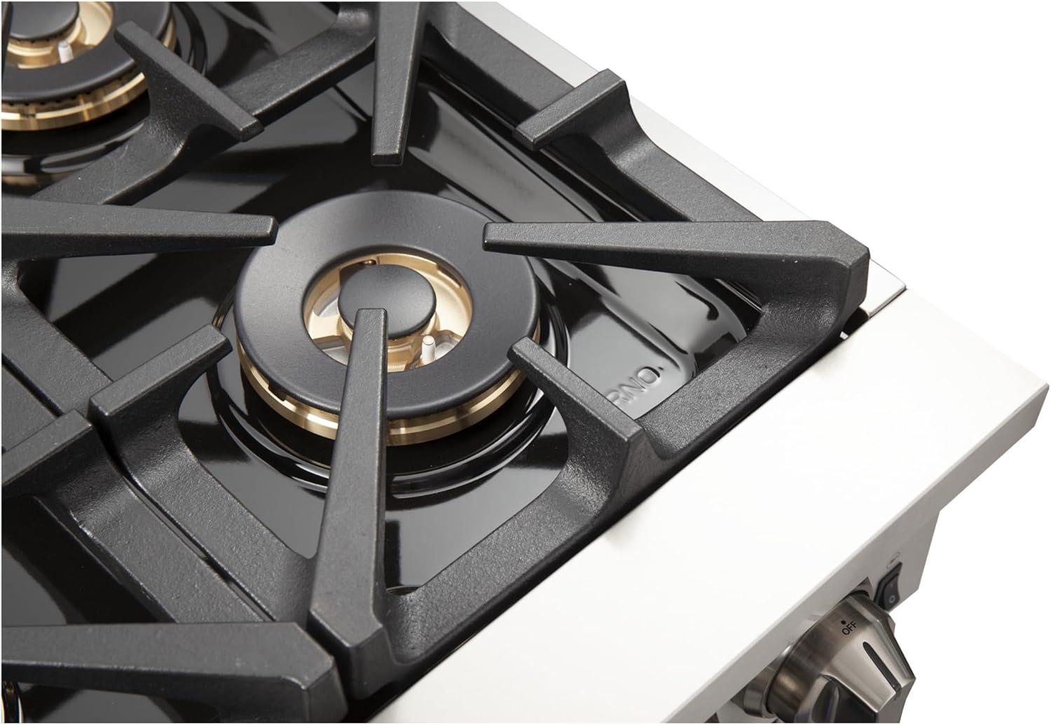 𝐅𝐄𝐀𝐓𝐔𝐑𝐄𝐒: Forno makes this range with 304-grade stainless steel. There are 10 heavy-duty cast zinc knobs that illuminate, Night Light Red LED Automatic Magic Eyes, FORNO Easy Clean Pro-Style Handle, Adjustable Stainless Steel Legs ( from 37.4” to 38.4”), Leg Stainless Steel Square Cover, Automatic Ignition, Fuel Type: Natural Gas Converts to LP, Smudge Resistant, and Soft Door Close