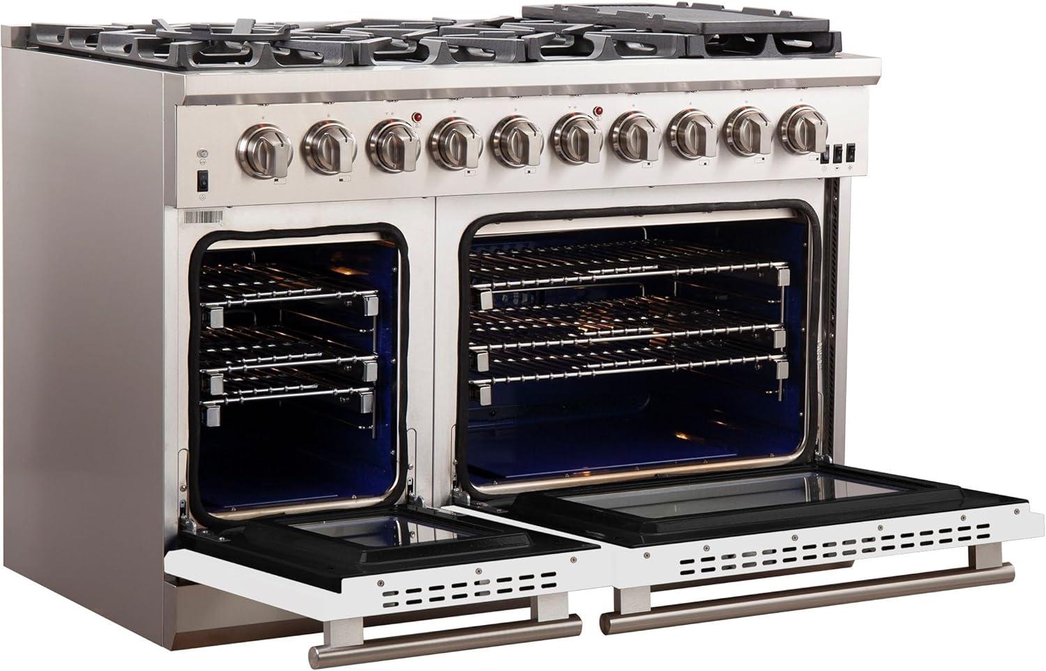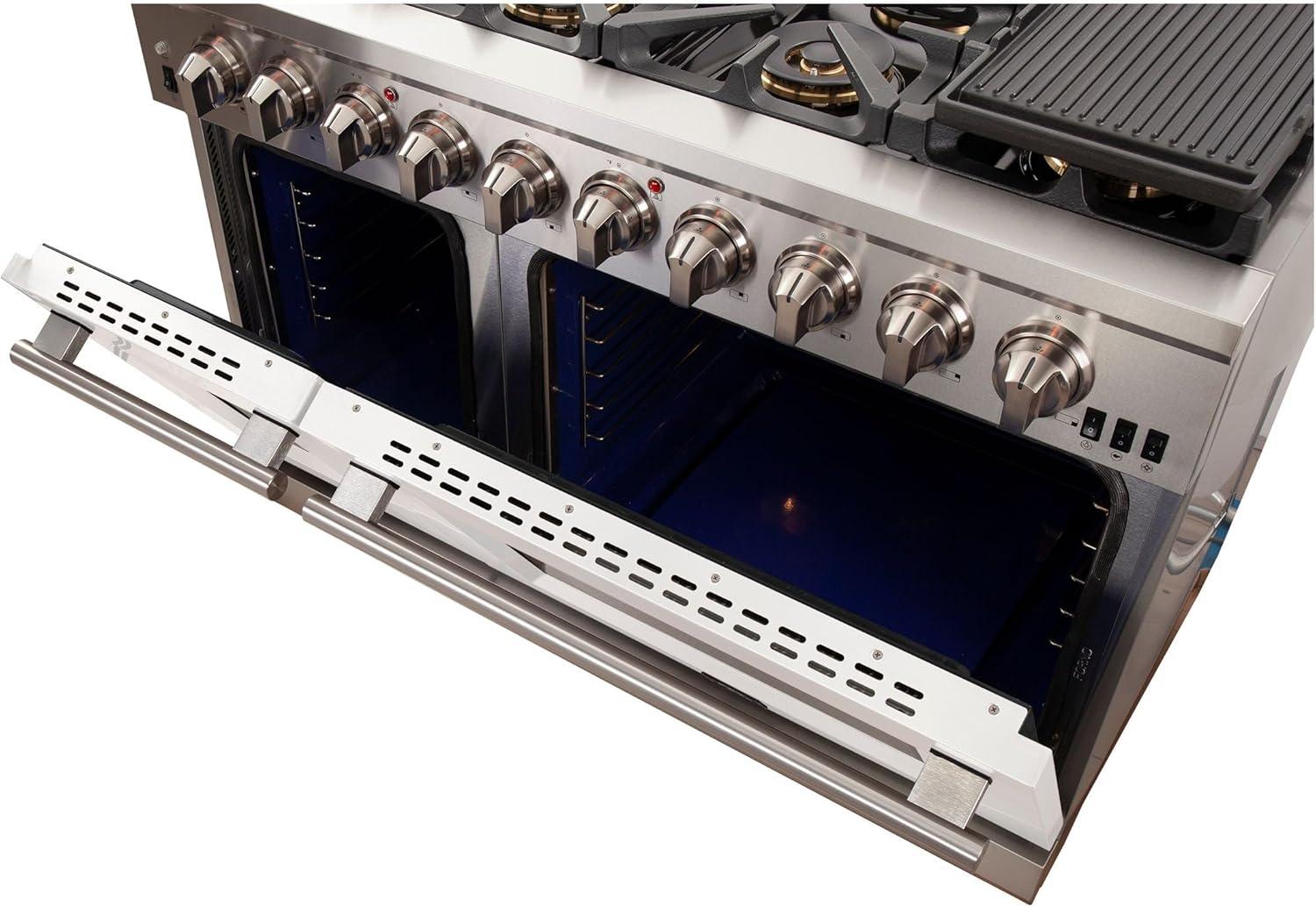 𝐒𝐄𝐓 𝐈𝐍𝐂𝐋𝐔𝐃𝐄𝐒: This Alta Qualita 48″ Gas Range Professional Style Range and convection oven is equipped with 8 Italian Brass Burner, BBQ Cook Plate Reversible Accessory, Cavity Top Plate, Convection Double Oven, 2″ Heat Shield, and Back Splash, Stainless Steel Side Panels, Lower Stainless Decorative Panel. Also, the Rotisserie kit, LP Conversion Kit, Power Cord, Concave Wok Ring, Griddle, Thermostat, Regulator, and Safety Valve included