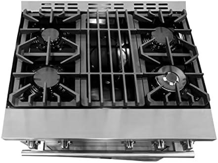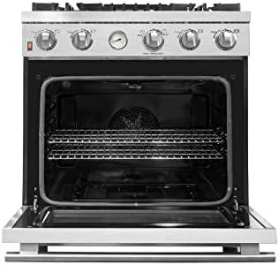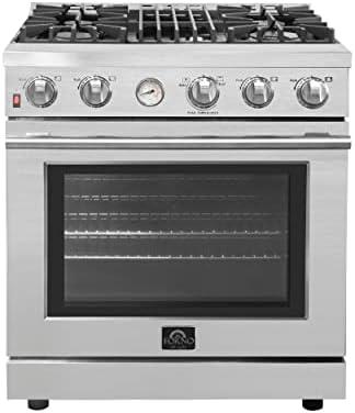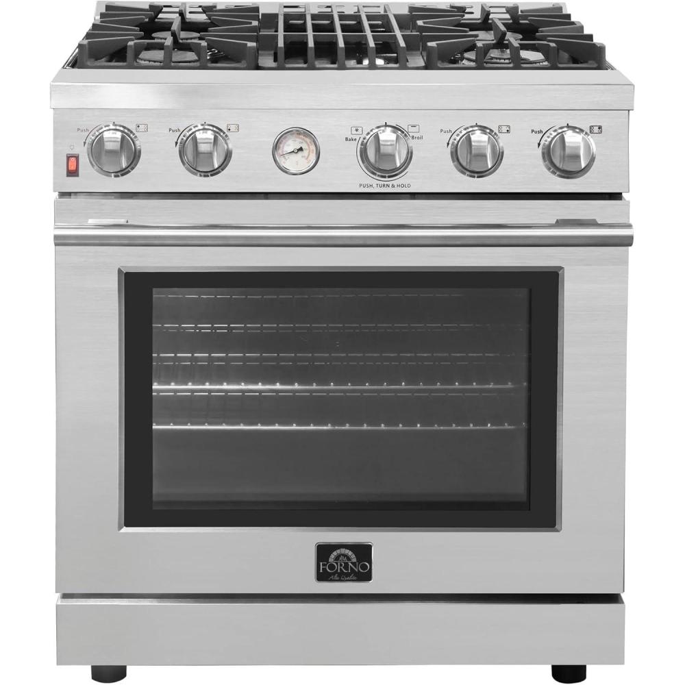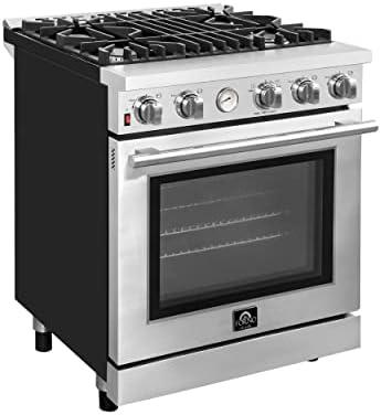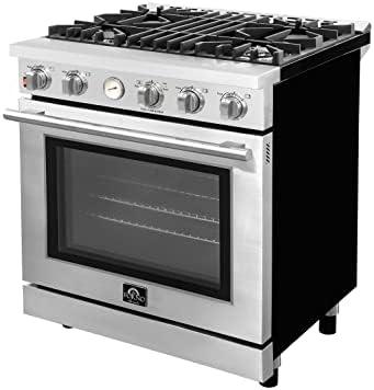 Forno appliances introduce you to the model 6228 gas range 30-inch cooking stove. This model features a massive continuous solid iron cast cooking grill that can support the biggest cooking pots. This range has a large viewing window for this oven. The smooth black enamel subsurface not only looks great but is designed to be easy to clean with no cracks for the crud to collect. The cooking plates are also movable and reversible. The stainless steel hinges are robust and allow for smooth door opening and closing.