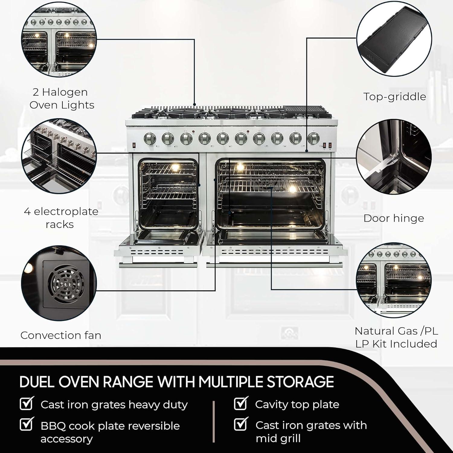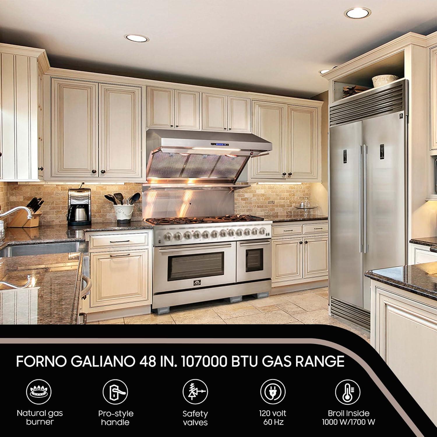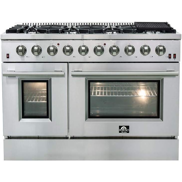 FORNO Galiano 48" Inch All Gas Double Oven Freestanding Gas Range with 8 Sealed Burners Cooktop 107,000 BTU and 6.58 Cu. Ft. Double Convection Oven - Stainless Steel Cast Iron Grates.