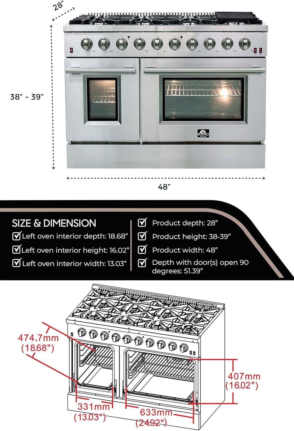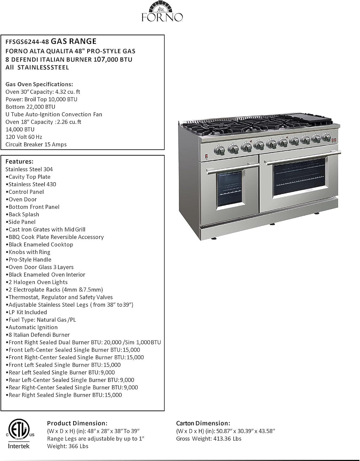 𝐈𝐍𝐂𝐋𝐔𝐃𝐄𝐒: Forno offers this gas range 2 Year Factory Parts and Labor Warranty. The 48″ gas range and oven Overall Capacity is 6.58 cubic feet, 15 Amperage, 120 Voltage 60Hz, and ETL listings. The gas range Overall Dimensions (W x D x H) (in): 48” x 28” x 38”To 39” Range Legs are adjustable by up to 1″ 366 lbs and Carton Dimension (W x D x H) (in): 50.87” x 30.39” x 43.58” 413.36 lbs