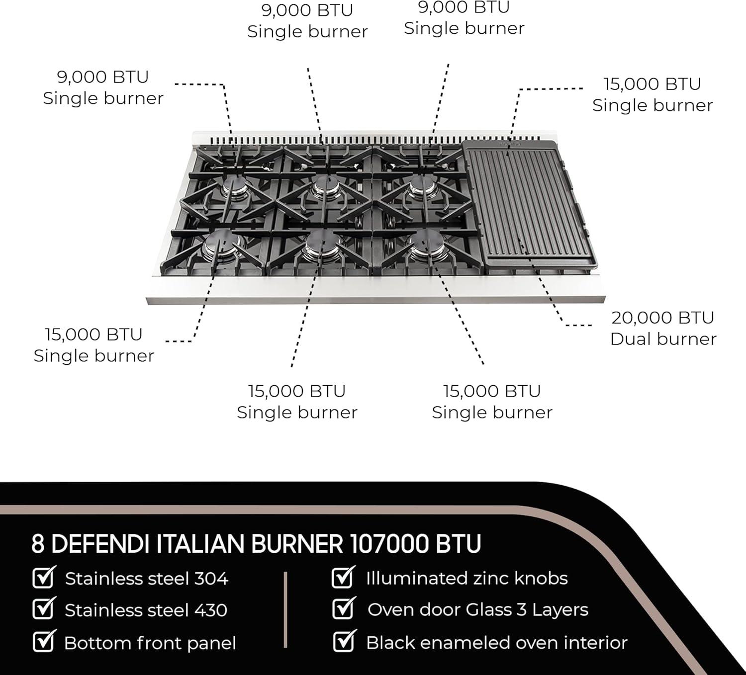 𝐂𝐎𝐎𝐊𝐓𝐎𝐏: 8 Sealed Brass Burners, 107,000 BTU Total Stove-Top Output, One 20,000 BTU Max and 1,000 BTU Min. Dual Ring Burner For Maximum Cooking Control, Black Matte Cast Iron Continuous Burner Grates, Black Enamel Surface Plate for Easy Clean, Auto Flame Re-ignition on Surface Burners. Front Right-Center Left-Center, Left Sealed Single Burner output 15,000 BTU, Rear Right Sealed Single Burner Output 15,000 BTU, Rear Right-Center Left-Center and Left Sealed Single Burner Output 9,000 BTU