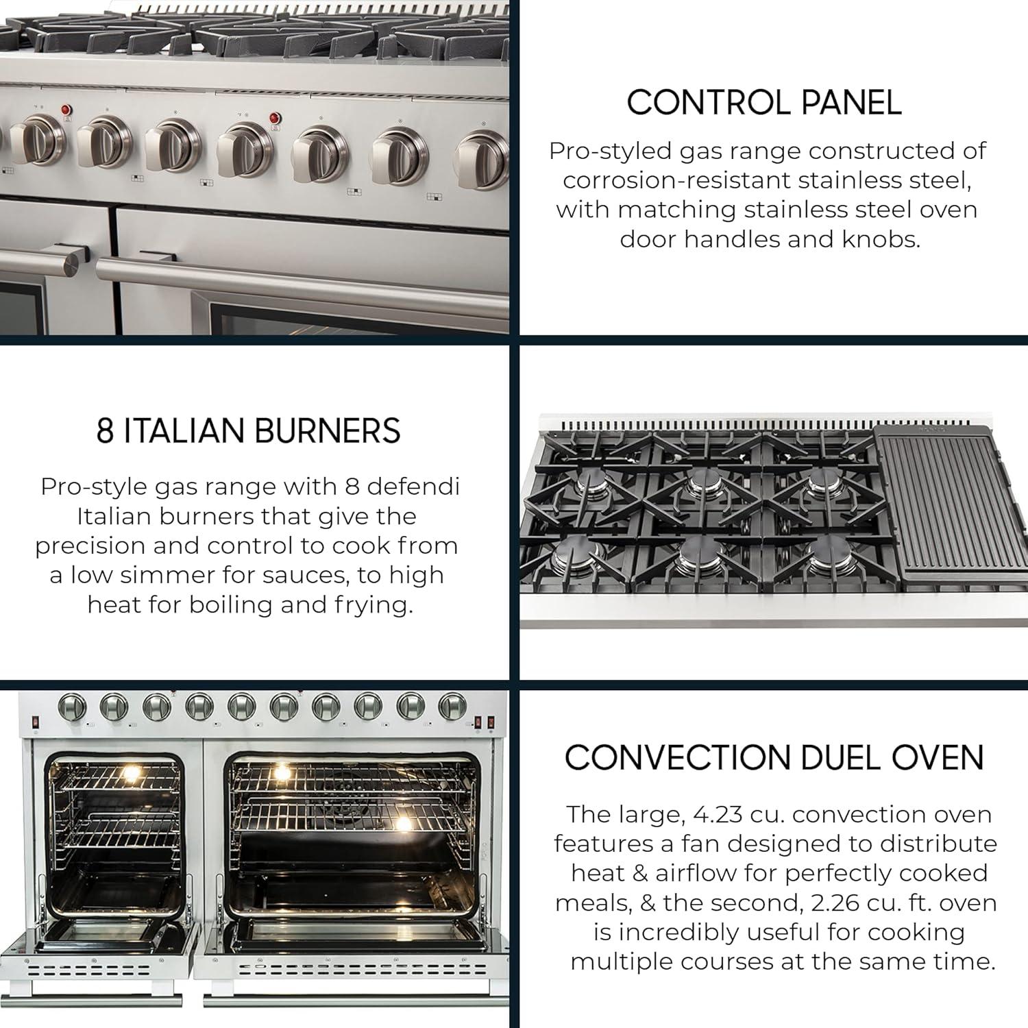 FORNO Capriasca Full Gas 48″ Inch. Freestanding Range with 8 Sealed Burners Cooktop – 6.58 Cu.Ft. Double Gas Convection Oven Capacity, Stainless Steel Heavy Duty Cast Iron Grates.
