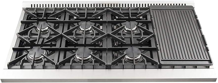 𝐅𝐄𝐀𝐓𝐔𝐑𝐄𝐒: Forno makes this range with 430-grade stainless steel. There are 10 heavy-duty Illuminated Zinc Cast Knobs, Cast-iron griller that is reversible and also movable, FORNO Easy Clean Pro-Style Handle, Adjustable Stainless Steel Legs ( from 38” to 39”), Smudge Resistant, Soft Door Close, Fuel Type: Natural Gas Converts to LP