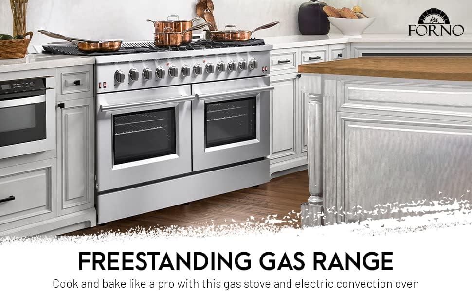 𝐅𝐄𝐀𝐓𝐔𝐑𝐄𝐒: Forno makes this range with 430-grade stainless steel. There are 12 cast zinc metal knobs that will last and look great for the range easy to-locate cooking switches. This range includes two cook plates for grilling and for making flatbreads and pancakes right in your kitchen. The cook plates are also movable and reversible. This range has Adjustable Legs, Pro-Style Handle, Soft Door Close, and Smudge Resistant