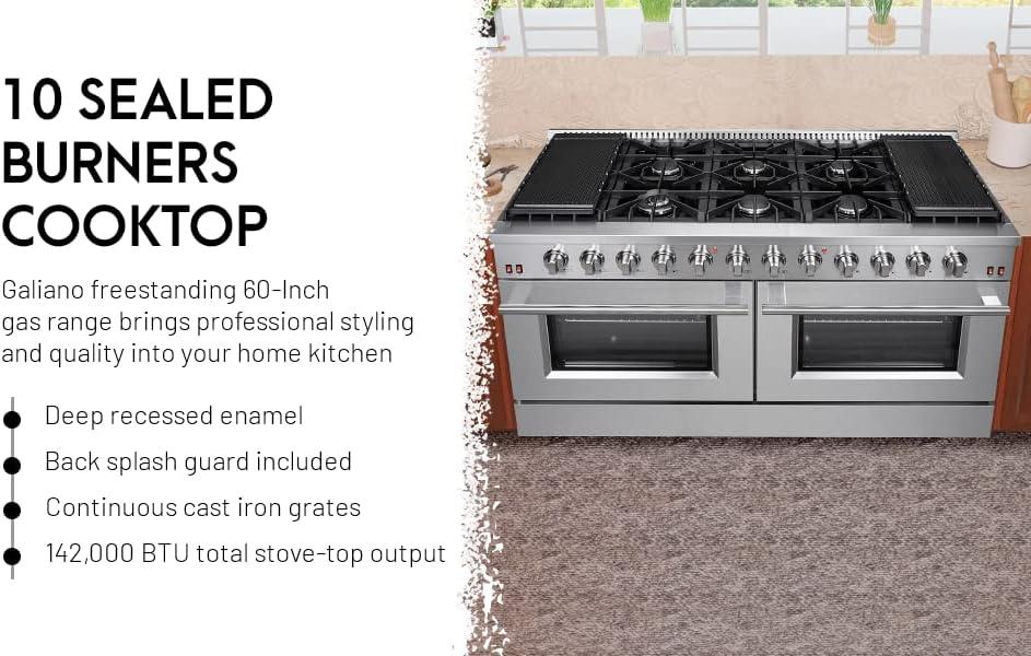 𝐂𝐎𝐎𝐊𝐓𝐎𝐏: This model features a massive continuous solid iron cast cooking grill that will be able to support the biggest cooking pots. 10 Italian-made burners provide cooking flexibility from as low as 1000 BTU simmer for sauces to 20,000 BTU. Front Right, Mid, and Left Single Burner Output 15,000 BTU, Rear Left, Mid, and Right Center Sealed Single Burner Output 9,000 BTU, and Rear Left Center, Right Sealed Single Burner Output 15,000 BTU