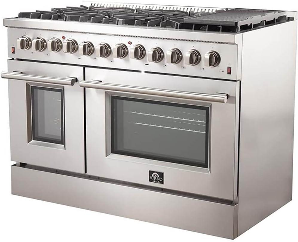 𝐈𝐍𝐂𝐋𝐔𝐃𝐄𝐒: Forno offers this Dual Fuel Electric Oven Range 2 Year Factory Parts and Labor Warranty. The 48″ range and oven Overall Capacity is 6.58 cubic feet, Circuit breaks 40 Amp, 240 Voltage 60Hz, and ETL listings. The Dual Fuel range Overall Dimensions (W x D x H) (in): 48” x 28” x 38”To 39” Range Legs are adjustable by up to 1″ Weight: 366 Lbs and Carton Dimension (W x D x H) (in): 50.87” x 30.39” x 43.58” Gross Weight: 413.36 Lbs