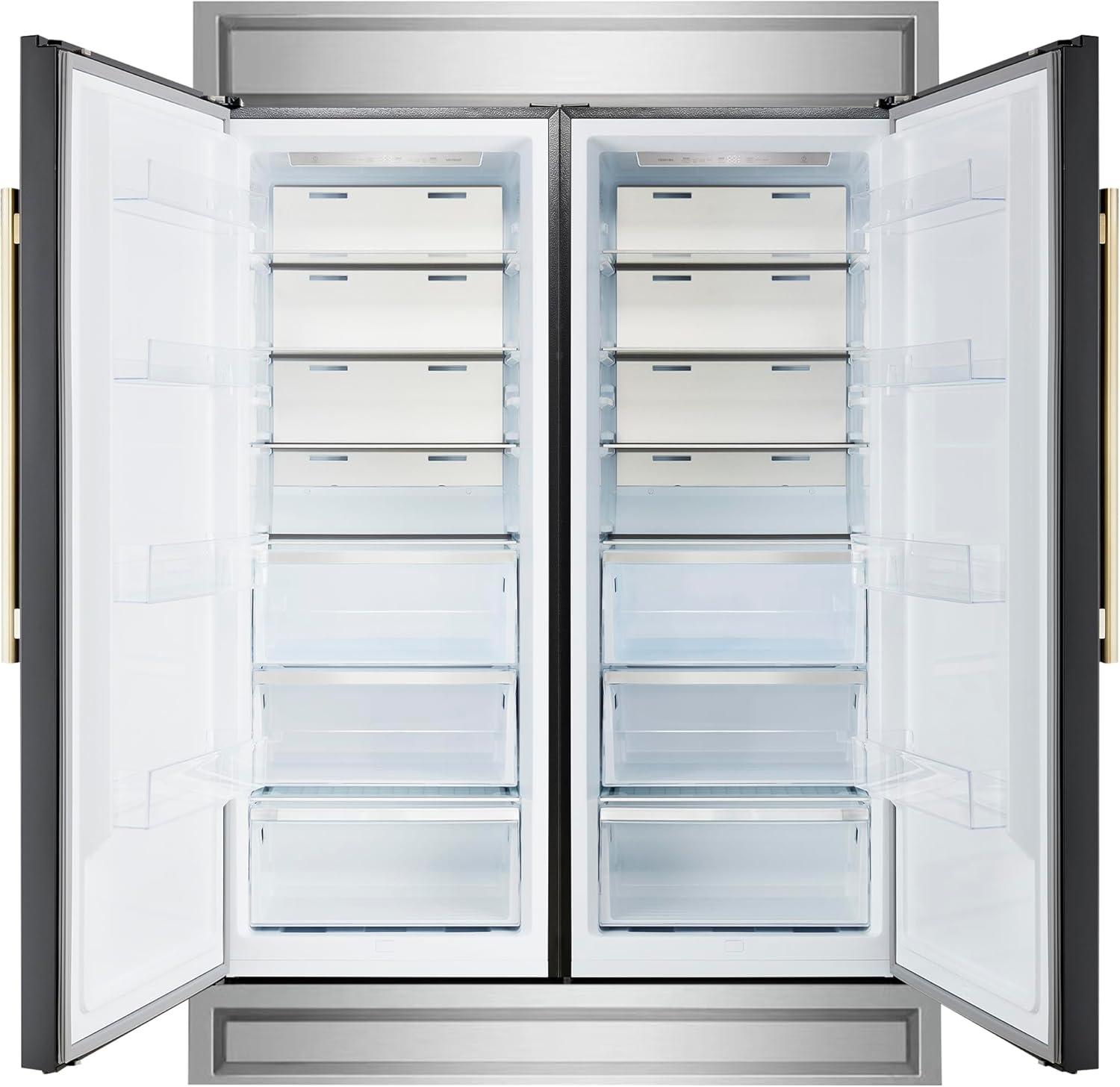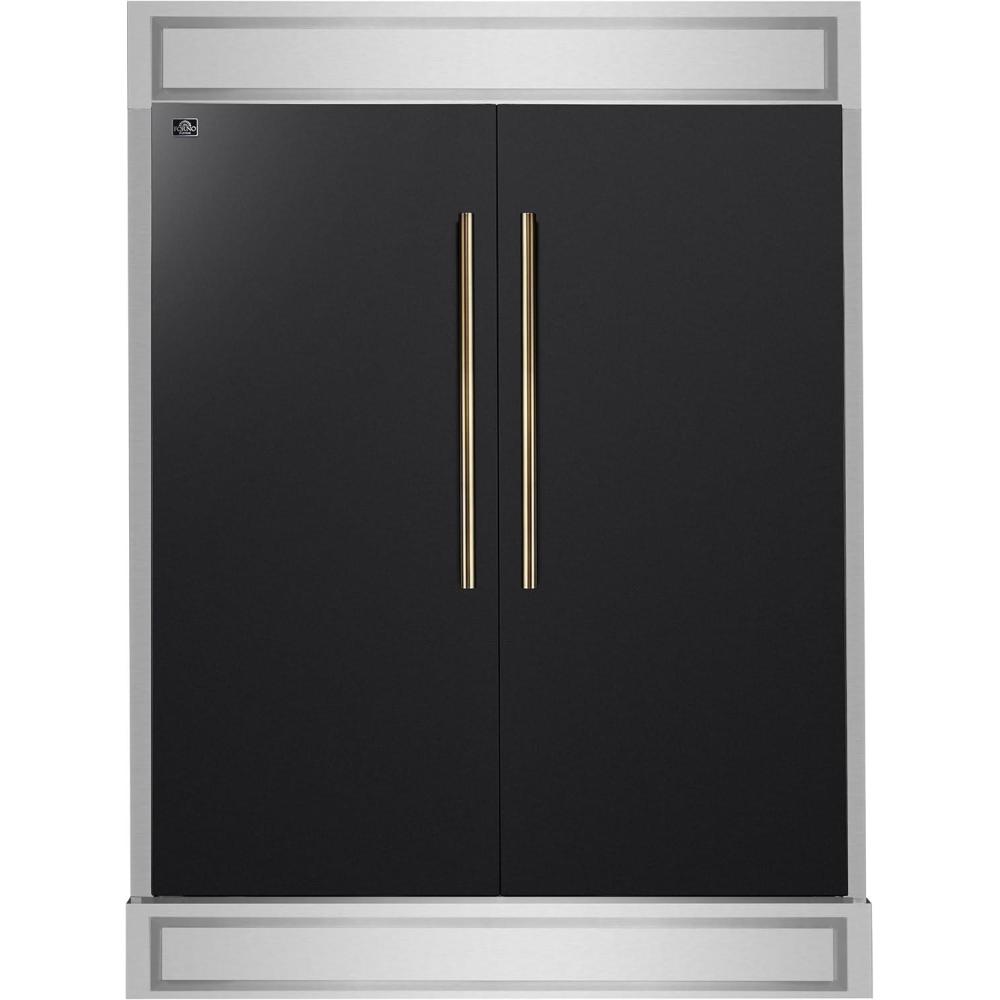 The Forno Maderno 60-Inch Refrigerator Freezer Combo delivers a bold, premium built-in look by combining two 28-inch units with a sleek trim kit for seamless side-by-side installation. Finished in black with antique brass handles from our distinguished Espresso line, it makes a striking statement in any modern kitchen. With an impressive 27.2 cu. ft. total capacity, this refrigerator is designed for large households, entertainers, or anyone who needs maximum storage. Convertible Cooling Zones let you switch between refrigerator and freezer modes for flexible storage, while Total No-Frost technology eliminates icy build-up and ensures low-maintenance convenience. Inside, the Maderno offers exceptional organization with six tempered glass shelves with silver trims, six storage drawers, and bright LED lighting that keeps every item visible and easy to access. The sleek digital control panel makes temperature adjustments effortless, while VCM-coated doors and a durable metal back panel provide strength, longevity, and a fingerprint-resistant finish. Product Details: Dimensions (W x D x H): 55.2″ x 26.9″ x 67.1″ Overall Weight: 330 lbs Experience confidence with FORNO’s 2-Year Warranty, covering both parts and labor. Built for durability, style, and performance, the Maderno is a refrigerator you can rely on.