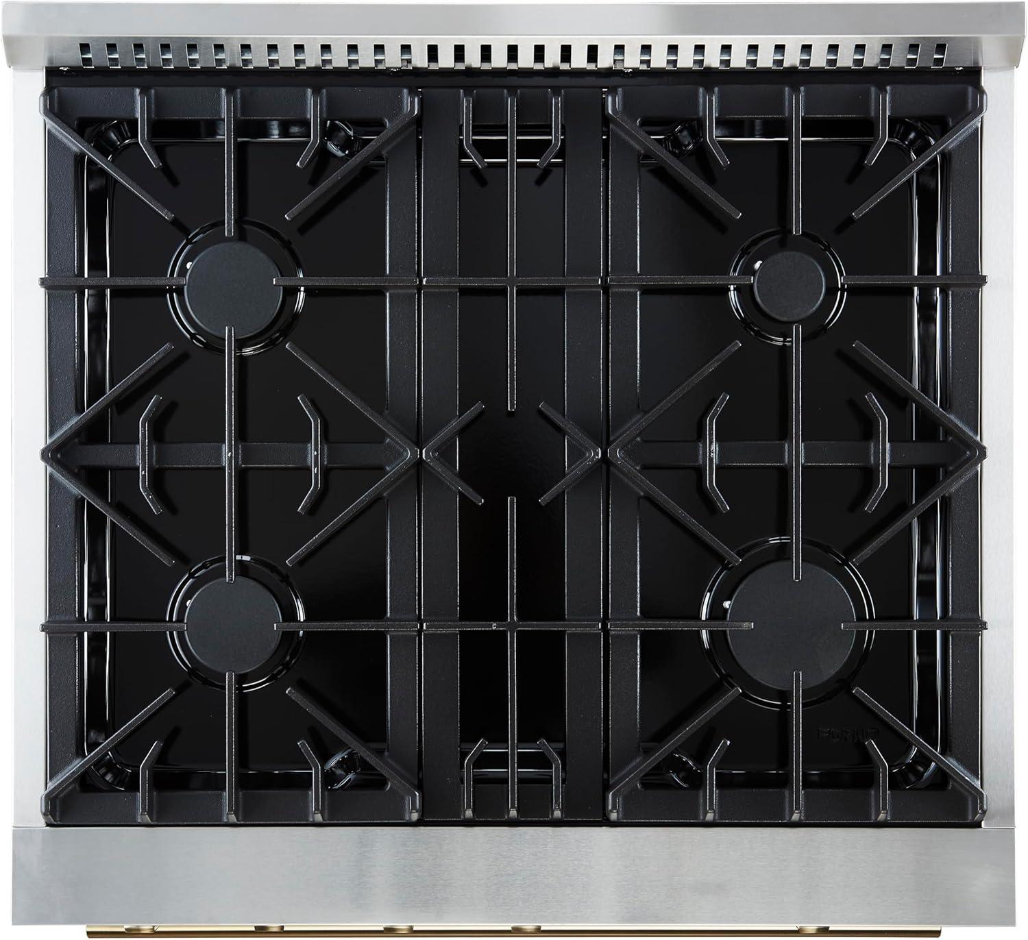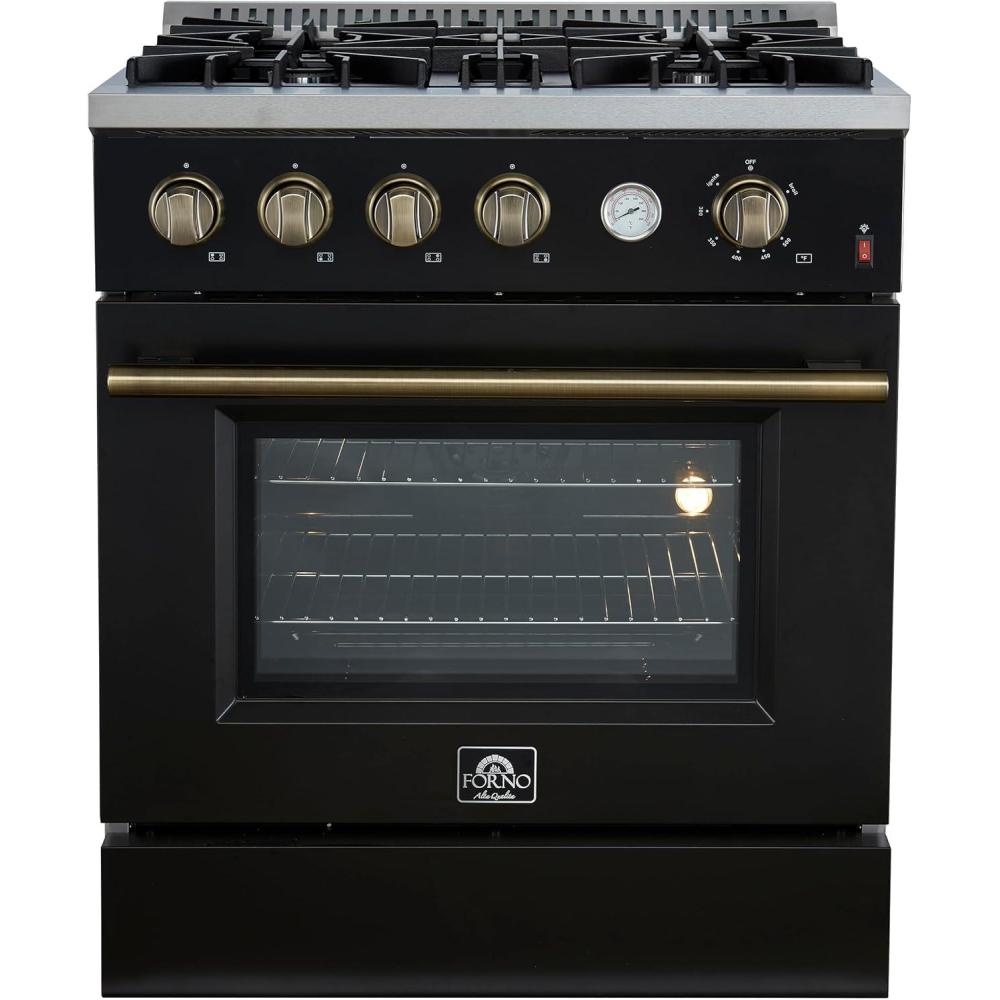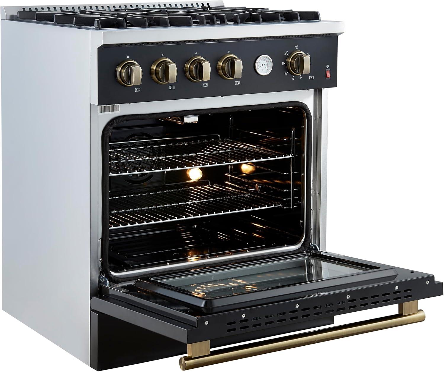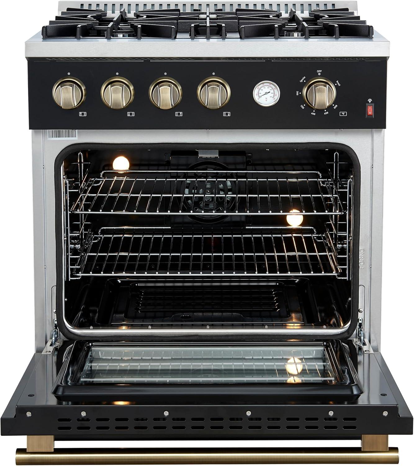 Bring professional performance and timeless elegance into your kitchen with the Marco 30-Inch Alta Qualità Gas Range in Black with Antique Brass Accents. Designed for passionate home chefs, this freestanding gas range combines durability, precision, and style to elevate every cooking experience. Featuring four sealed burners with a total output of 37,000 BTU, this range delivers the flexibility you need for any recipe. The burners include a dedicated 4,000 BTU simmer burner for delicate sauces, a 15,000 BTU dual-ring burner for high-heat searing or rapid boiling, and two 9,000 BTU burners for everyday cooking. Heavy-duty cast iron grates provide stable cookware support while allowing smooth movement across the cooktop, and the recessed black enamel surface captures spills for hassle-free cleanup. At the heart of this range is a spacious 4.32 cu.ft. convection oven powered by a 26,000 BTU bake and broil system. Whether you’re baking cookies, roasting a whole chicken, or preparing gourmet dishes, convection technology ensures even heating and consistent results every time. The black enamel oven interior resists stains and pairs with two halogen lights for clear visibility, while the adjustable oven racks easily fit pans up to 24” wide by 15” deep. Designed with both function and beauty in mind, the Marco 30″ Gas Range features a sleek black finish with antique brass knobs and handles, framed by stainless steel for a bold, sophisticated look. A built-in temperature gauge provides accurate monitoring, while the smooth door hinges and layered glass window enhance safety and convenience. With adjustable legs to match counter heights between 35.5”–36.5”, this range seamlessly integrates into your kitchen. Upgrade your cooking space with the Marco 30” Gas Range—a perfect blend of performance and durability. Product Overall Dimensions W x D x H: 30″ x 29″ x 37″ Product Overall Weight (lbs): 168.00