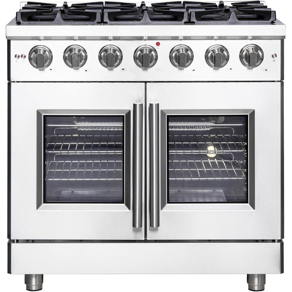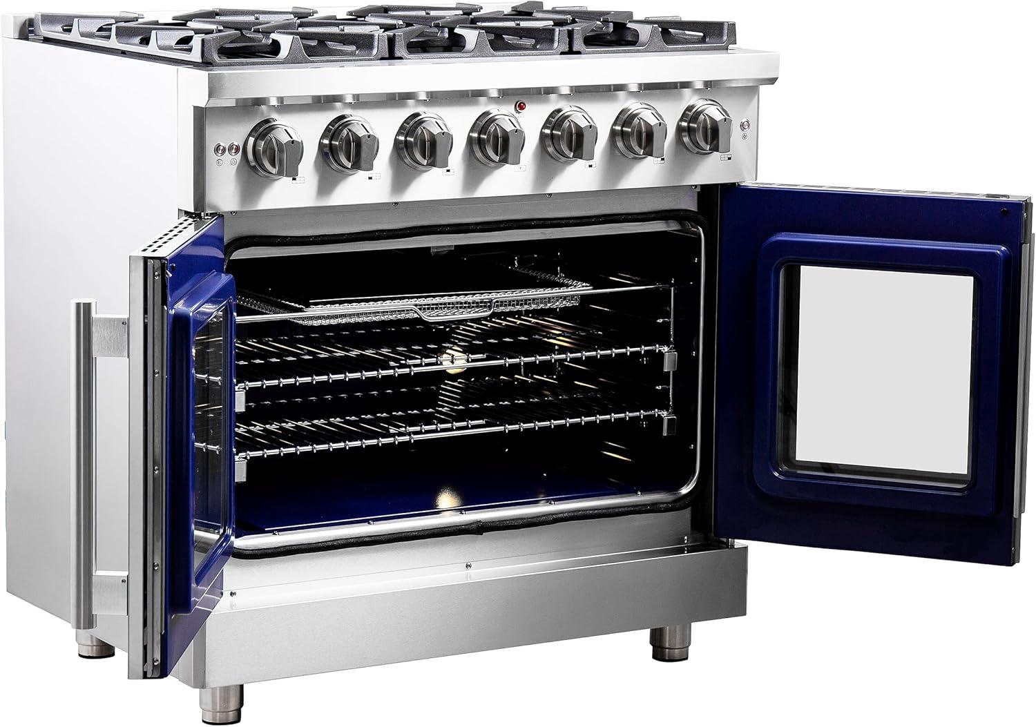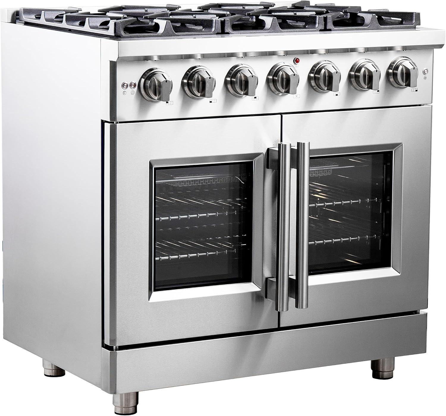 Experience the fusion of professional-grade performance and sleek design with the Forno Massimo 36-inch French Door Gas Range. This feature-packed appliance transforms your home kitchen into a culinary haven, boasting functionality and style in equal measure. The 20,000 BTU dual-ring brass burner, offers exceptional versatility. Heavy-duty, continuous cast iron grates provide a stable and secure foundation for your cookware. The 5.36 cubic foot convection oven boasts a spacious interior with a speckled blue enamel finish. A 3-layer glass oven door not only adds a touch of sophistication but also allows you to monitor your dishes without constantly opening the door and letting heat escape. The Forno Massimo 36-inch French Door Gas Range is a powerful and versatile appliance and with its spacious capacity, powerful burners, versatile cooking modes, and user-friendly features, this range is sure to inspire culinary creativity and elevate your cooking experience.
