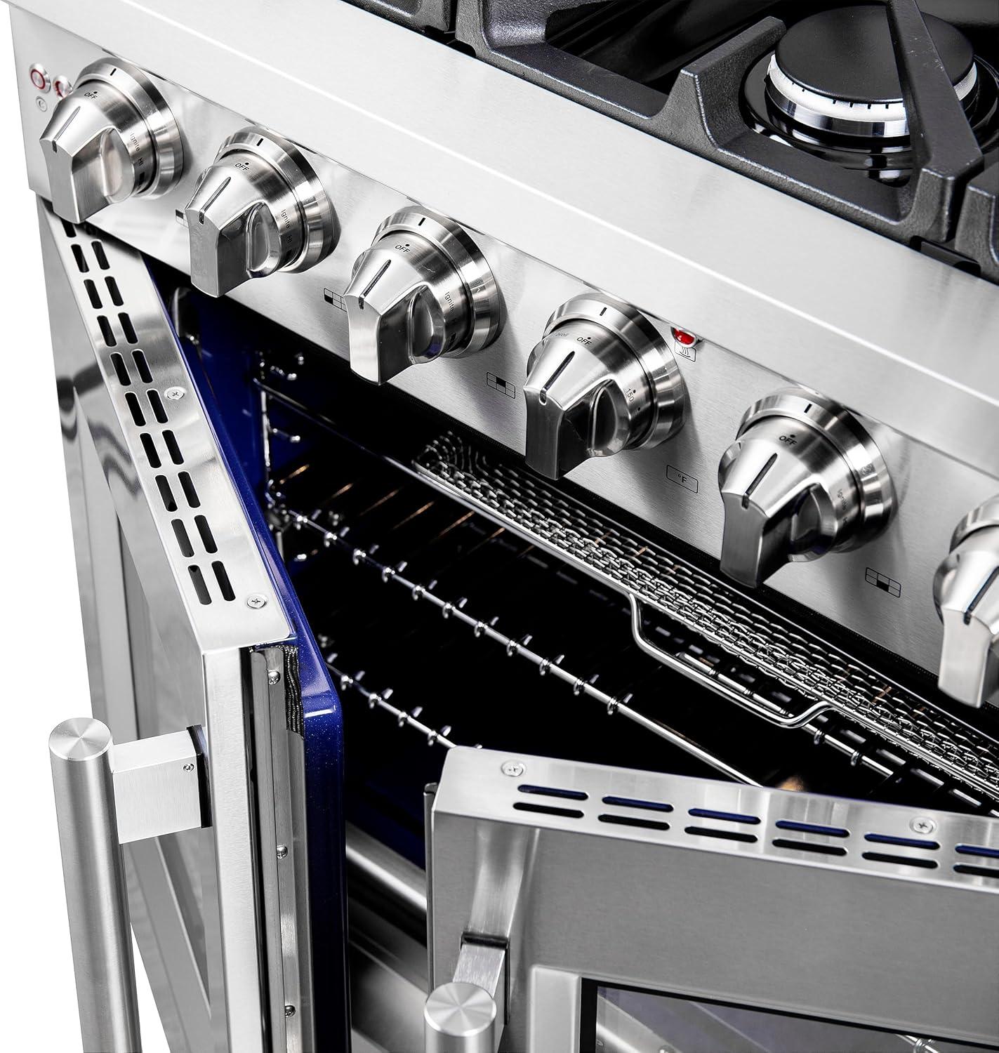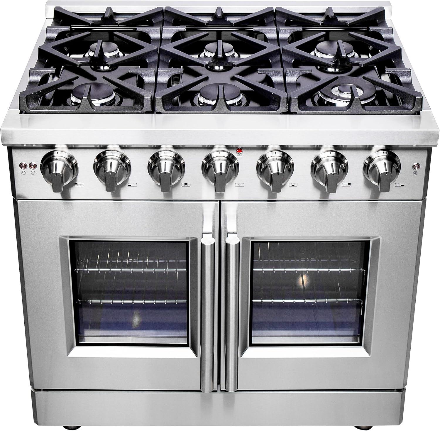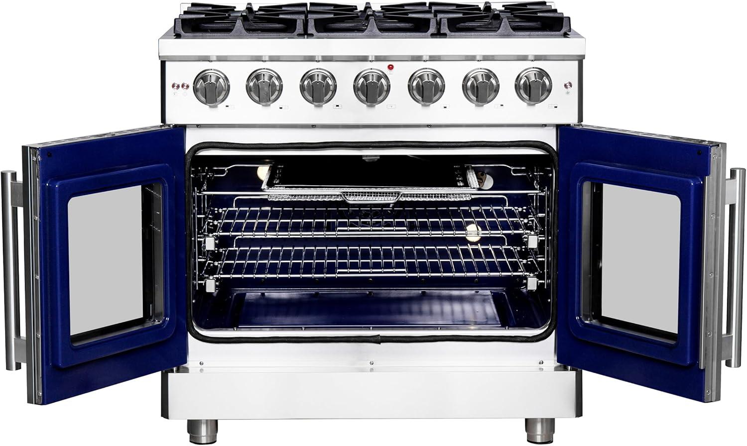 Experience the fusion of professional-grade performance and sleek design with the Forno Massimo 36-inch French Door Gas Range. This feature-packed appliance transforms your home kitchen into a culinary haven, boasting functionality and style in equal measure. The 20,000 BTU dual-ring brass burner, offers exceptional versatility. Heavy-duty, continuous cast iron grates provide a stable and secure foundation for your cookware. The 5.36 cubic foot convection oven boasts a spacious interior with a speckled blue enamel finish. A 3-layer glass oven door not only adds a touch of sophistication but also allows you to monitor your dishes without constantly opening the door and letting heat escape. The Forno Massimo 36-inch French Door Gas Range is a powerful and versatile appliance and with its spacious capacity, powerful burners, versatile cooking modes, and user-friendly features, this range is sure to inspire culinary creativity and elevate your cooking experience.
