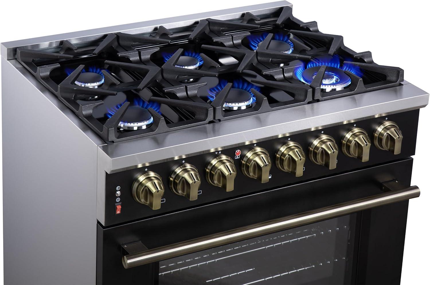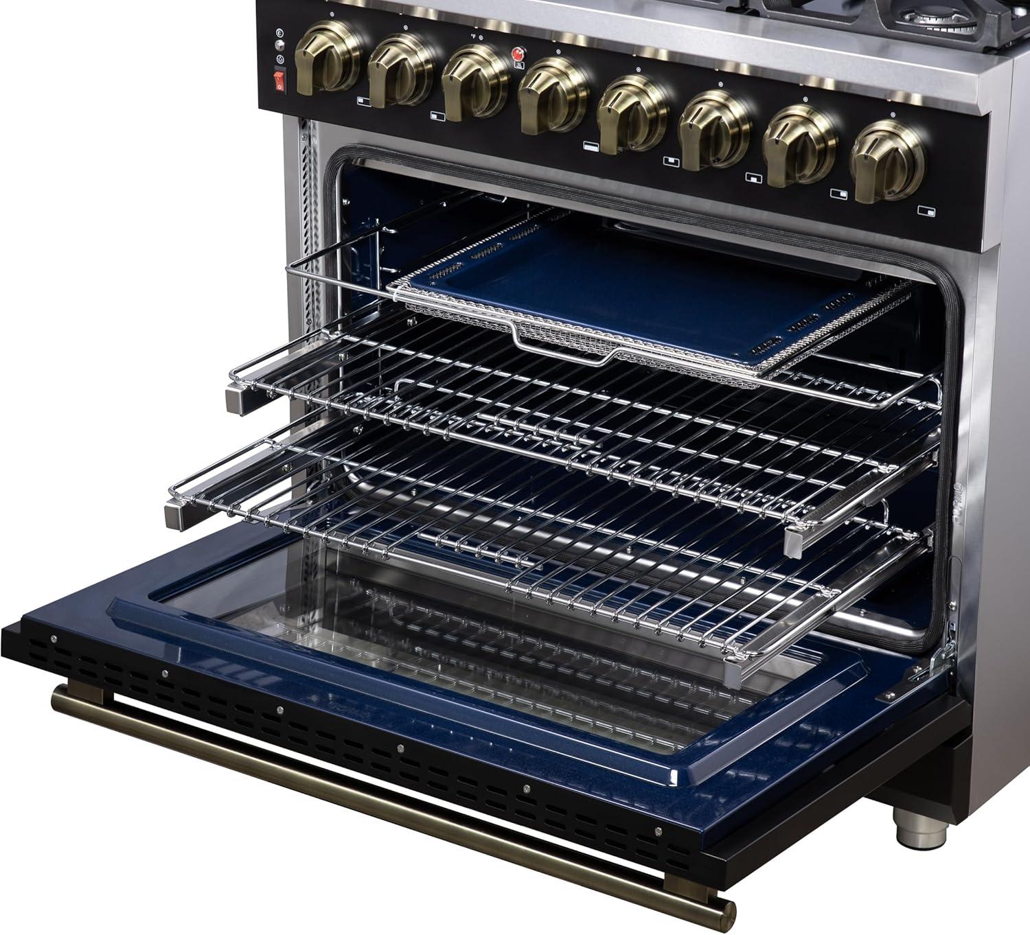 Premium Design & Flexible Installation – Finished in sleek white with antique brass trim and handles, the range brings timeless style to your kitchen. Designed for freestanding or built-in installation, with a spacious 5.36 cu. ft. oven and a durable speckled blue enamel interior that resists stains.