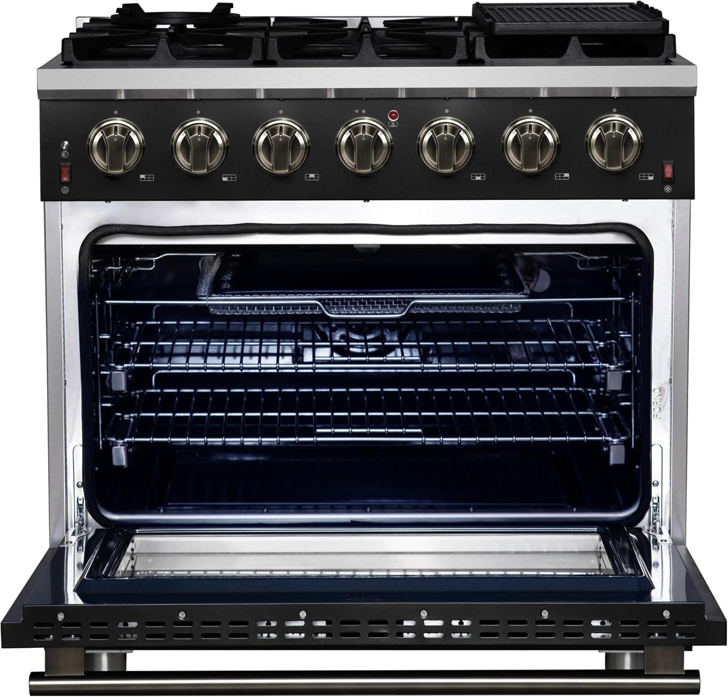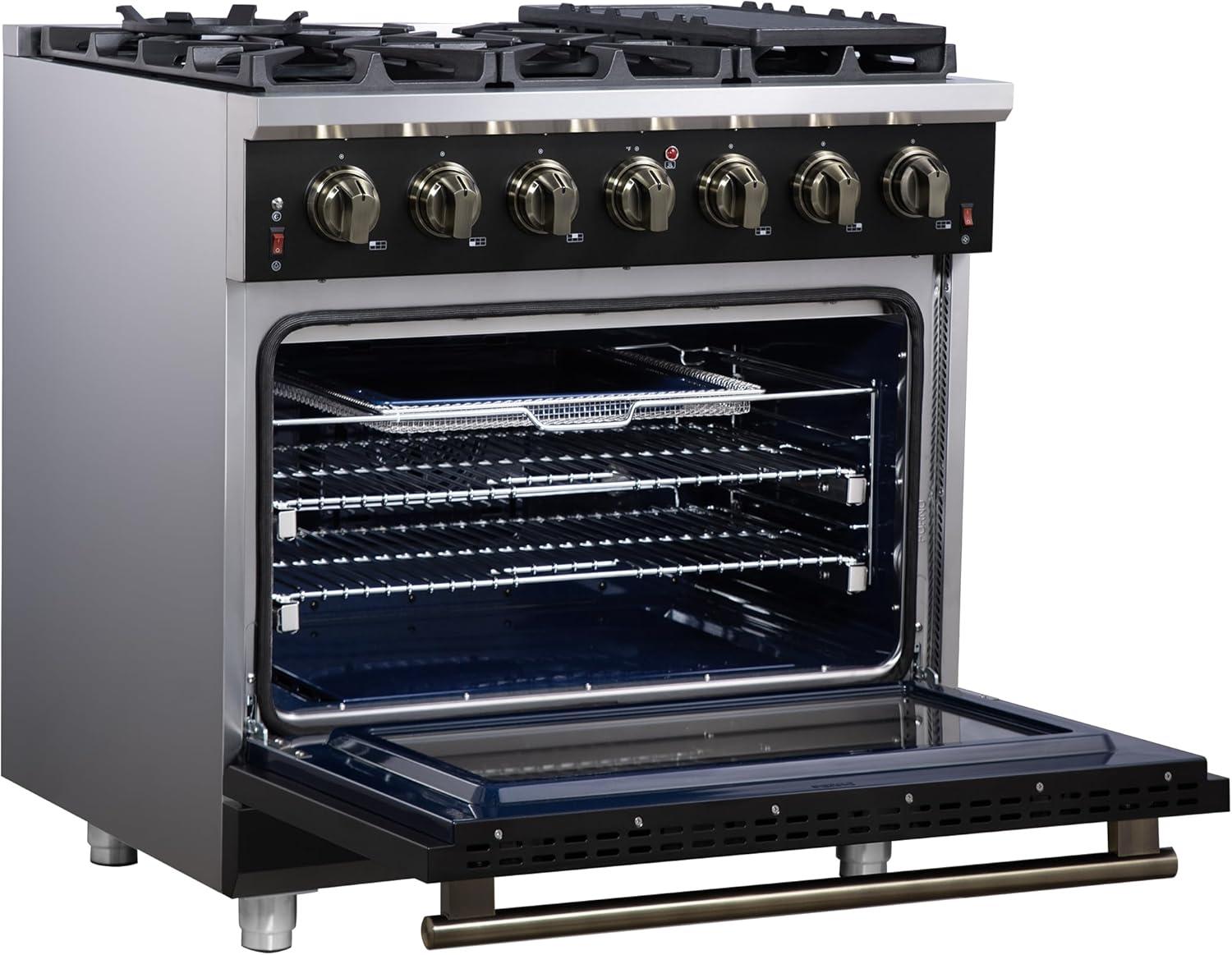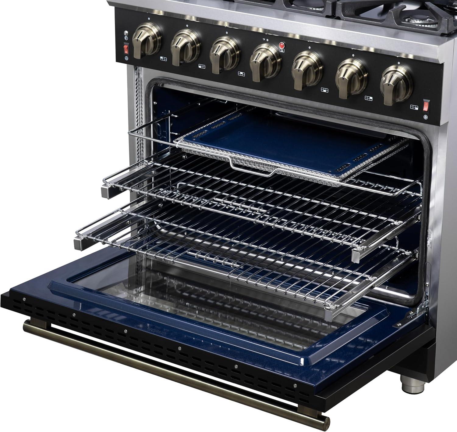 Professional Design with Antique Brass Details – Features pro-style handles, illuminated zinc-coated control knobs, smooth friction hinges, and adjustable legs for a refined, functional kitchen centerpiece.