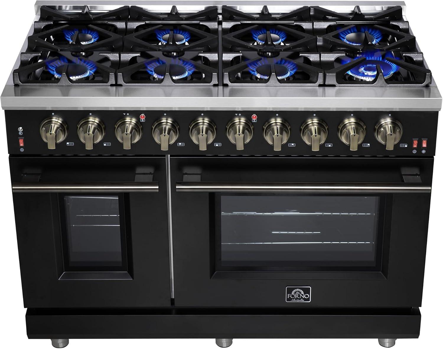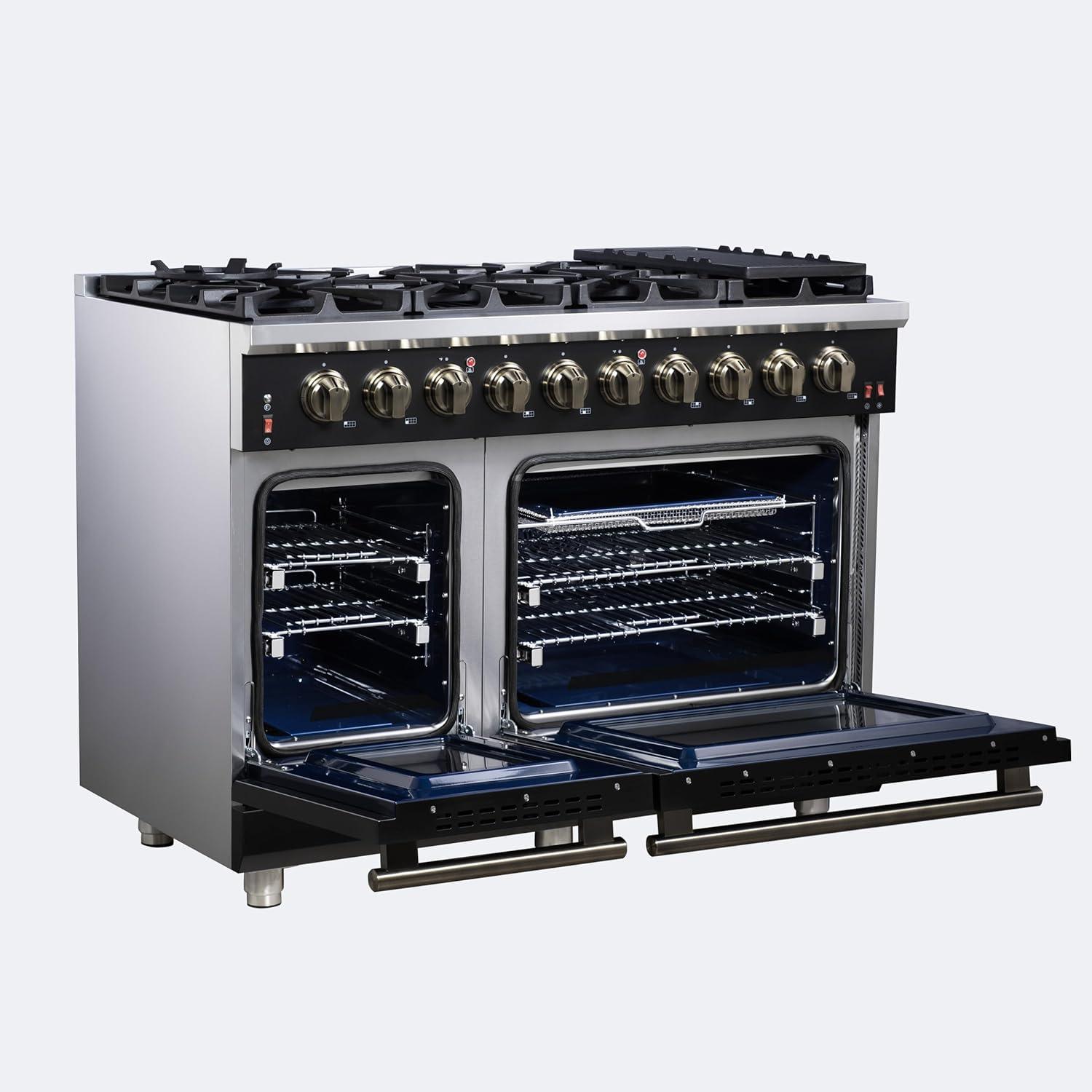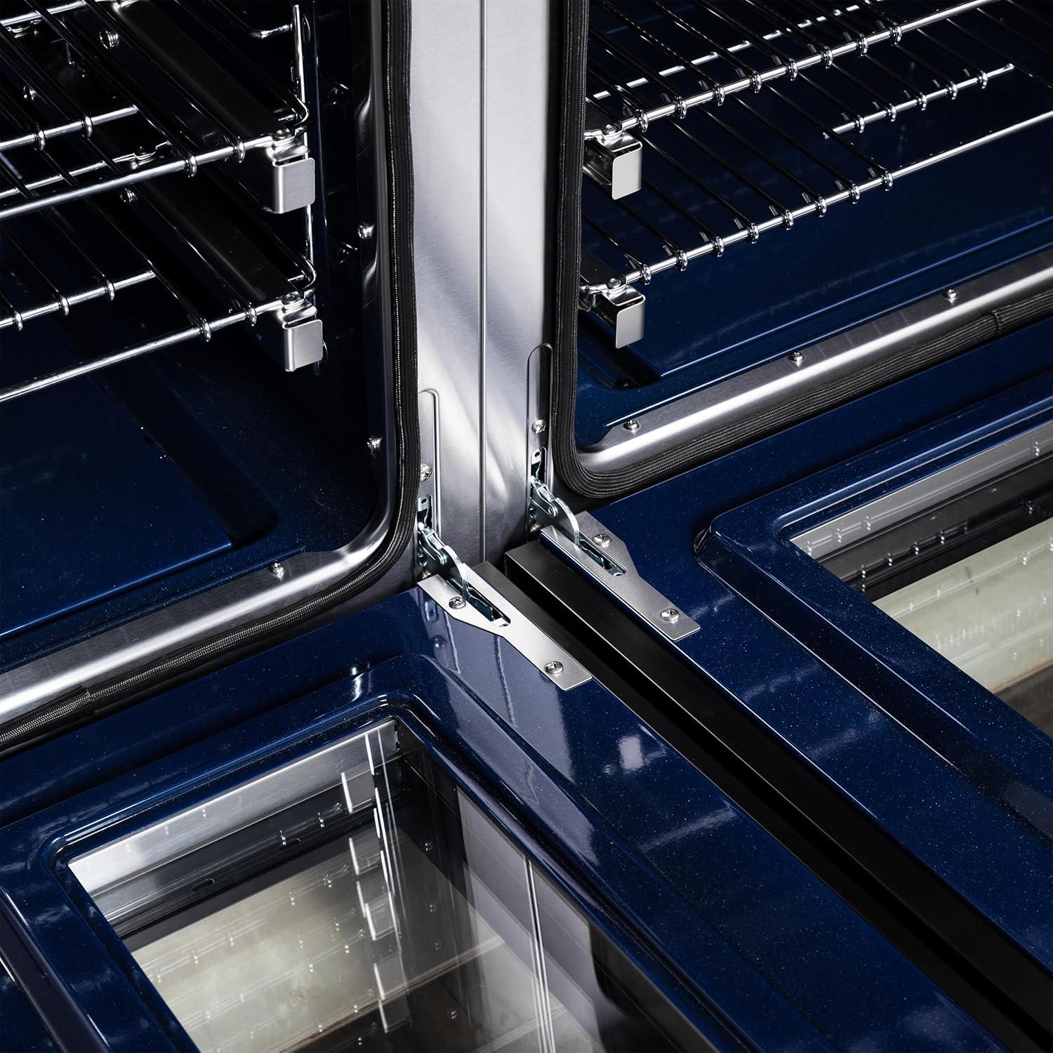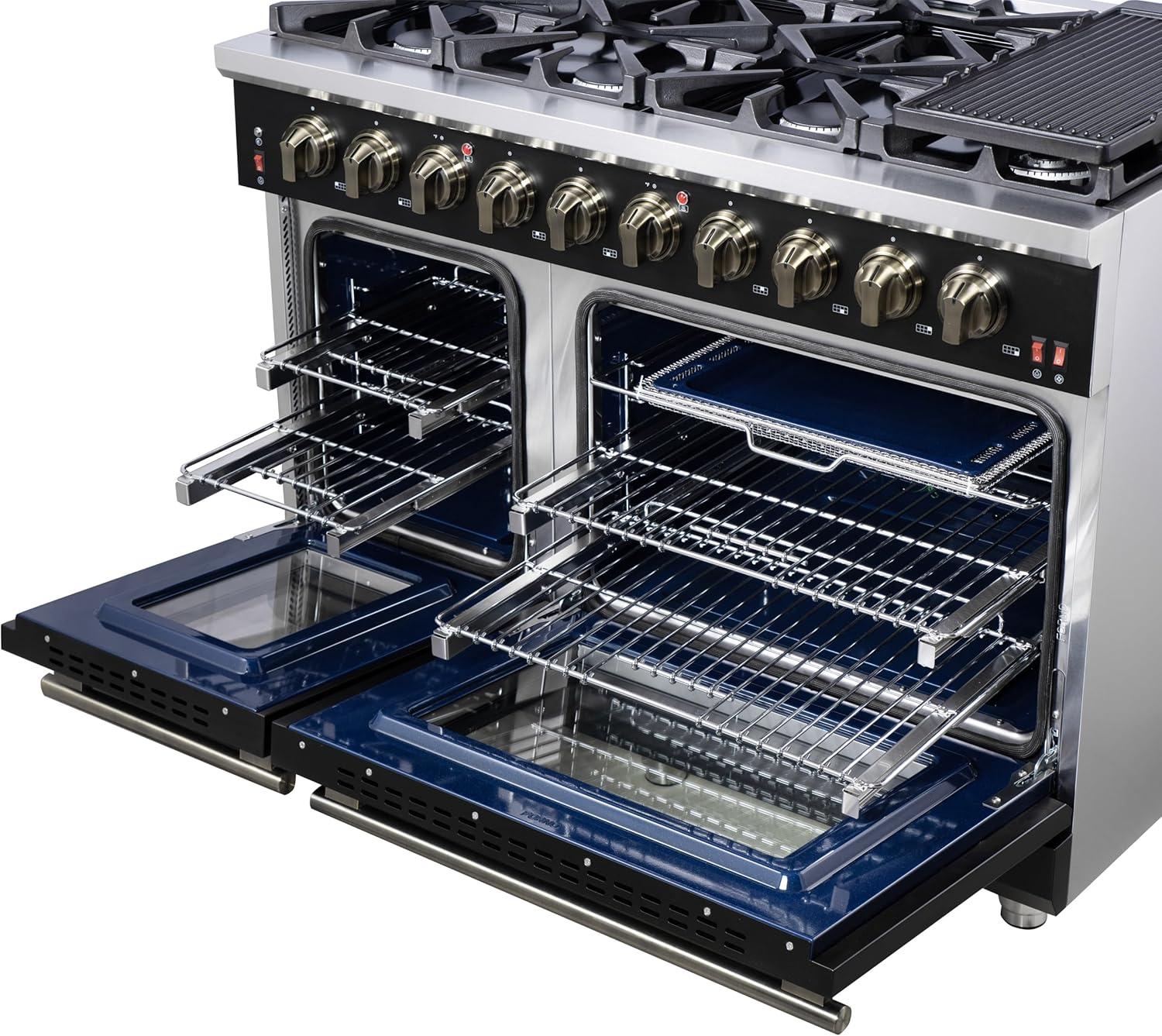 Professional Build & Timeless Design – Finished in black with antique brass details, featuring blue enamel ovens, smooth friction hinges, pro-style handles, and illuminated zinc-coated control knobs.
