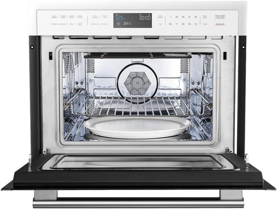 The Forno Oliena a stylish and practical 30-Inch 1.6 cu.ft. Black Microwave & Convection Oven. Its stainless-steel interior makes cleaning a breeze, while the easy-to-use controls let you seamlessly switch between microwave and oven functions. With 1,000 watts of cooking power, you can boil water in just 1 minute and 50 seconds using standard microwave settings. The glass touch controls and LED display make it simple to navigate through various microwave modes like defrost, popcorn, beverage, sensor cooking, or auto menu. In oven mode, enjoy the versatility of true convection at 1,700 watts, along with a broil function of 1,750 watts and a bake element of 600 watts perfect for cooking individual dishes without having to use the main oven. Plus, the Rapid Preheat mode reduces waiting times, ensuring your meals are ready faster. Experience convenience and efficiency with our multi-functional microwave and convection oven combo.
