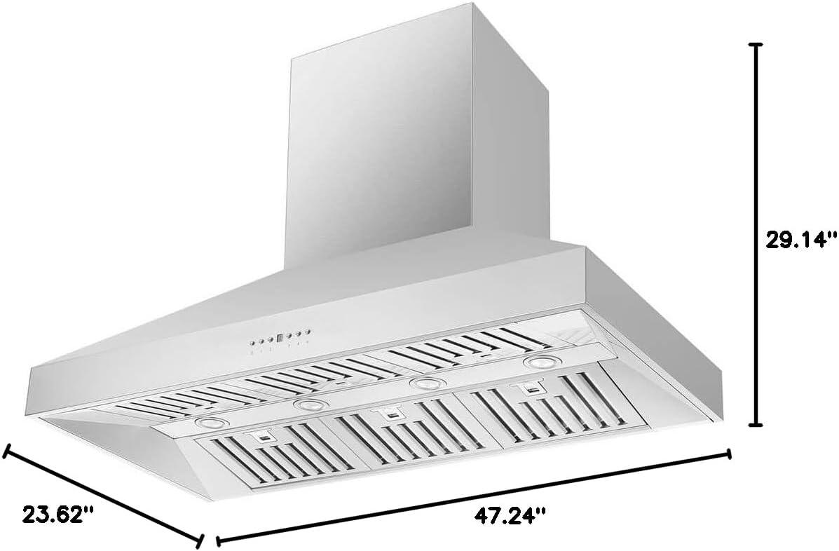 𝐕𝐄𝐍𝐓𝐈𝐋𝐀𝐓𝐈𝐎𝐍: This 48-inch wall mount range hood is equipped with two powerful energy-efficient motors with up to 600CFM X 2 Total 1200CFM ventilation. Our kitchen stove hood has dishwasher-safe stainless-steel baffle filters to capture smoke, gases, steam, and grease from the air