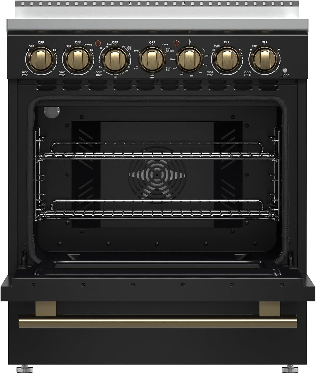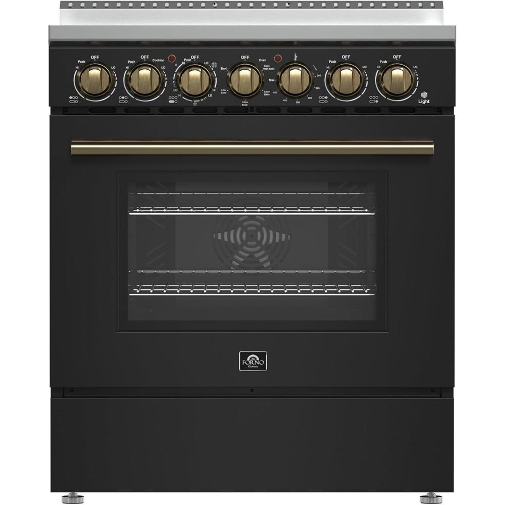 Elevate your kitchen with the Forno Paolo 30-Inch Freestanding Electric Range—where bold design meets powerful performance. Finished in a sleek black exterior, this modern range blends durability with style, making it a striking centerpiece for any contemporary kitchen. The smooth ceramic glass cooktop features five radiant heating elements with a combined output of 7,800 watts, including a 100-watt warming zone to keep food at the perfect serving temperature. Enjoy fast, even heat distribution across all cooking zones—ideal for everything from everyday meals to gourmet recipes. This range features a spacious 4.38 cu. ft. true convection oven, engineered for precision and efficiency. A 1,200-watt convection fan and 3,800 watts of baking and broiling power ensure rapid, even cooking results across all racks. The dual-element broiler delivers high-heat performance for perfect browning and searing. Designed with everyday convenience in mind, the hidden bake element prevents spills from burning onto the oven floor, reducing odors and making cleanup easier. Bright halogen lights and a large viewing window allow you to check progress without opening the oven door or releasing heat. Combining performance, precision, and a sophisticated black finish, the Forno Paolo electric range is a stylish and dependable upgrade for any home chef. Cook with confidence and enjoy a refined kitchen experience that supports your culinary creativity.