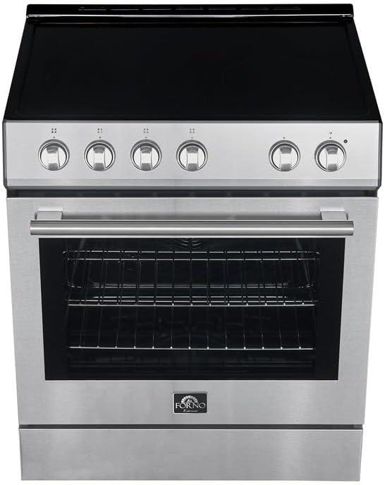 High-Performance Electric Range – FORNO Leonardo Espresso 30″ Stainless Steel Range FFSEL6012-30 with 5.0 cu. ft. convection oven (3,500W bake / 5,500W bake & broil), 4 radiant ceramic glass burners (7,100W total), stainless steel handles and finish, friction-resistant hinges, 2 oven racks, and hidden bake element for easy cleaning.