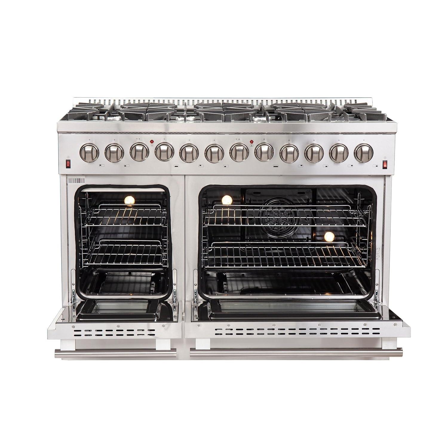 Professional Dual Fuel Cooking – FORNO Galiano 48″ Range FFSGS6156-48 with 8 sealed burners (107,000 BTU), 20K dual-ring burner, cast-iron grates, 6.58 cu.ft. double ovens (9,700W), true convection, 4 oven racks, griddle, LP conversion kit, and durable stainless-steel design with zinc-coated knobs.